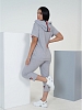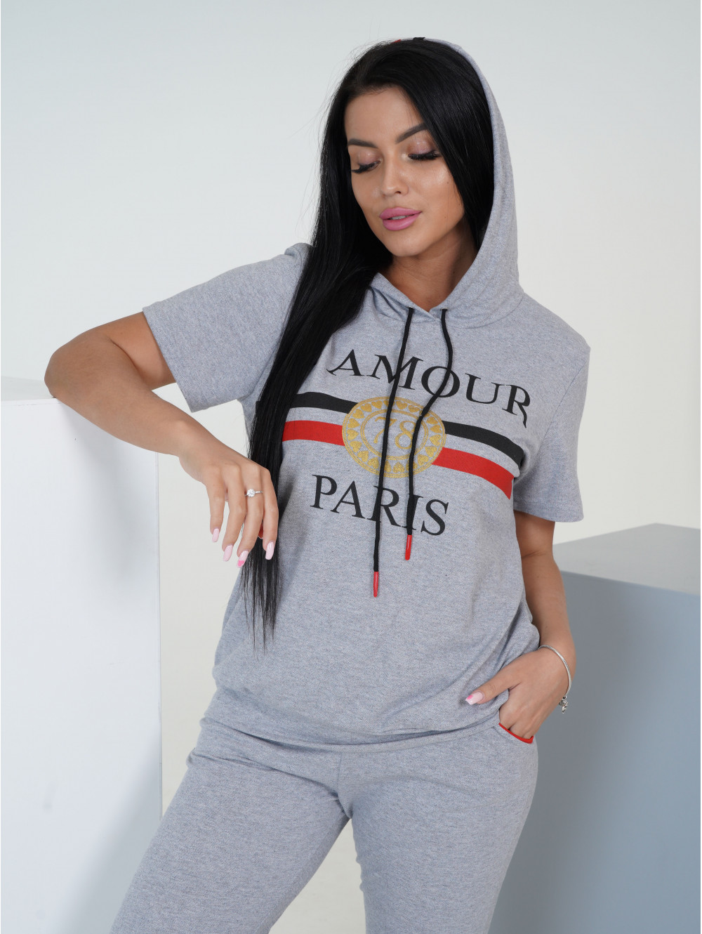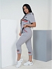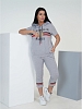 Удобный и легкий костюм Модус для спорта и отдыха, выполненный из ткани лакоста. Кофта с капюшоном, на поясе, короткий рукав с лампасами. По центру полочки стильная печать. Брюки в стиле капри, с карманами. Вход в карман обработан контрастной окантовкой, по низу брюк спереди изделия лампасы.