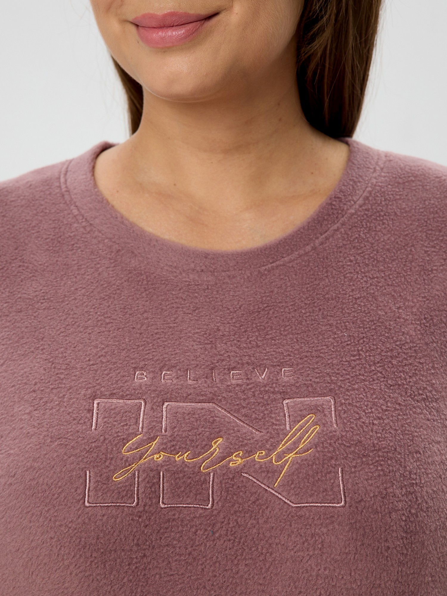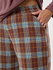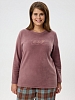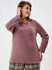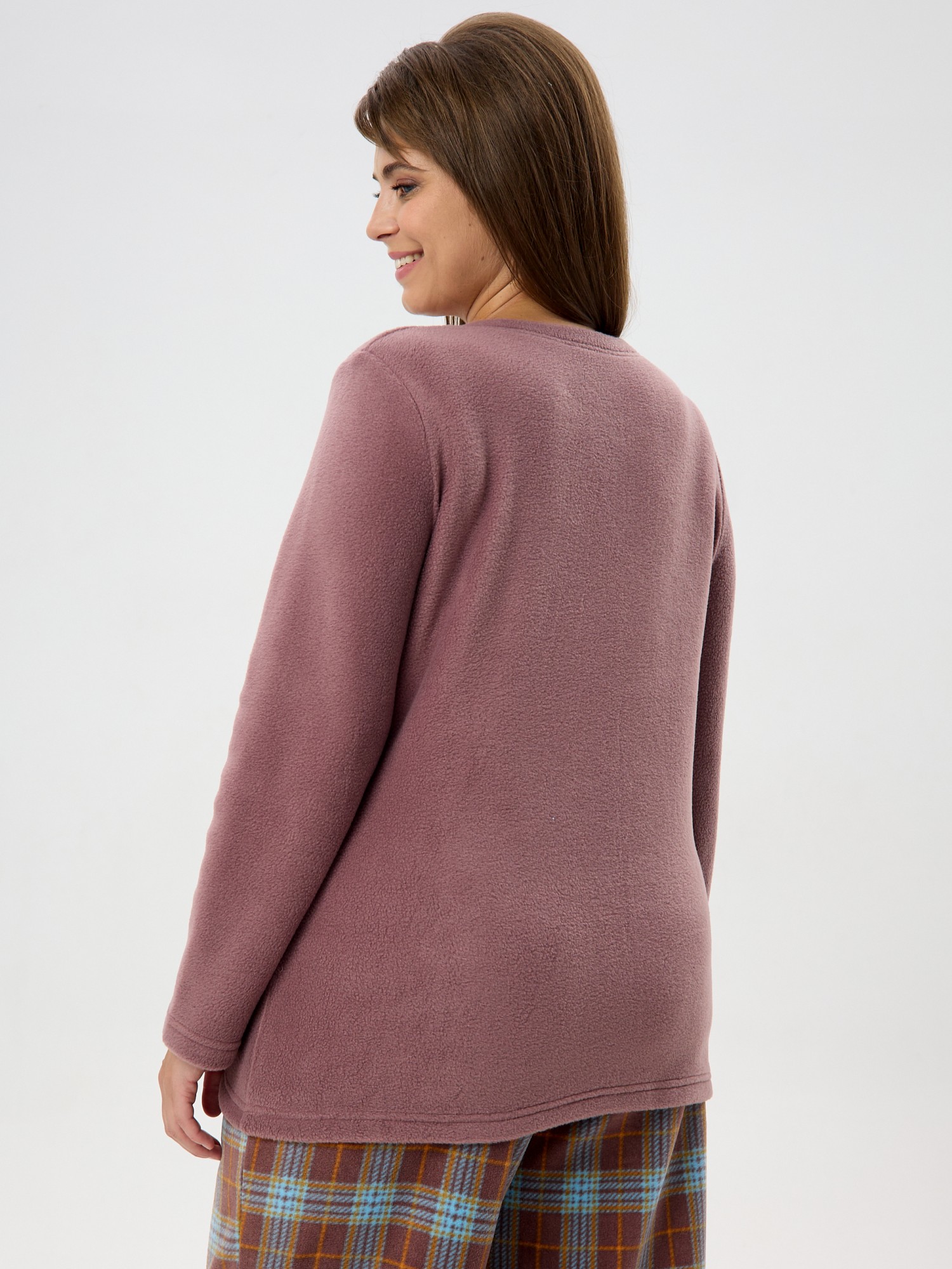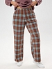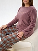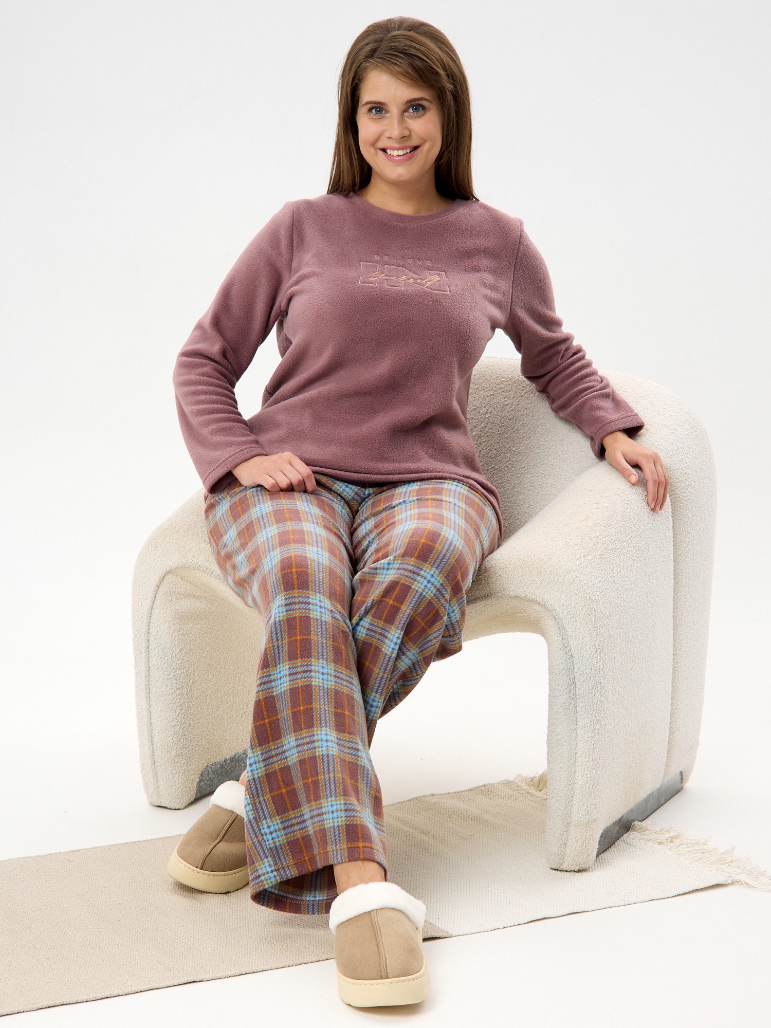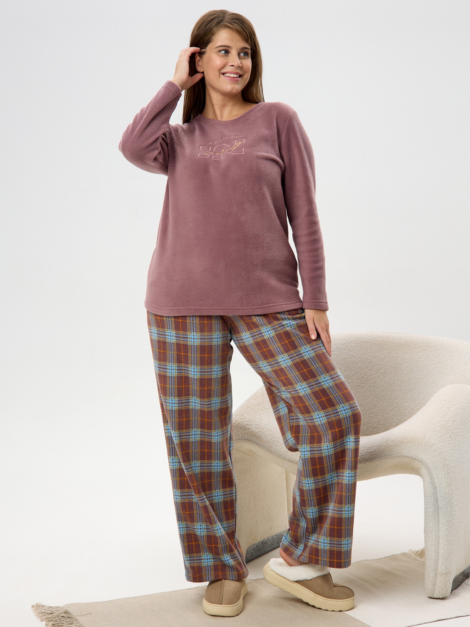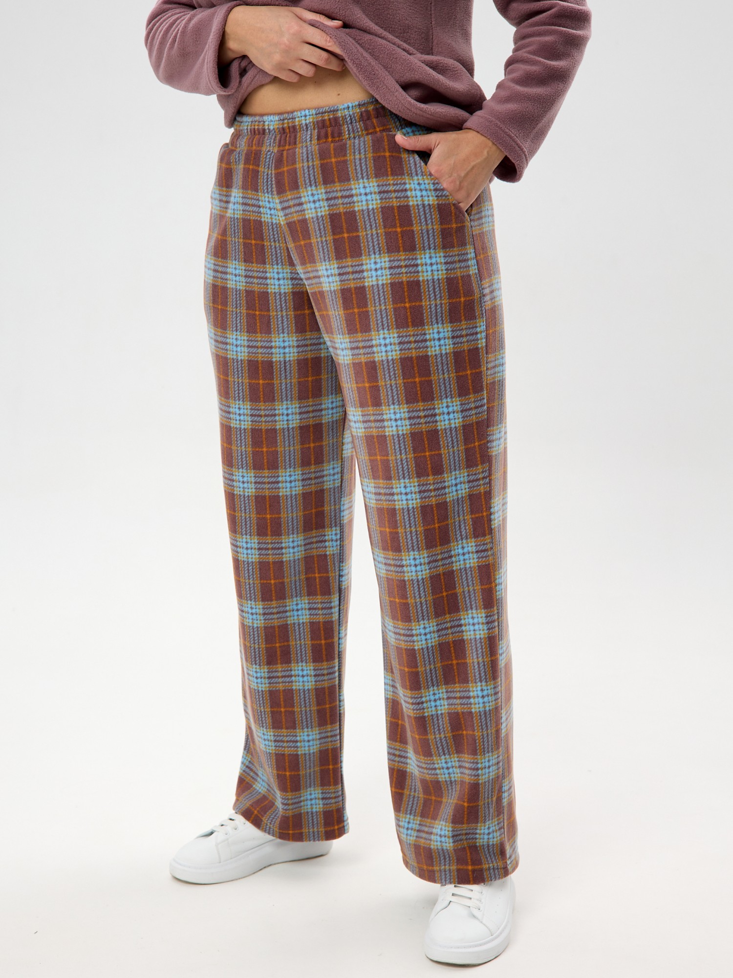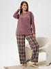 Костюм женский из трикотажного полотна «флис» в комбинации двух видов: с набивным рисунком «клетка» и гладкокрашеного в единой цветовой гамме, состоящий из джемпера и брюк.Джемпер - из гладкокрашенного полотна, классического покроя, с длинными втачными рукавами, горловиной овальной формы, обработанной втачной планкой и вышивкой в центре полочки.Брюки – из полотна с рисунком в клетку, длинные, свободные, на поясе с эластичной тесьмой внутри и карманами в боковых швах.