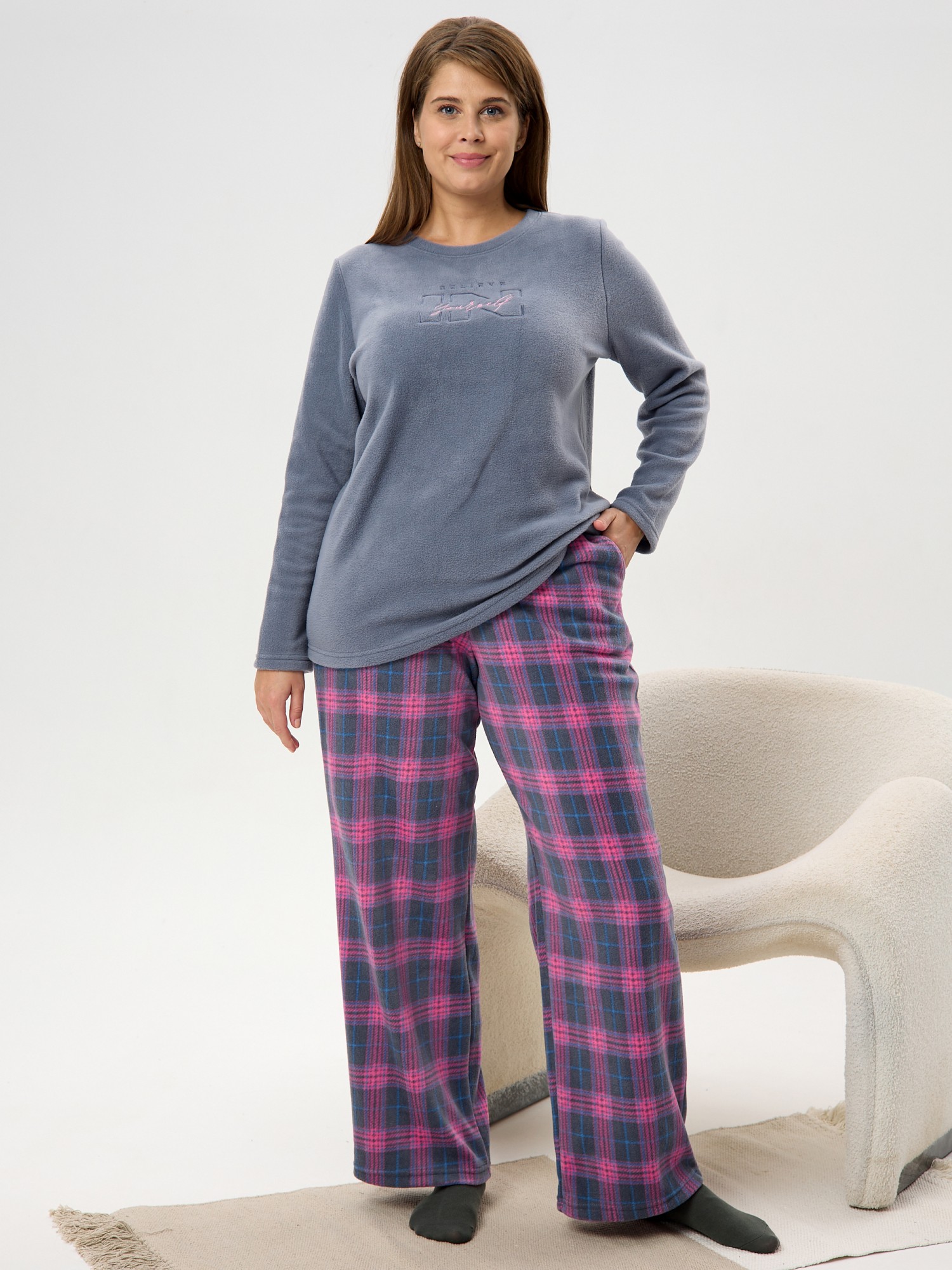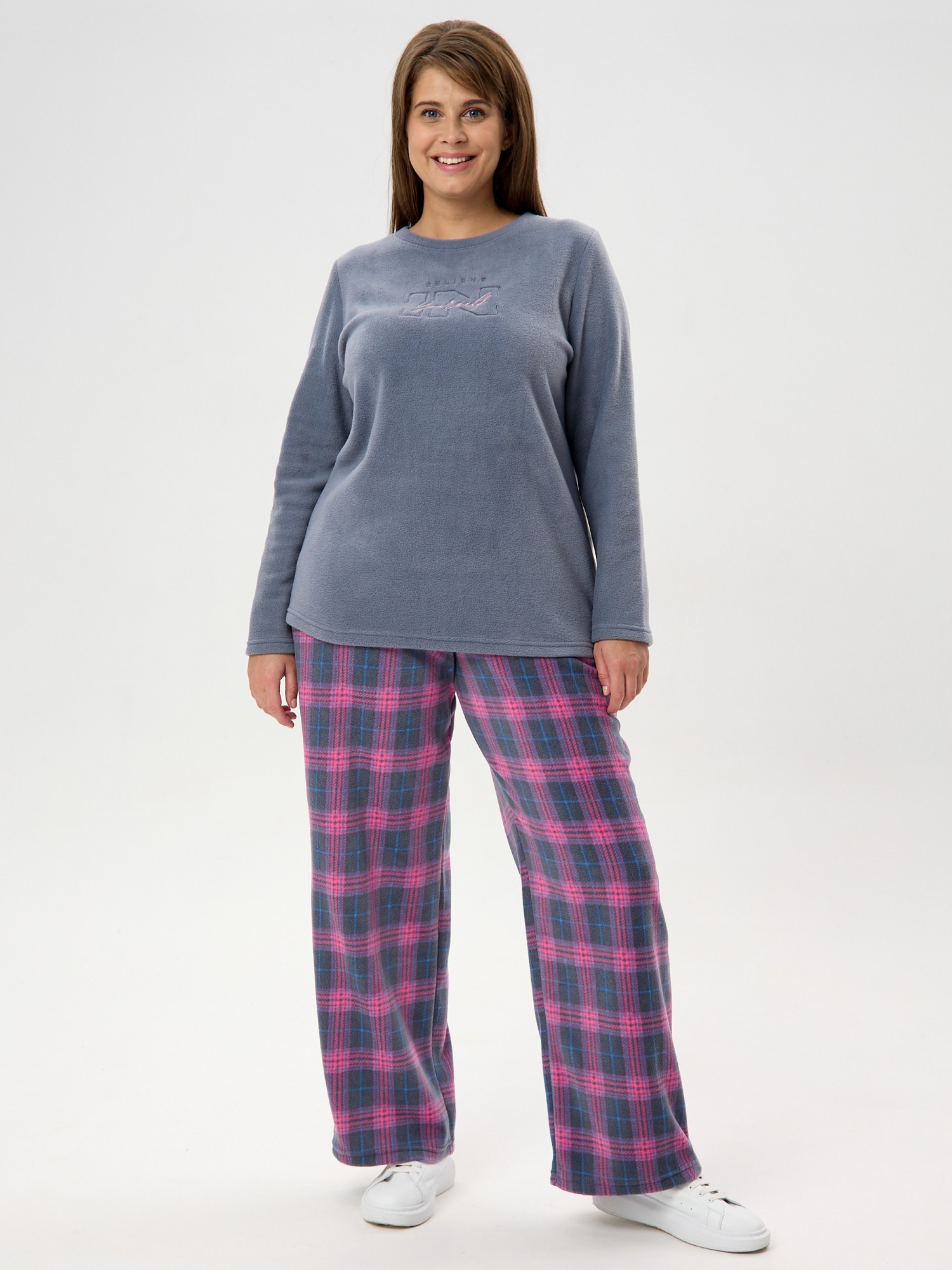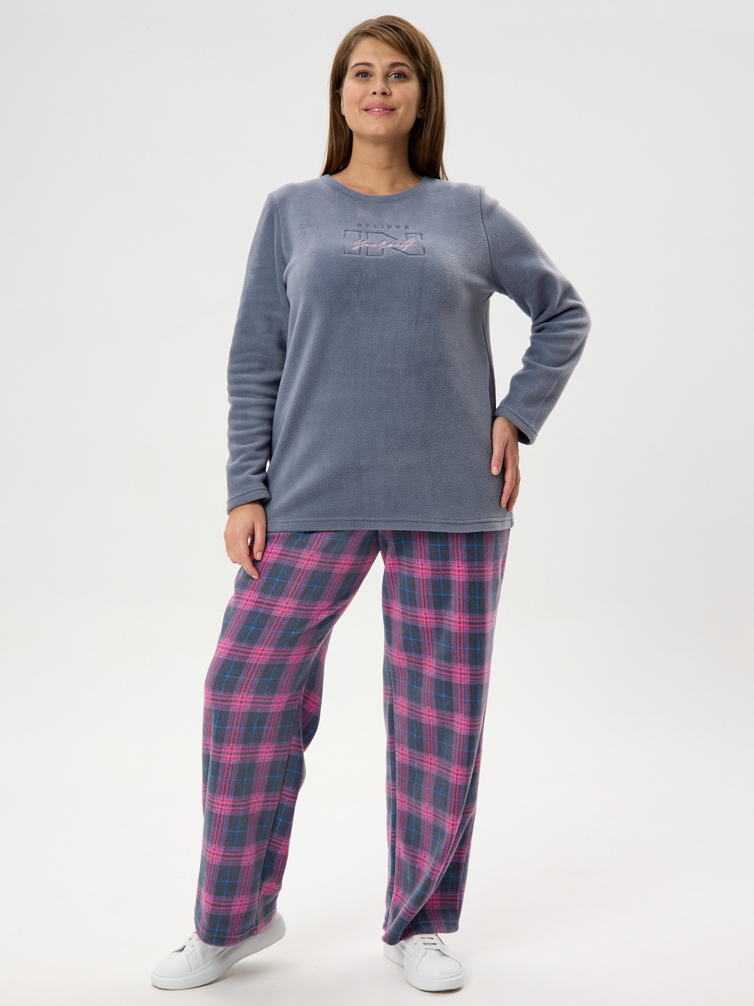Костюм женский из трикотажного полотна «флис» в комбинации двух видов: с набивным рисунком «клетка» и гладкокрашеного в единой цветовой гамме, состоящий из джемпера и брюк.Джемпер - из гладкокрашенного полотна, классического покроя, с длинными втачными рукавами, горловиной овальной формы, обработанной втачной планкой и вышивкой в центре полочки.Брюки – из полотна с рисунком в клетку, длинные, свободные, на поясе с эластичной тесьмой внутри и карманами в боковых швах.