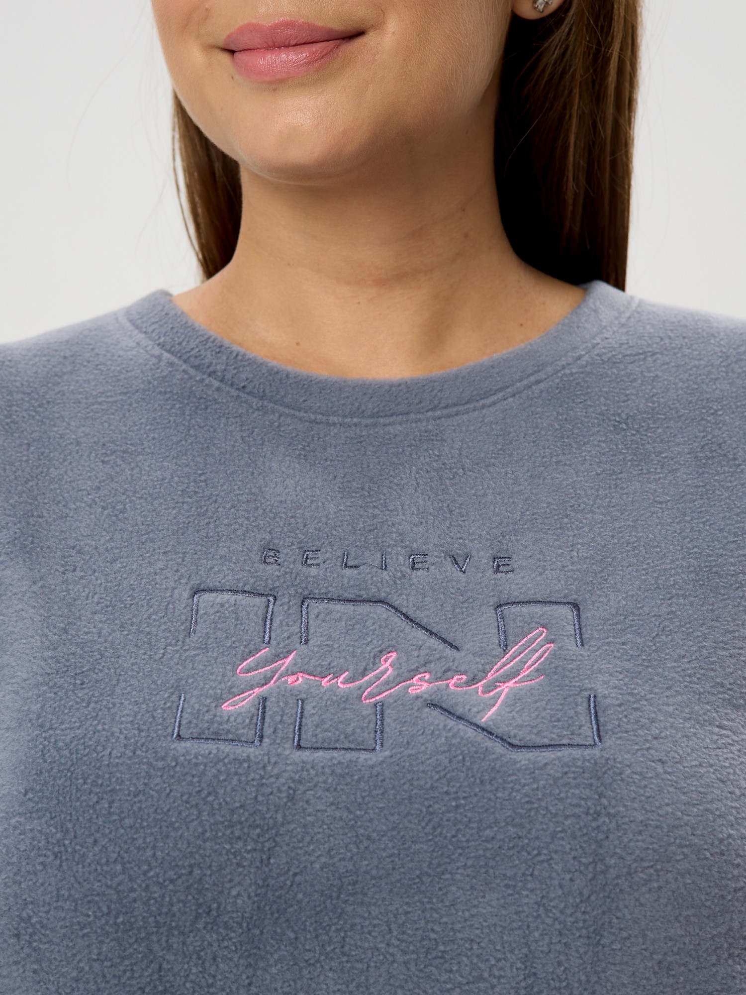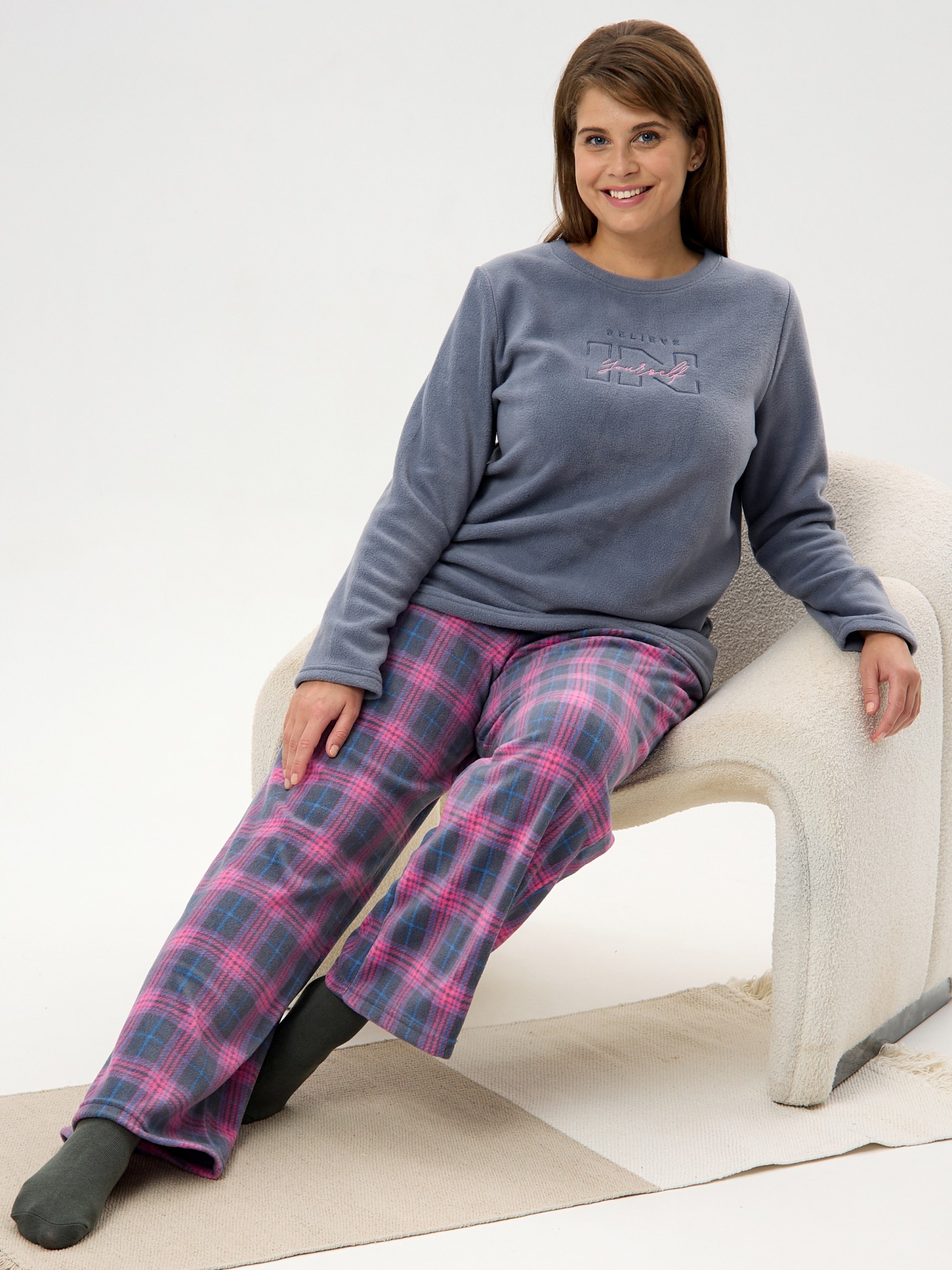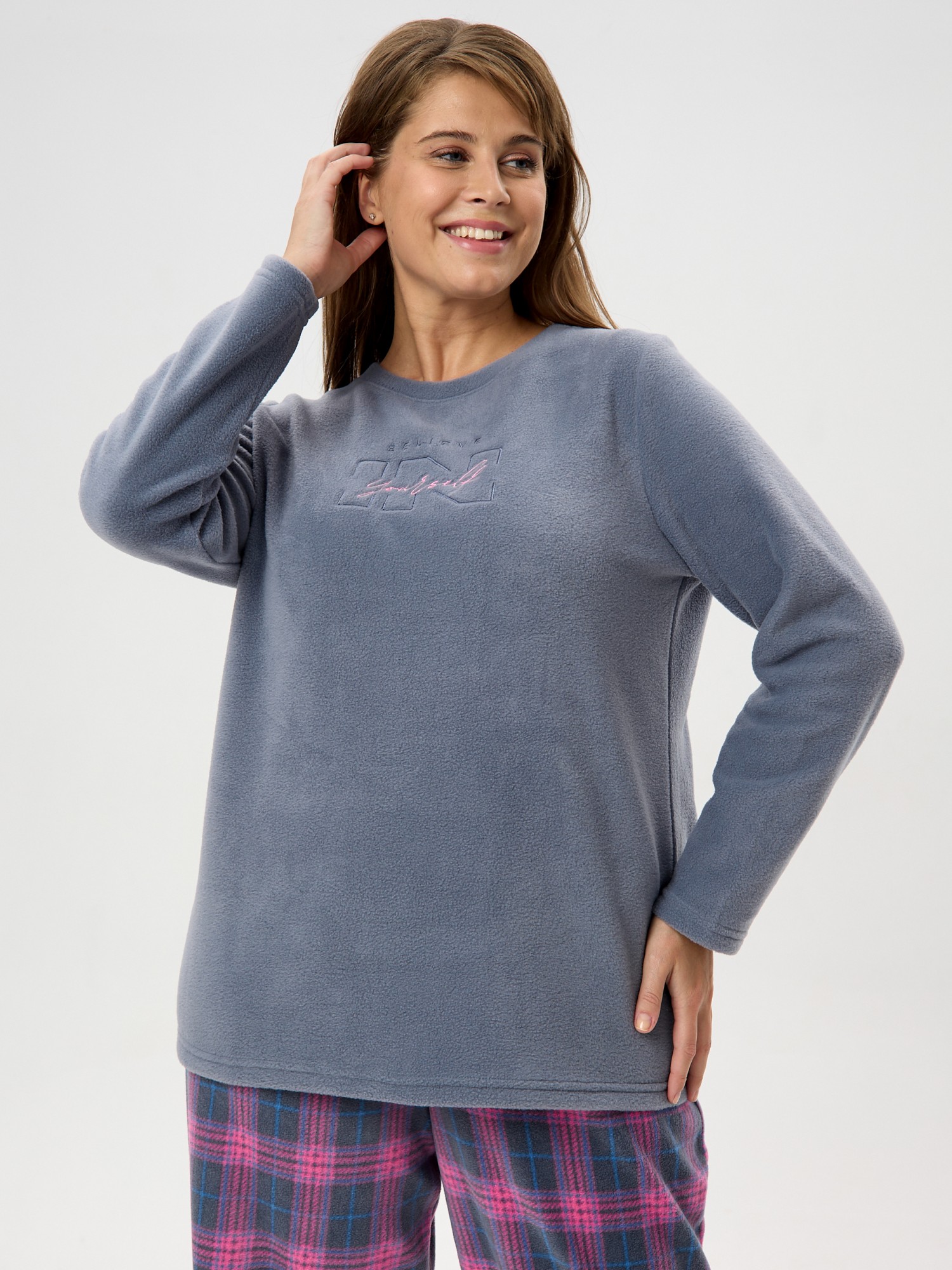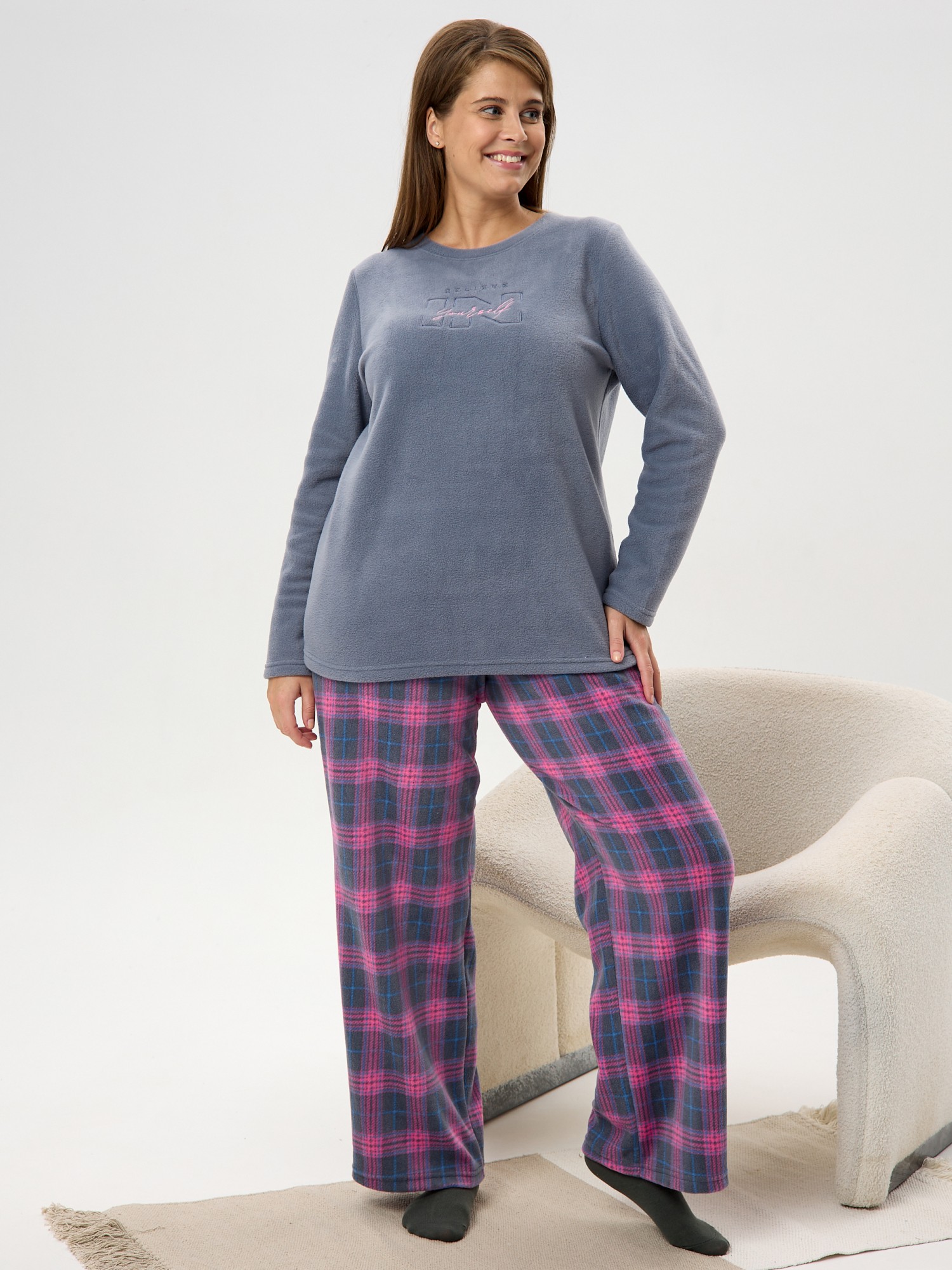 Костюм женский из трикотажного полотна «флис» в комбинации двух видов: с набивным рисунком «клетка» и гладкокрашеного в единой цветовой гамме, состоящий из джемпера и брюк.Джемпер - из гладкокрашенного полотна, классического покроя, с длинными втачными рукавами, горловиной овальной формы, обработанной втачной планкой и вышивкой в центре полочки.Брюки – из полотна с рисунком в клетку, длинные, свободные, на поясе с эластичной тесьмой внутри и карманами в боковых швах.