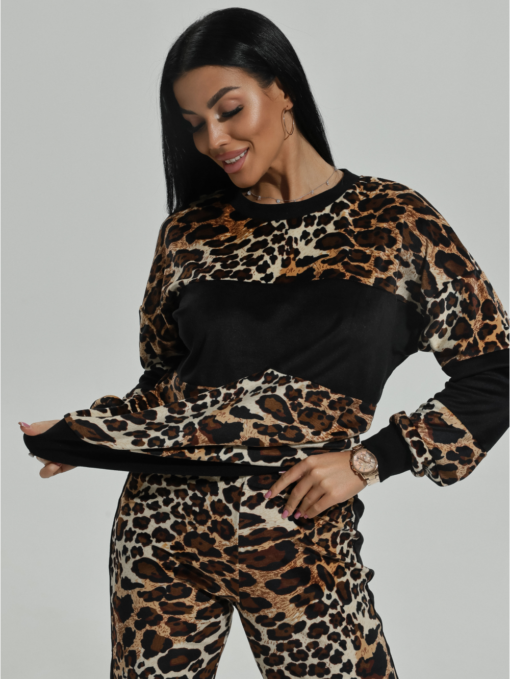 Костюм женский Намибия состоит из свитшота и брюк. Главным преимуществом велюра можно назвать его невероятную прочность. Он считается одним из самых долговечных материалов, который легко переносит различные воздействия. К тому же, изделия из этой ткани абсолютно не мнутся, а значит, что их не нужно гладить. Рукава и низ брюк на манжетах.