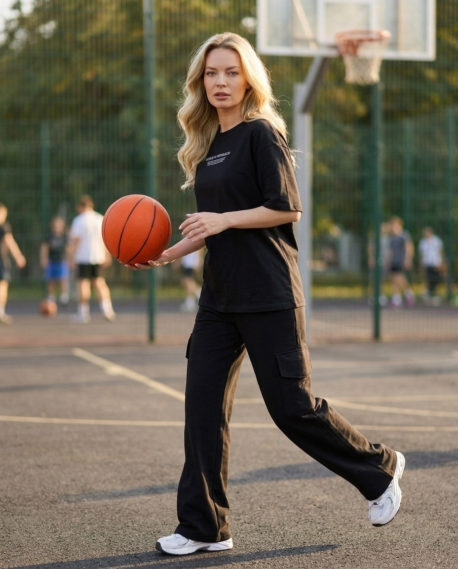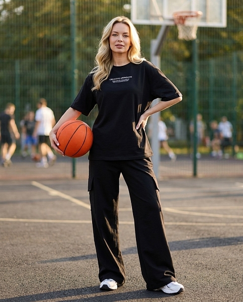 ВНИМАНИЕ! Костюм расчитан на рост 165 см. Костюм молодежный из трикотажного полотна «футер - двунитка», состоящий из футболки и брюк. Футболка - с короткими втачными рукавами, горловиной овальной формы, обработанной втачной планкой и принтом на полочке, выполненным в технике «шелкографии». Брюки-карго – длинные, свободные, на притачном поясе с эластичной тесьмой внутри, карманами в боковых швах. Дополнительные накладные карманы со складкой, закрывающиеся клапаном, располагаются по бокам в области бедер. Низ брюк обработан подгибкой с вложением эластичной тесьмы и регулируется по длине с помощью фиксатора.