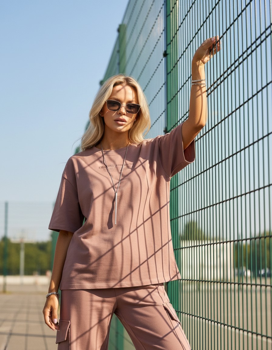 ВНИМАНИЕ! Костюм рассчитан на рост 175 см. Костюм молодежный из трикотажного полотна «футер - двунитка», состоящий из футболки и брюк. Футболка - с короткими втачными рукавами, горловиной овальной формы, обработанной втачной планкой и принтом на полочке, выполненным в технике «шелкографии». Брюки-карго – длинные, свободные, на притачном поясе с эластичной тесьмой внутри, карманами в боковых швах. Дополнительные накладные карманы со складкой, закрывающиеся клапаном, располагаются по бокам в области бедер. Низ брюк обработан подгибкой с вложением эластичной тесьмы и регулируется по длине с помощью фиксатора.