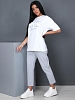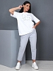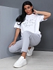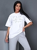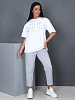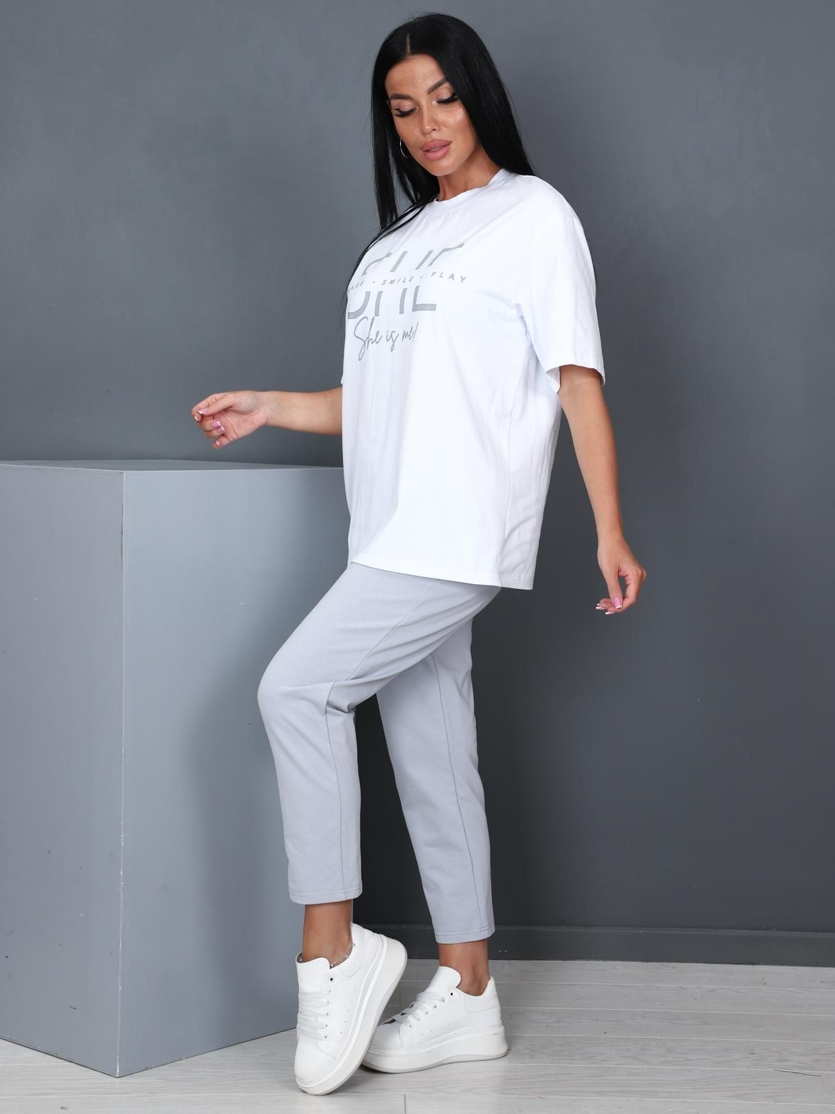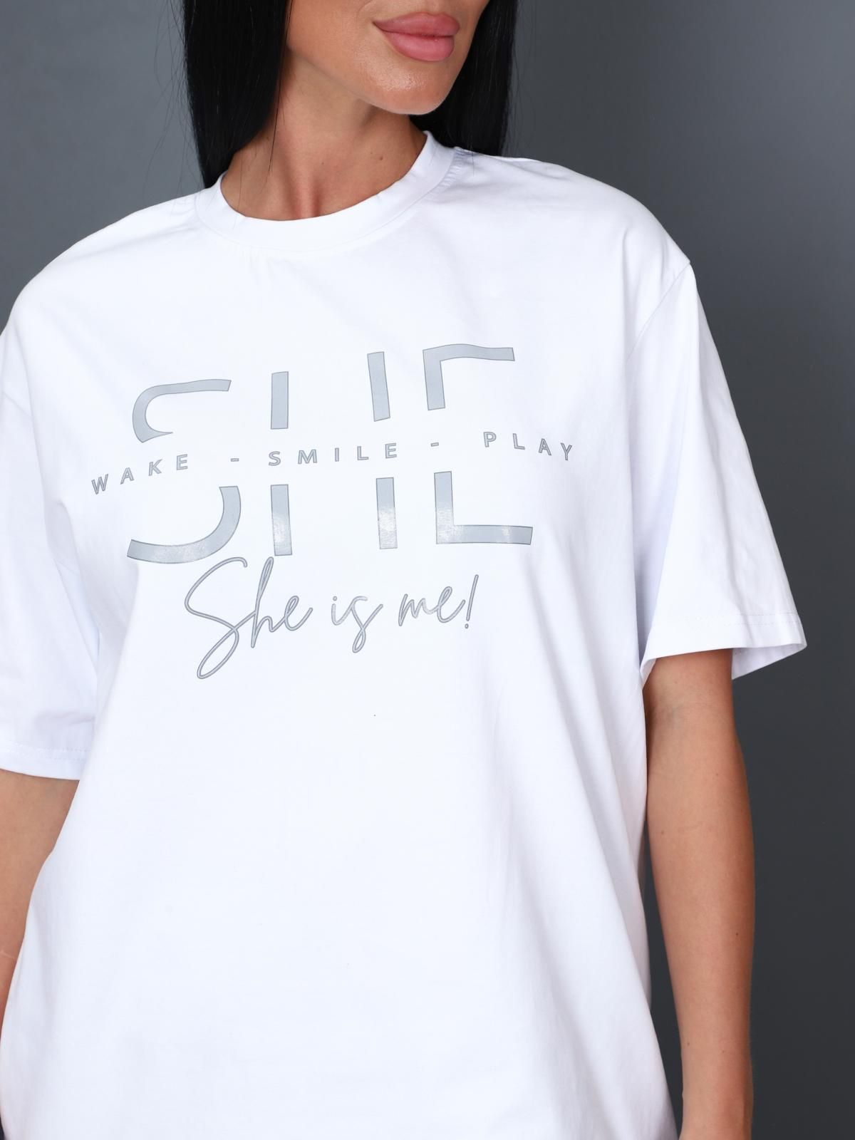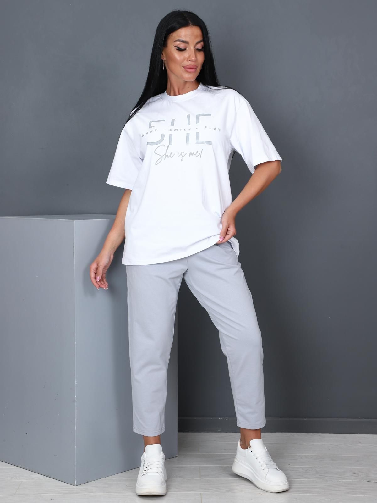 Стильный и удобный костюм, состоящий из футболки с надписью «She is me» и брюк. Идеально подходит для повседневного стиля, прогулок или неформальных встреч.