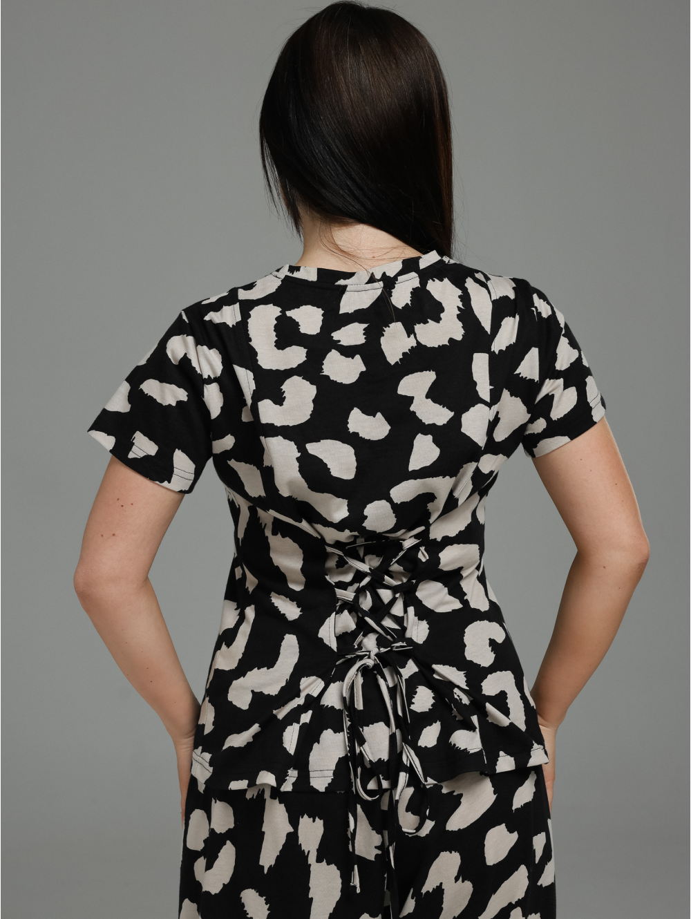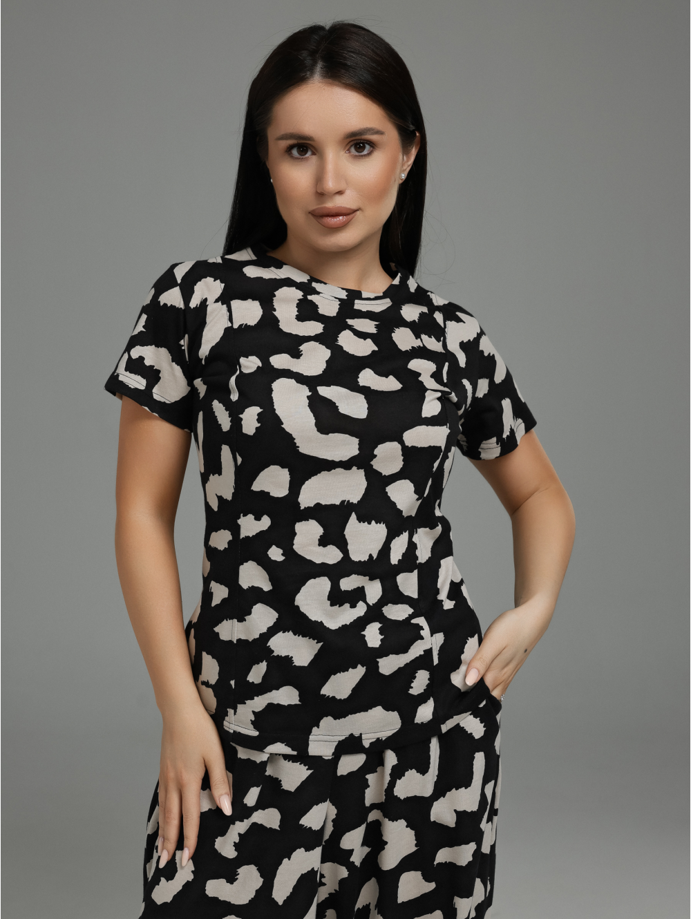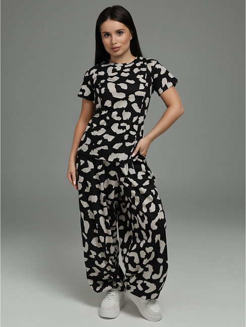 Женский костюм-двойка (футболка + брюки) с регулируемой деталью на спинке.Футболка:Силуэт: Приталенный, подчёркивает фигуру, создаёт женственный образ.Рукав: Короткий, классический.Ключевая деталь на спинке: В рельефные швы или рассечки спинки вшиты по 3 петли из окантовки с каждой стороны (всего 6 петель). Через эти петли продет регулировочный шнур, который позволяет:Создавать мягкую драпировку на спине.Регулировать степень прилегания в области талии.Менять силуэт футболки на ваш вкус.Брюки:Силуэт: Свободный, прямой или слегка расширенный — максимальный комфорт и модный расслабленный вид.Карманы: Функциональные прорезные карманы в боковых швах передних половинок — удобно для мелочей.Низ брюк: Стянут эластичной резинкой (кулиской). Это создаёт эффект «фонарика» или мягкой сборки, добавляет динамикусилуэту и позволяет регулировать длину и посадку по желанию.Общее впечатление:Продуманный костюм, где простая на первый взгляд футболка раскрывается неожиданной деталью на спинке,а брюки сочетают свободу кроя с практичностью (карманы, регулируемый низ).Идеальный выбор для создания повседневных и полуспортивных образов.