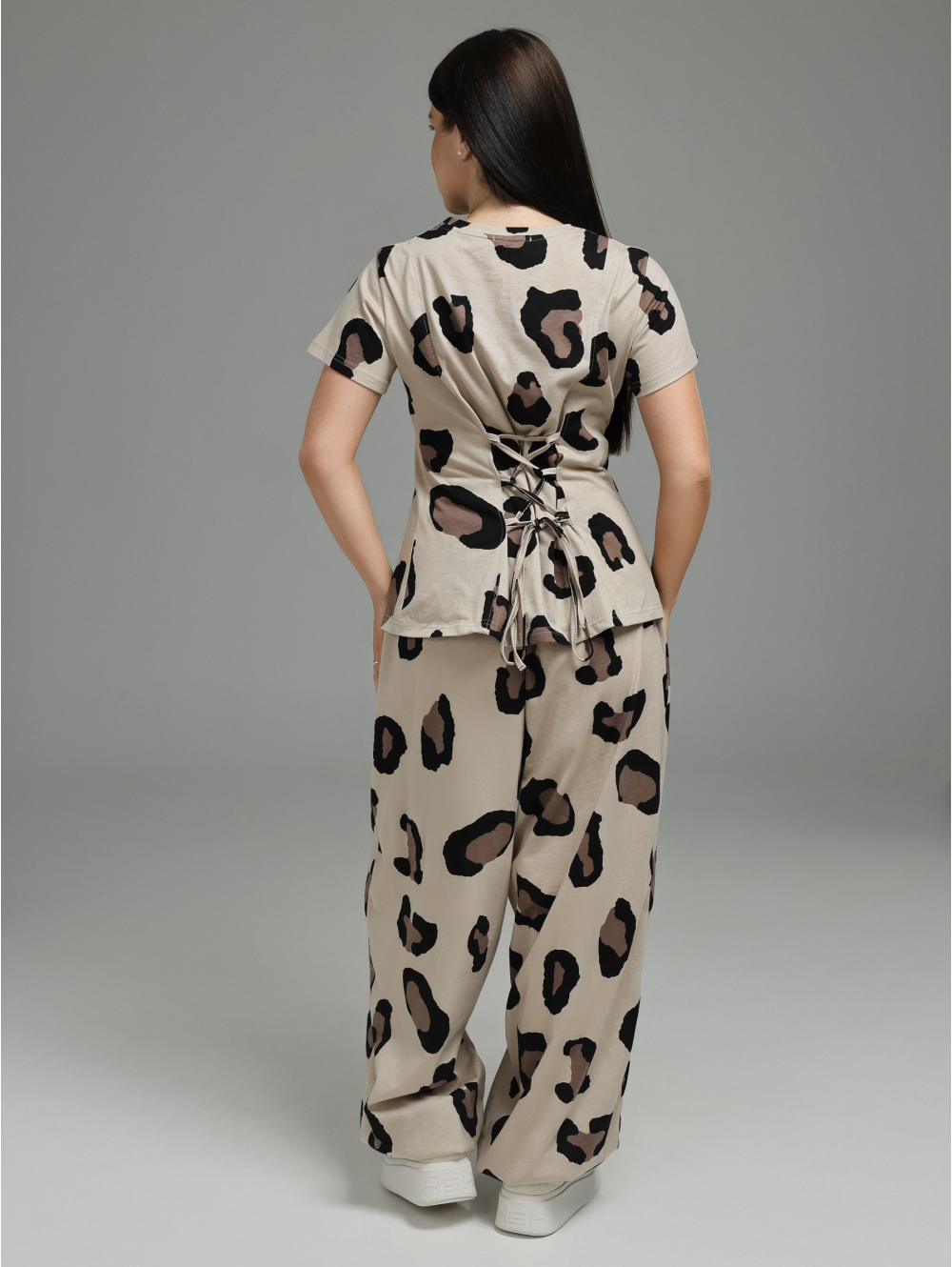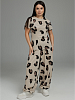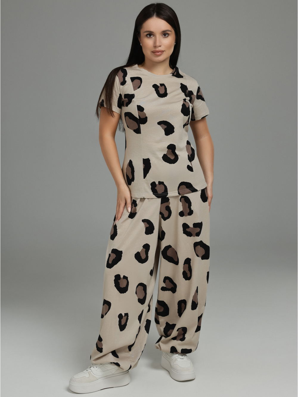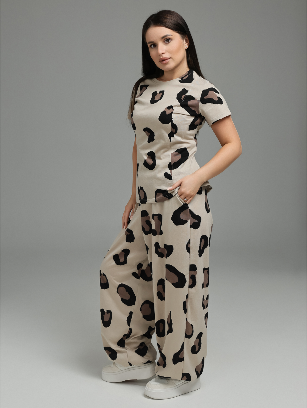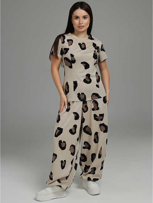 Женский костюм-двойка (футболка + брюки) с регулируемой деталью на спинке.Футболка:Силуэт: Приталенный, подчёркивает фигуру, создаёт женственный образ.Рукав: Короткий, классический.Ключевая деталь на спинке: В рельефные швы или рассечки спинки вшиты по 3 петли из окантовки с каждой стороны (всего 6 петель). Через эти петли продет регулировочный шнур, который позволяет:Создавать мягкую драпировку на спине.Регулировать степень прилегания в области талии.Менять силуэт футболки на ваш вкус.Брюки:Силуэт: Свободный, прямой или слегка расширенный — максимальный комфорт и модный расслабленный вид.Карманы: Функциональные прорезные карманы в боковых швах передних половинок — удобно для мелочей.Низ брюк: Стянут эластичной резинкой (кулиской). Это создаёт эффект «фонарика» или мягкой сборки, добавляет динамикусилуэту и позволяет регулировать длину и посадку по желанию.Общее впечатление:Продуманный костюм, где простая на первый взгляд футболка раскрывается неожиданной деталью на спинке,а брюки сочетают свободу кроя с практичностью (карманы, регулируемый низ).Идеальный выбор для создания повседневных и полуспортивных образов.
