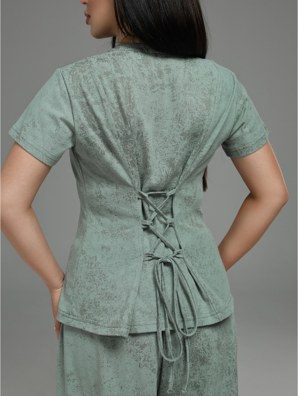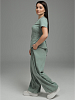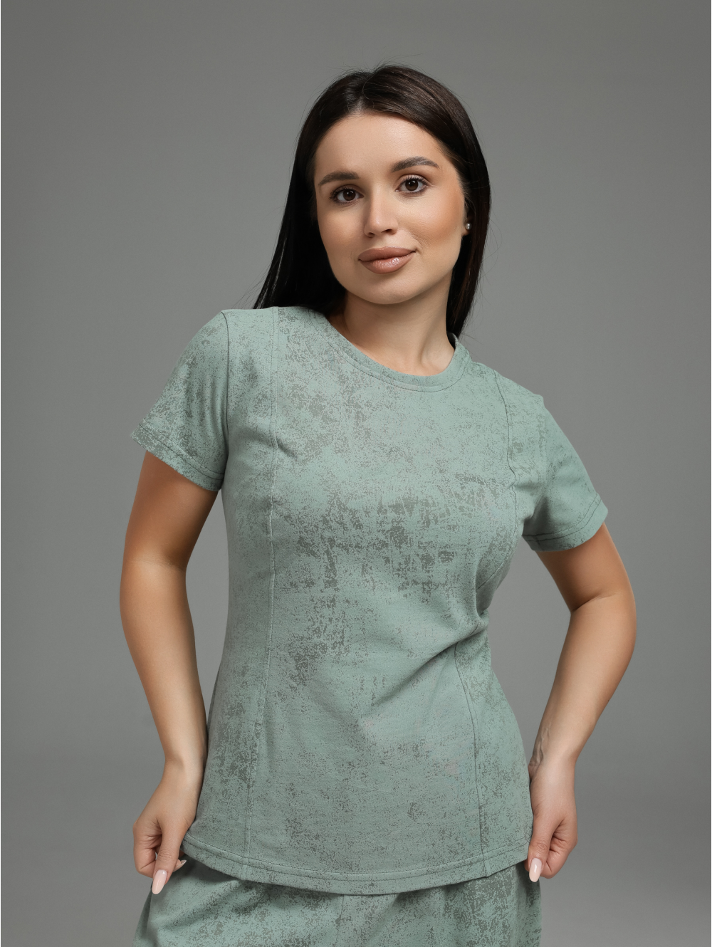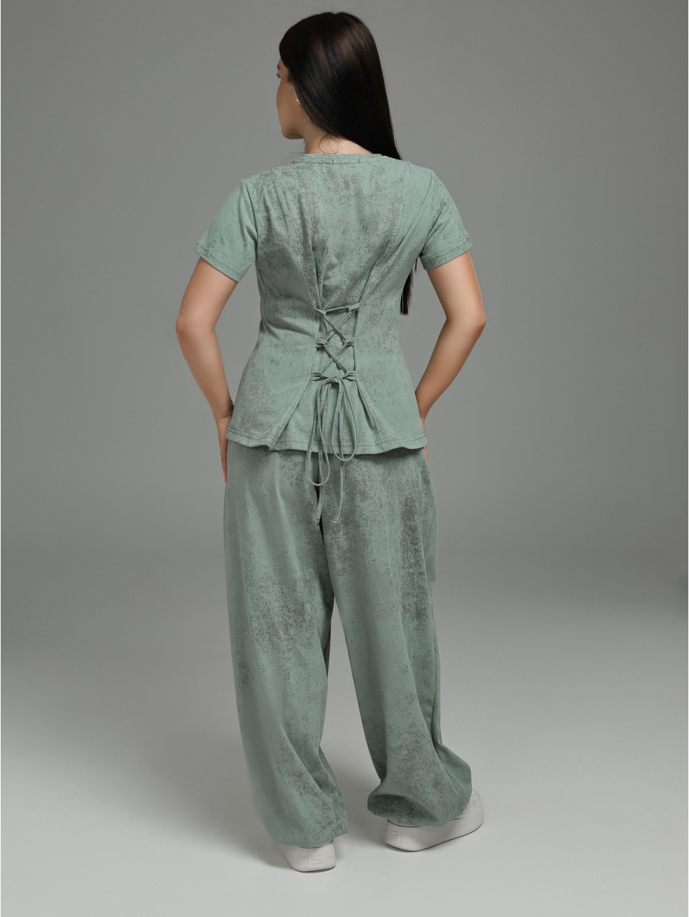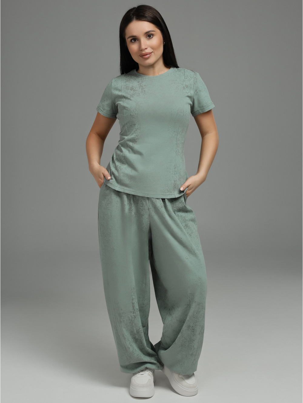 Женский костюм-двойка (футболка + брюки) с регулируемой деталью на спинке.Футболка:Силуэт: Приталенный, подчёркивает фигуру, создаёт женственный образ.Рукав: Короткий, классический.Ключевая деталь на спинке: В рельефные швы или рассечки спинки вшиты по 3 петли из окантовки с каждой стороны (всего 6 петель). Через эти петли продет регулировочный шнур, который позволяет:Создавать мягкую драпировку на спине.Регулировать степень прилегания в области талии.Менять силуэт футболки на ваш вкус.Брюки:Силуэт: Свободный, прямой или слегка расширенный — максимальный комфорт и модный расслабленный вид.Карманы: Функциональные прорезные карманы в боковых швах передних половинок — удобно для мелочей.Низ брюк: Стянут эластичной резинкой (кулиской). Это создаёт эффект «фонарика» или мягкой сборки, добавляет динамикусилуэту и позволяет регулировать длину и посадку по желанию.Общее впечатление:Продуманный костюм, где простая на первый взгляд футболка раскрывается неожиданной деталью на спинке,а брюки сочетают свободу кроя с практичностью (карманы, регулируемый низ).Идеальный выбор для создания повседневных и полуспортивных образов.
