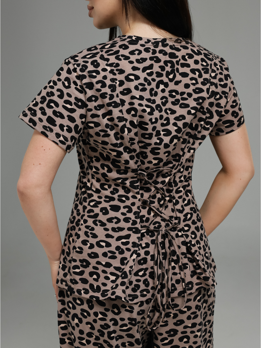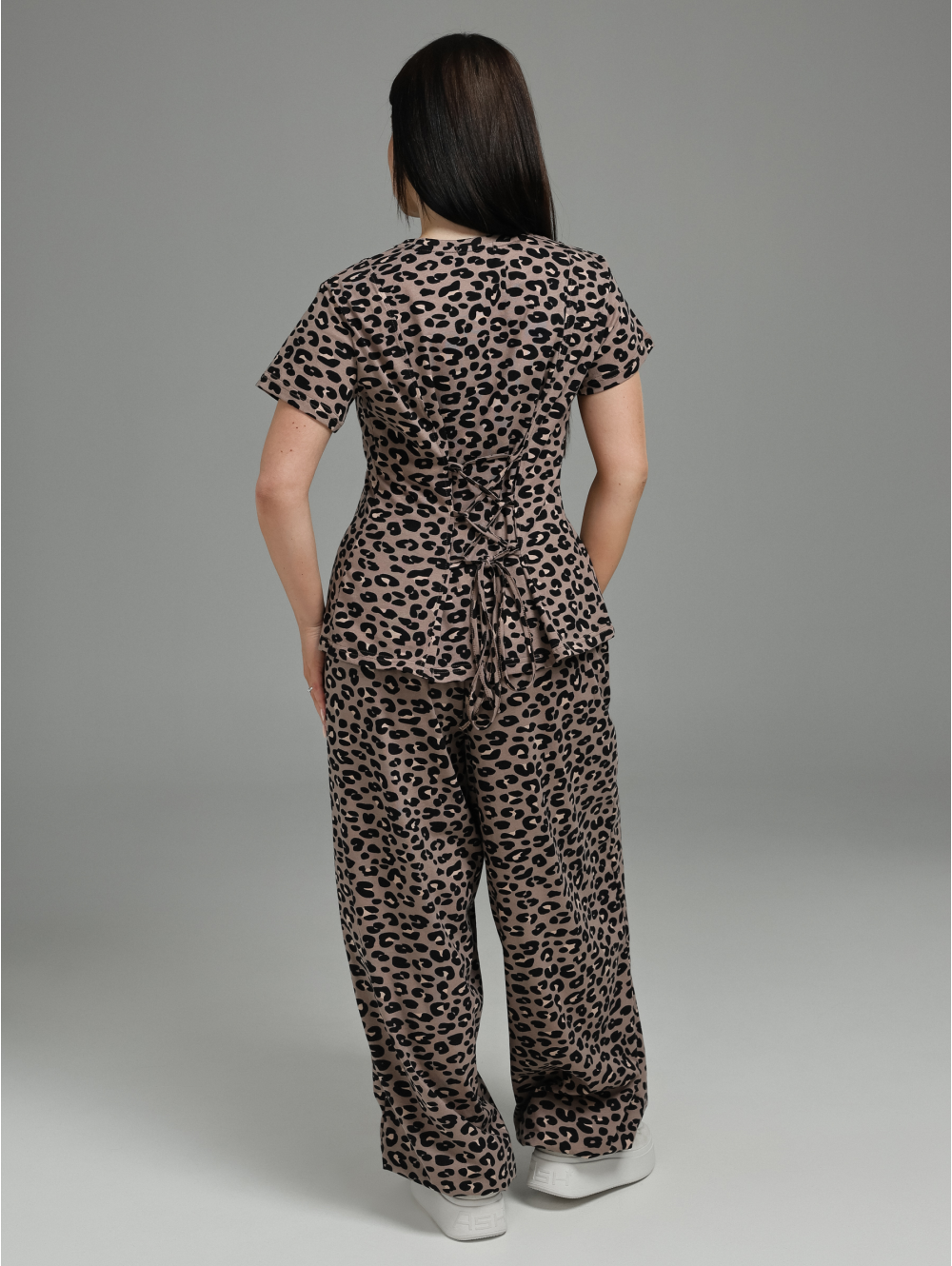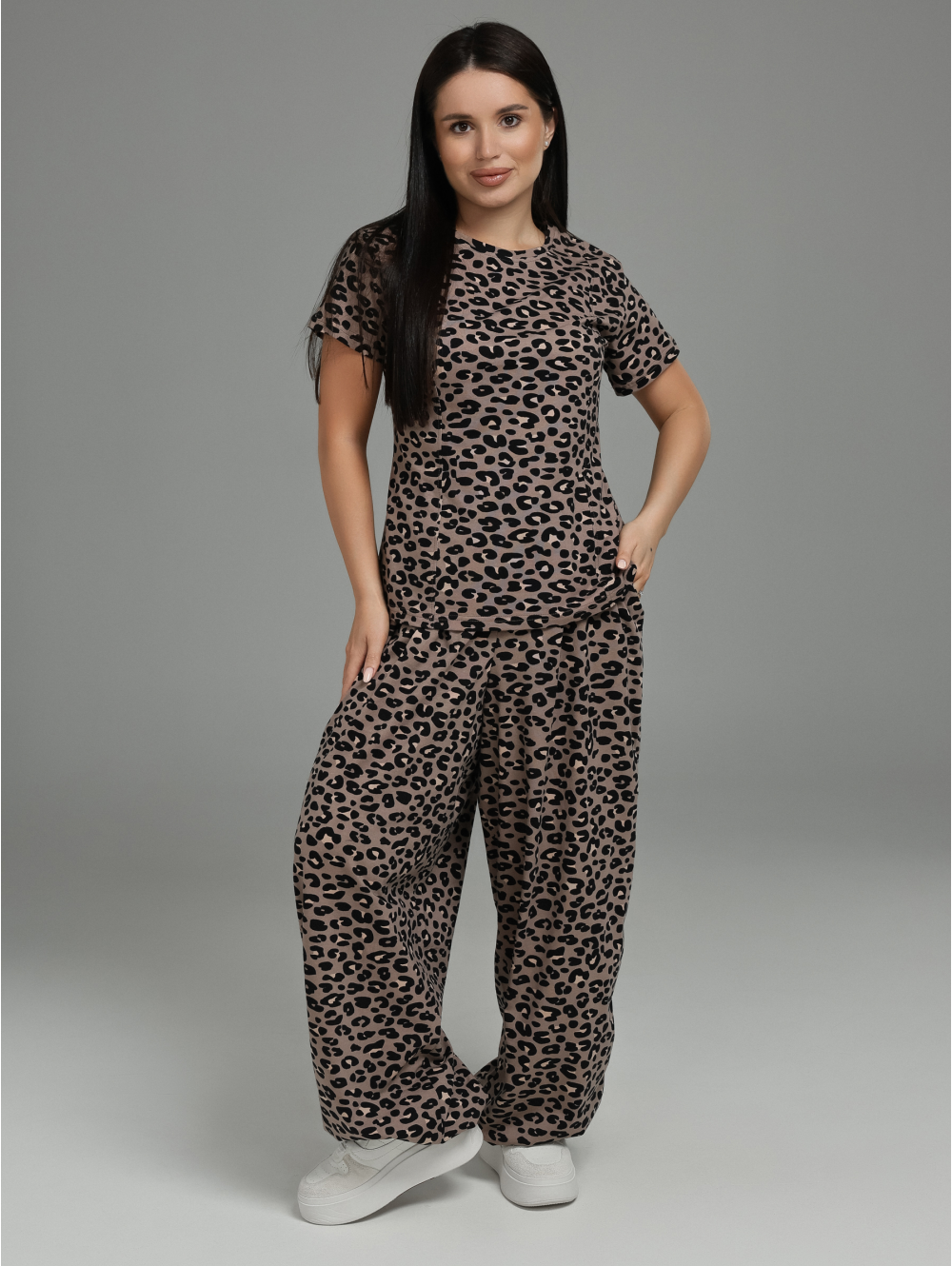 Женский костюм-двойка (футболка + брюки) с регулируемой деталью на спинке.Футболка:Силуэт: Приталенный, подчёркивает фигуру, создаёт женственный образ.Рукав: Короткий, классический.Ключевая деталь на спинке: В рельефные швы или рассечки спинки вшиты по 3 петли из окантовки с каждой стороны (всего 6 петель). Через эти петли продет регулировочный шнур, который позволяет:Создавать мягкую драпировку на спине.Регулировать степень прилегания в области талии.Менять силуэт футболки на ваш вкус.Брюки:Силуэт: Свободный, прямой или слегка расширенный — максимальный комфорт и модный расслабленный вид.Карманы: Функциональные прорезные карманы в боковых швах передних половинок — удобно для мелочей.Низ брюк: Стянут эластичной резинкой (кулиской). Это создаёт эффект «фонарика» или мягкой сборки, добавляет динамику силуэту и позволяет регулировать длину и посадку по желанию.Общее впечатление:Продуманный костюм, где простая на первый взгляд футболка раскрывается неожиданной деталью на спинке, а брюки сочетают свободу кроя с практичностью (карманы, регулируемый низ). Идеальный выбор для создания повседневных и полуспортивных образов.