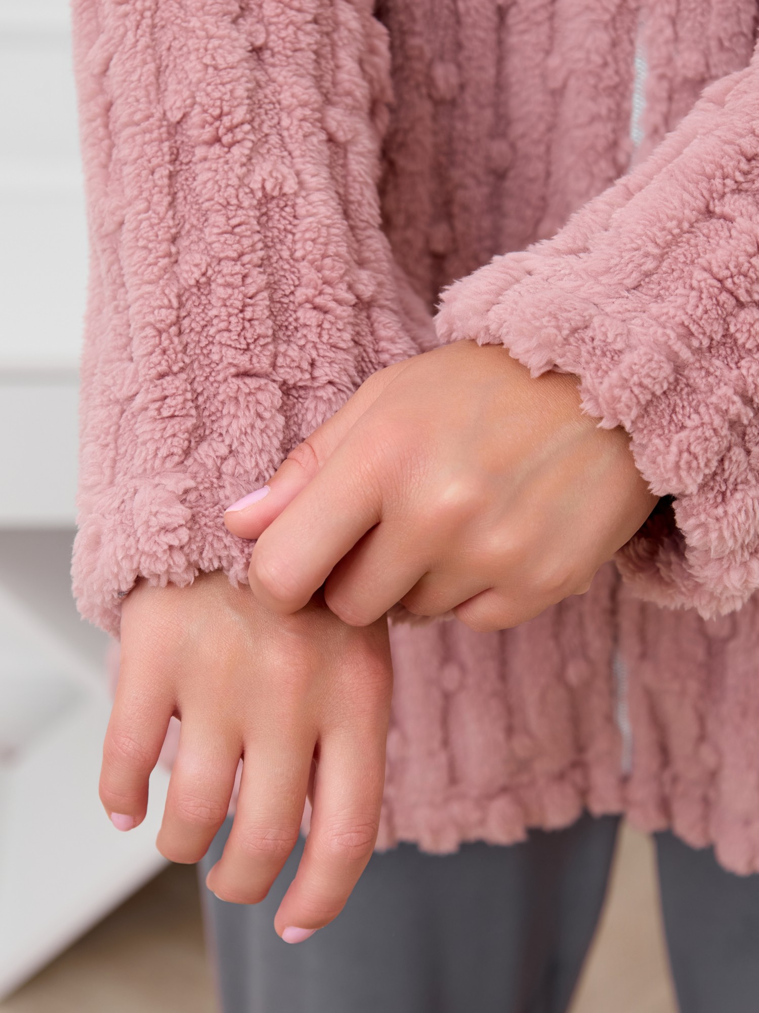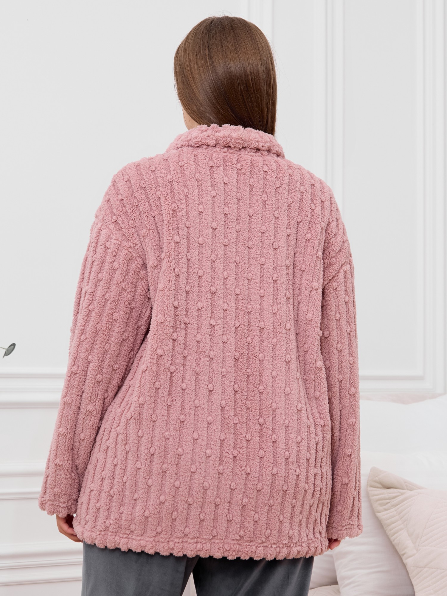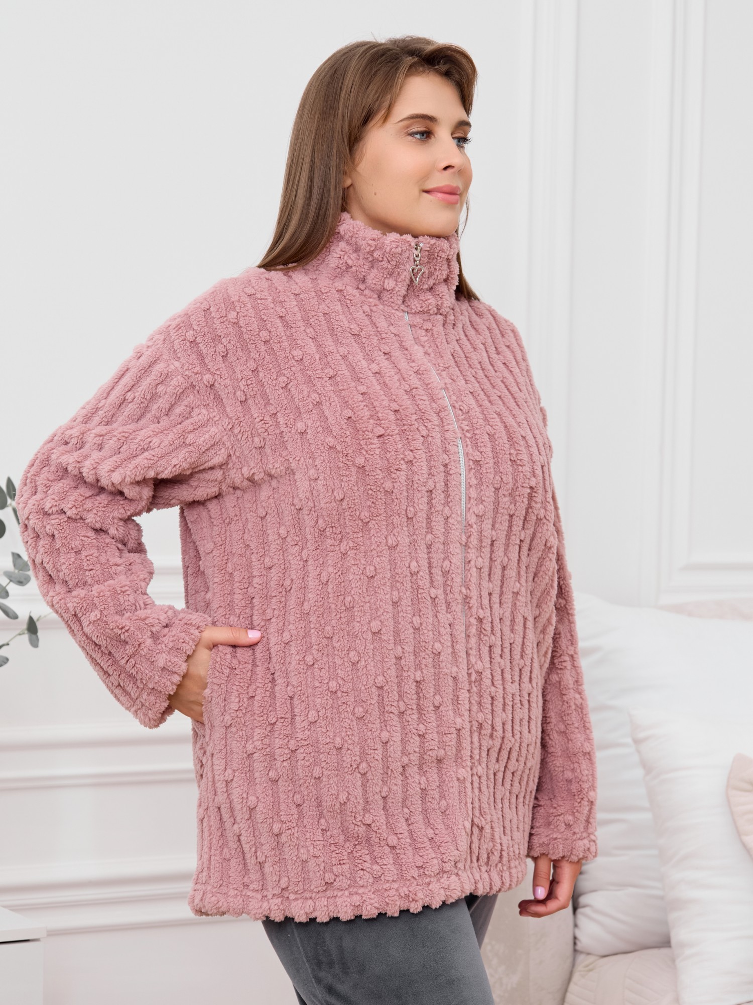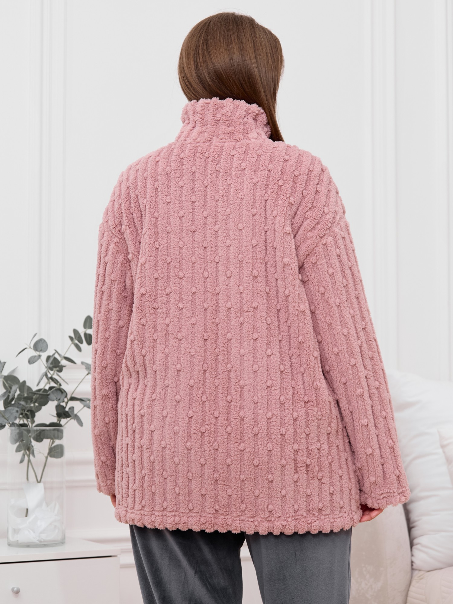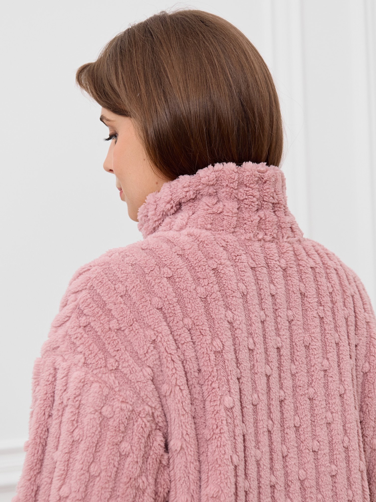 Костюм женский из двух видов текстильных материалов: тканого полотна «велсофт» и трикотажного полотна «вельмонд», состоящий из куртки и брюк.Куртка – из гладкокрашенного трикотажного полотна «велсофт» со стриженым рисунком, с длинными втачными рукавами, воротником «стойка», карманами в боковых швах, центральной бортовой застежкой на тесьму «молния».