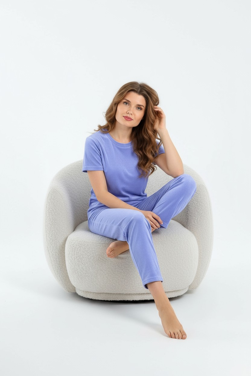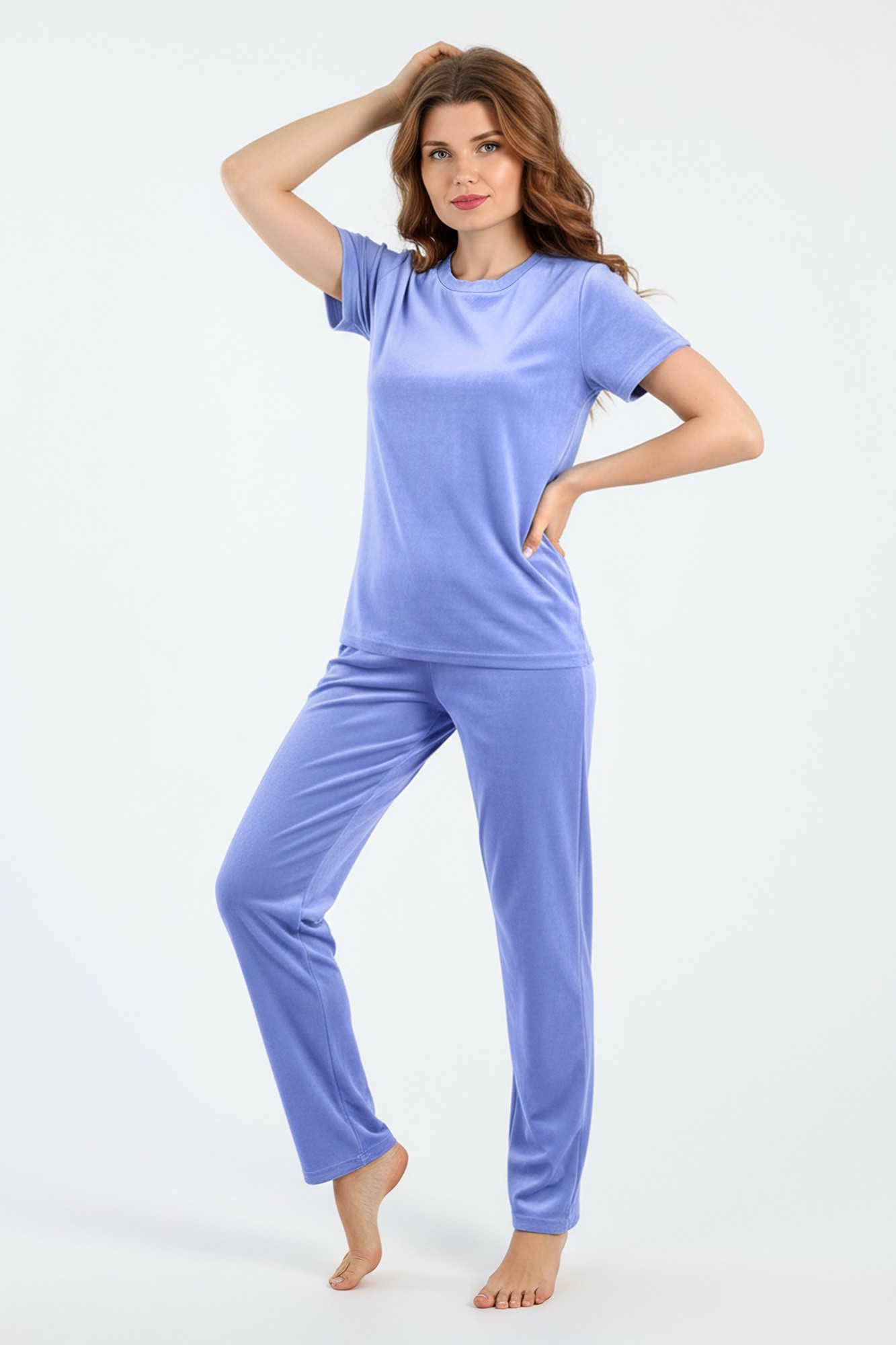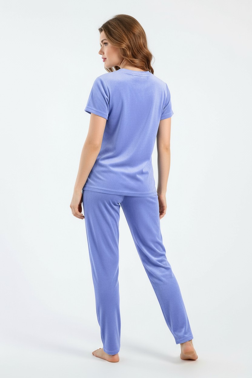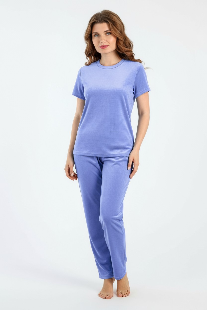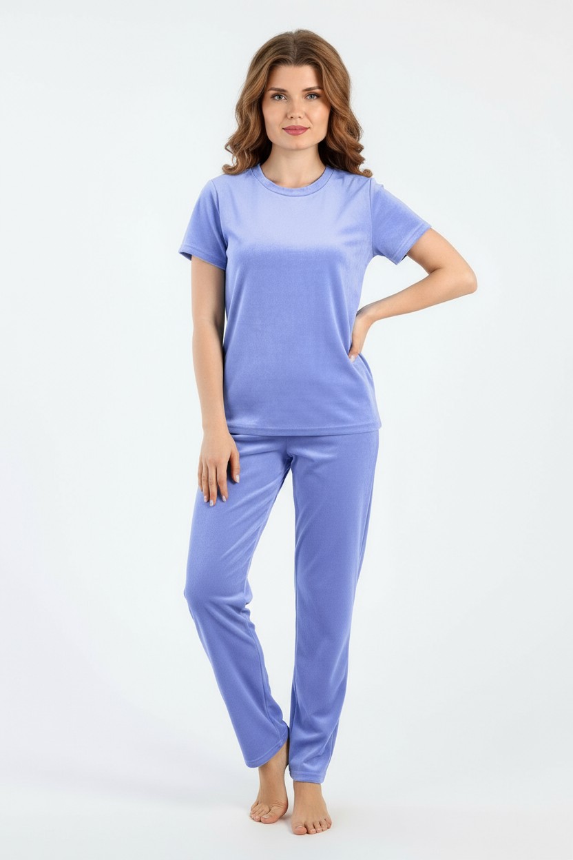 Костюм молодежный из трикотажного полотна «велюр-стрейч», состоящий из футболки и брюк. Футболка - классического покроя, с короткими втачными рукавами и горловиной овальной формы, обработанной втачной бейкой. Брюки – длинные, свободного покроя, с эластичной тесьмой по талии.