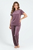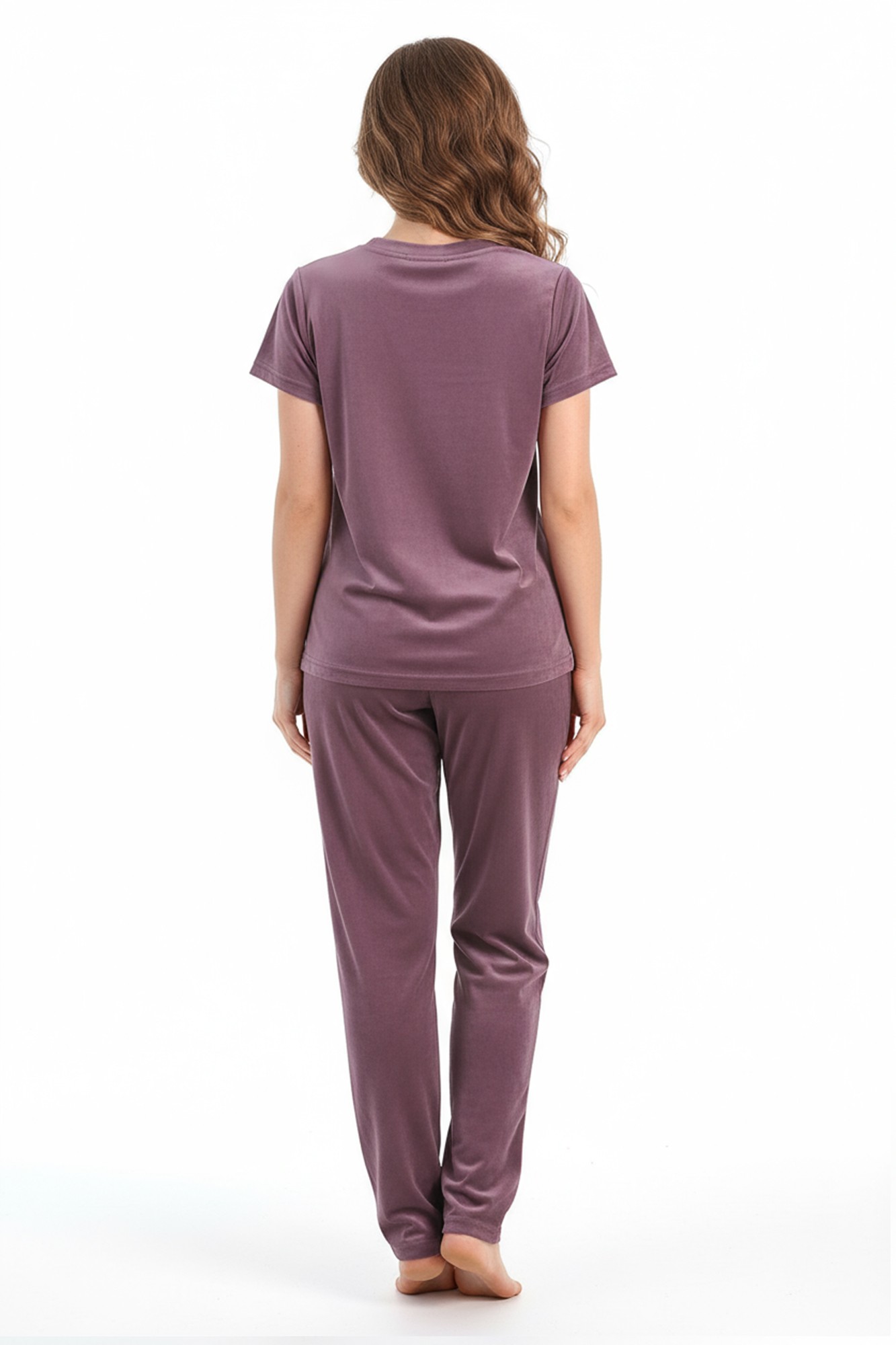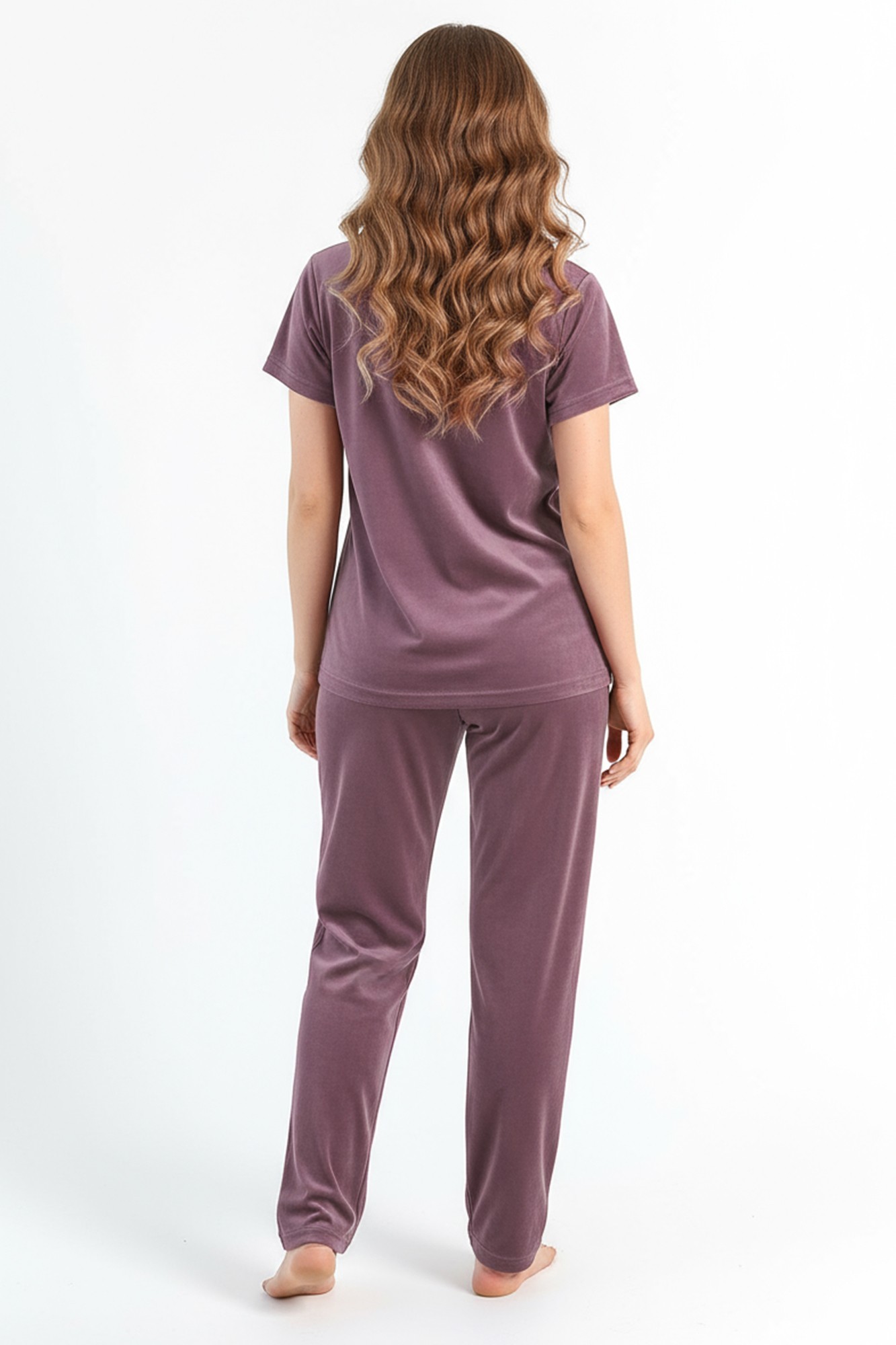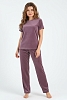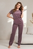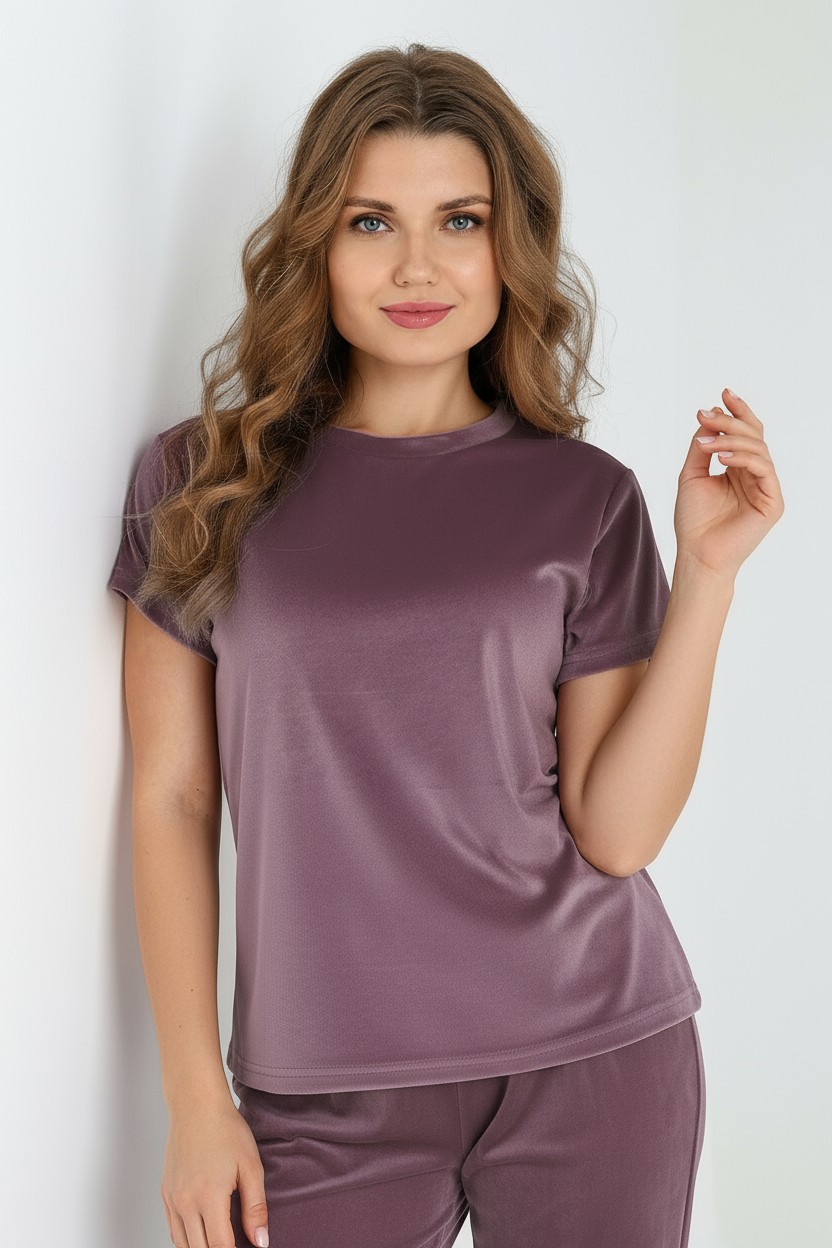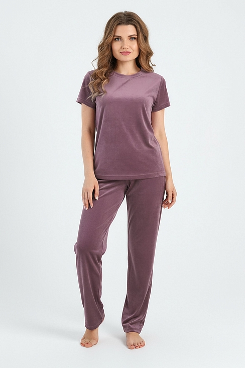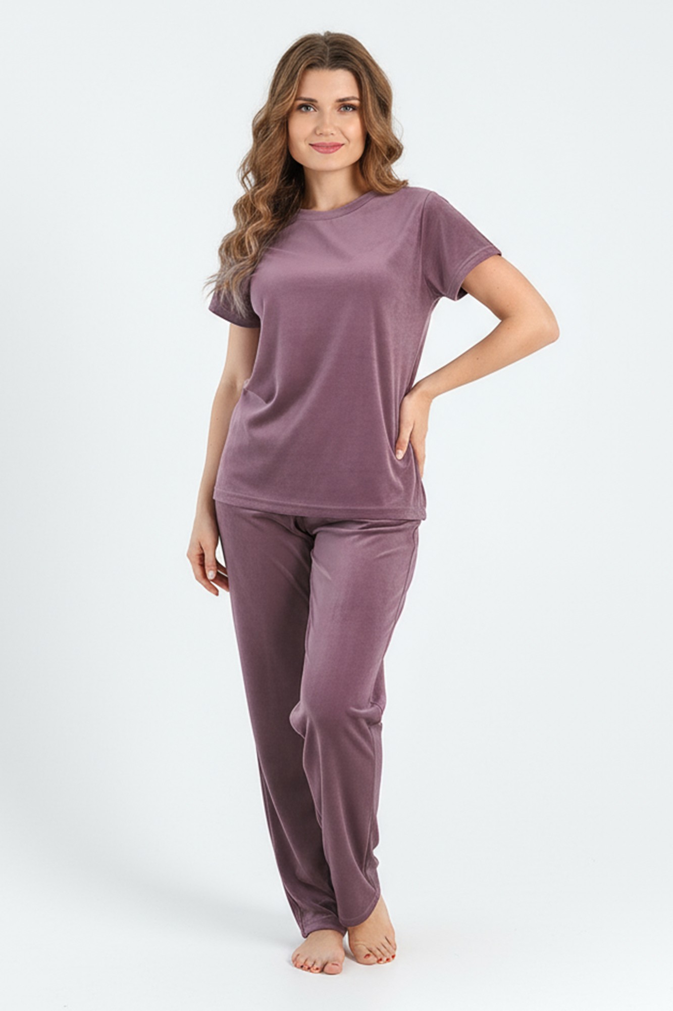 Костюм молодежный из трикотажного полотна «велюр-стрейч», состоящий из футболки и брюк. Футболка - классического покроя, с короткими втачными рукавами и горловиной овальной формы, обработанной втачной бейкой. Брюки – длинные, свободного покроя, с эластичной тесьмой по талии.