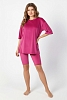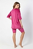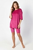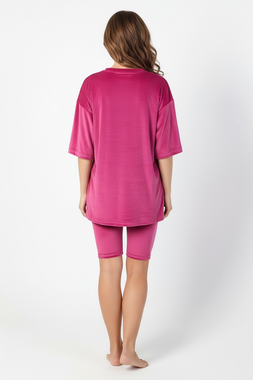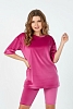 Костюм из гладкокрашеного трикотажного полотна «велюр стрейч», состоящий из футболки и леггинсов. Футболка – удлиненная, свободного покроя, со спущенной, линией плеча, короткими втачными рукавами, горловиной овальной формы, обработанной втачной планкой.Леггинсы – длиной до колен, с эластичной тесьмой по талии.
