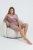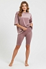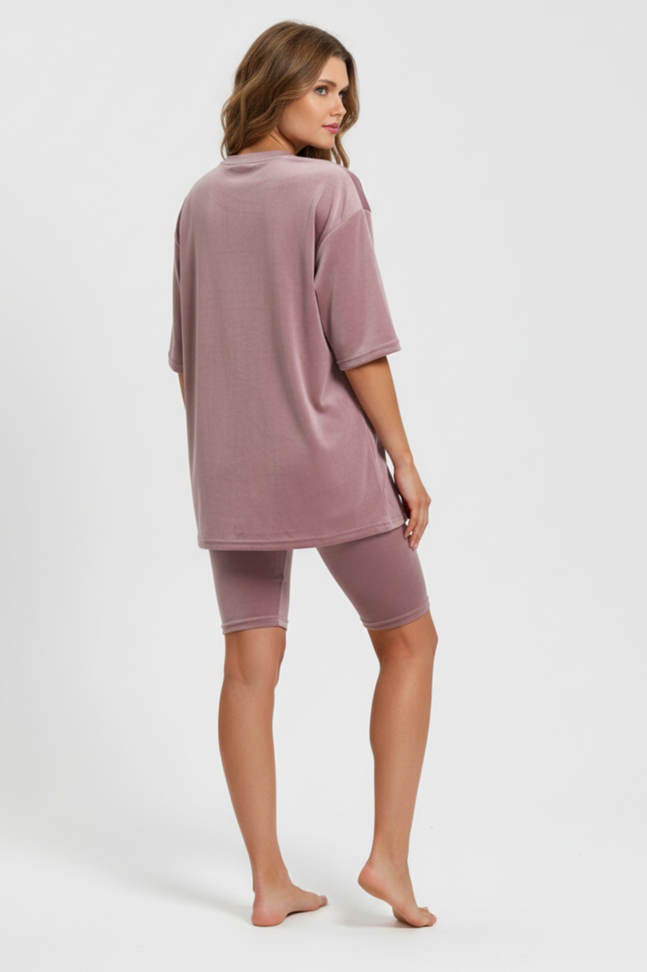 Костюм из гладкокрашеного трикотажного полотна «велюр стрейч», состоящий из футболки и леггинсов. Футболка – удлиненная, свободного покроя, со спущенной, линией плеча, короткими втачными рукавами, горловиной овальной формы, обработанной втачной планкой.Леггинсы – длиной до колен, с эластичной тесьмой по талии.