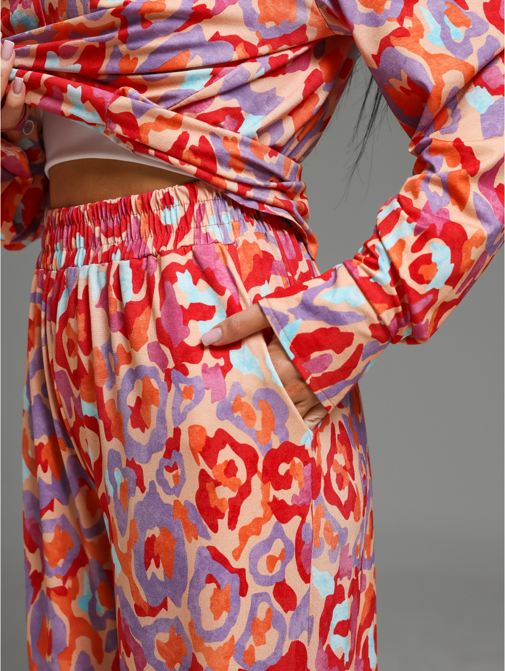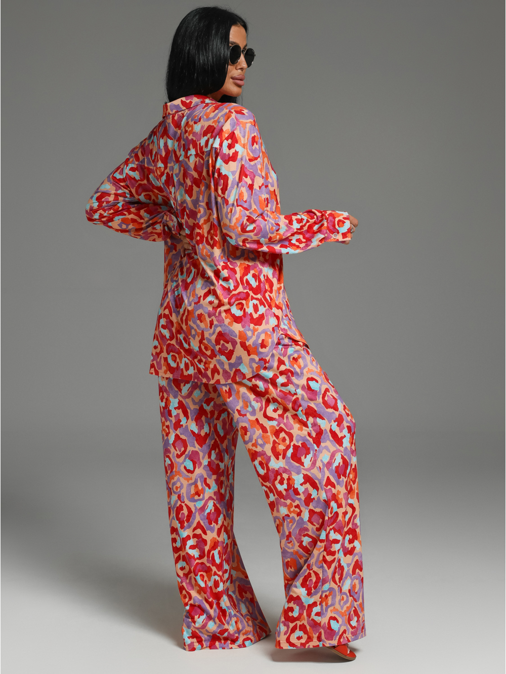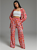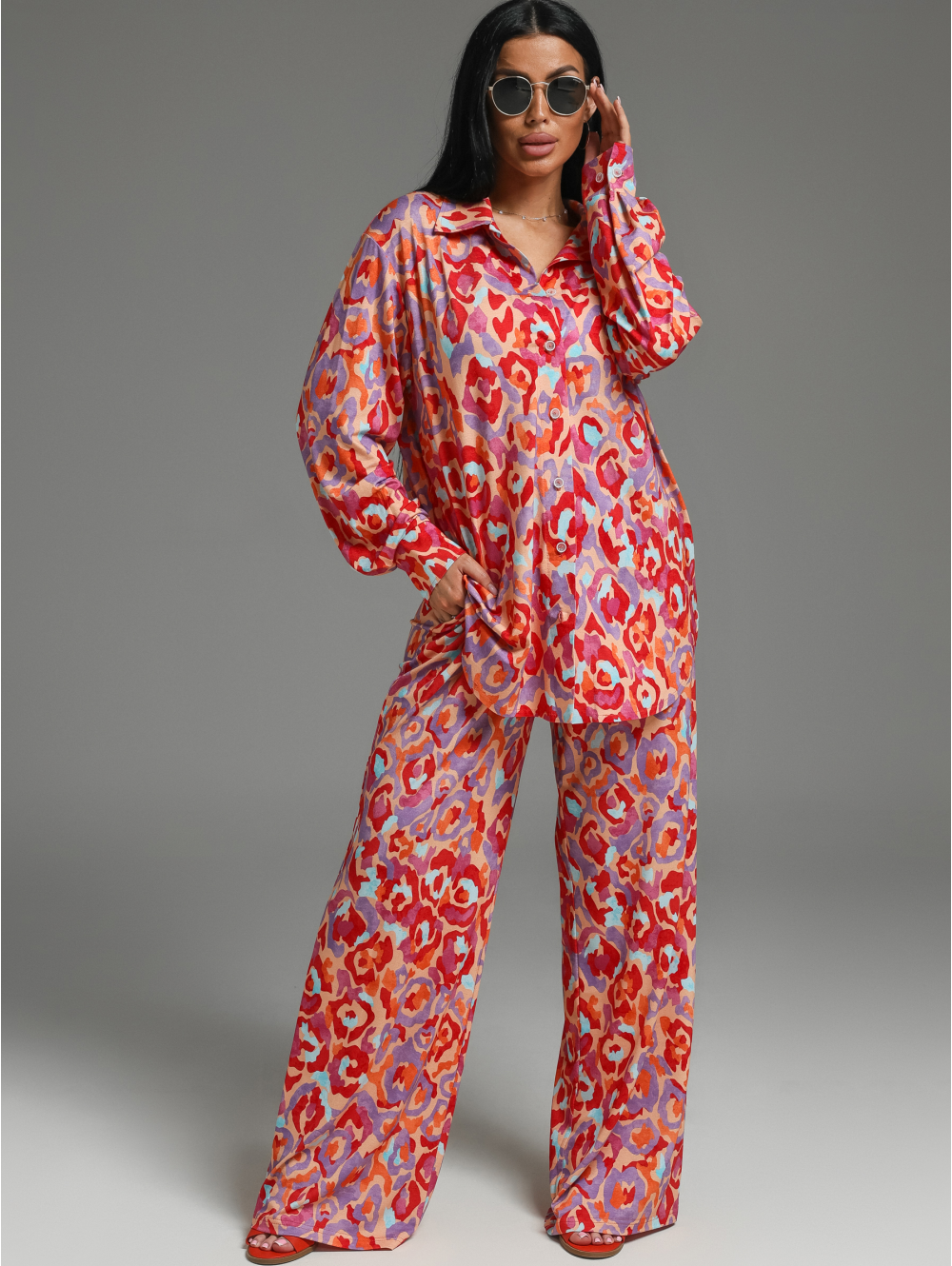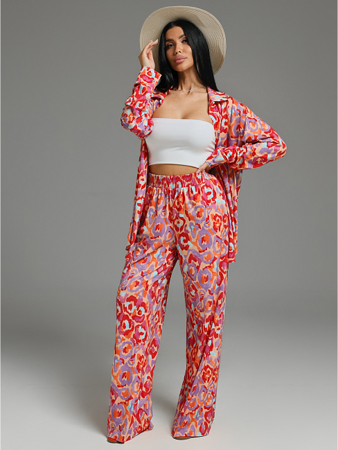 Костюм женский Парадиз состоит из рубашки и брюк. Рубашка прямого силуэта с центральной бортовой застежкой на пуговицы, с втачным воротником, с длинным втачным рукавом с манжетой. Брюки прямые от бедра с отрезным поясом.