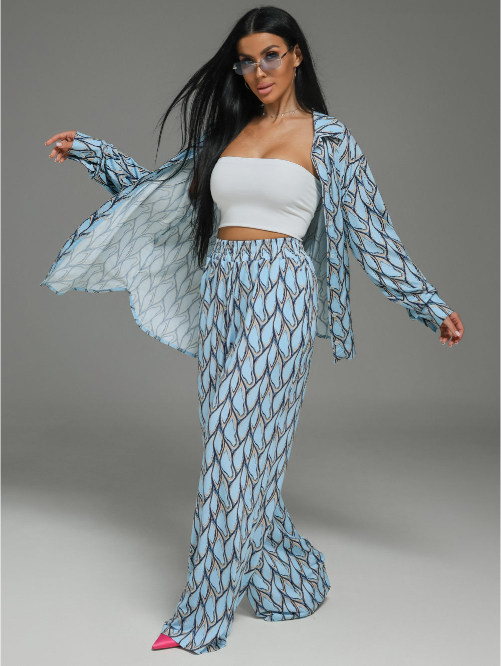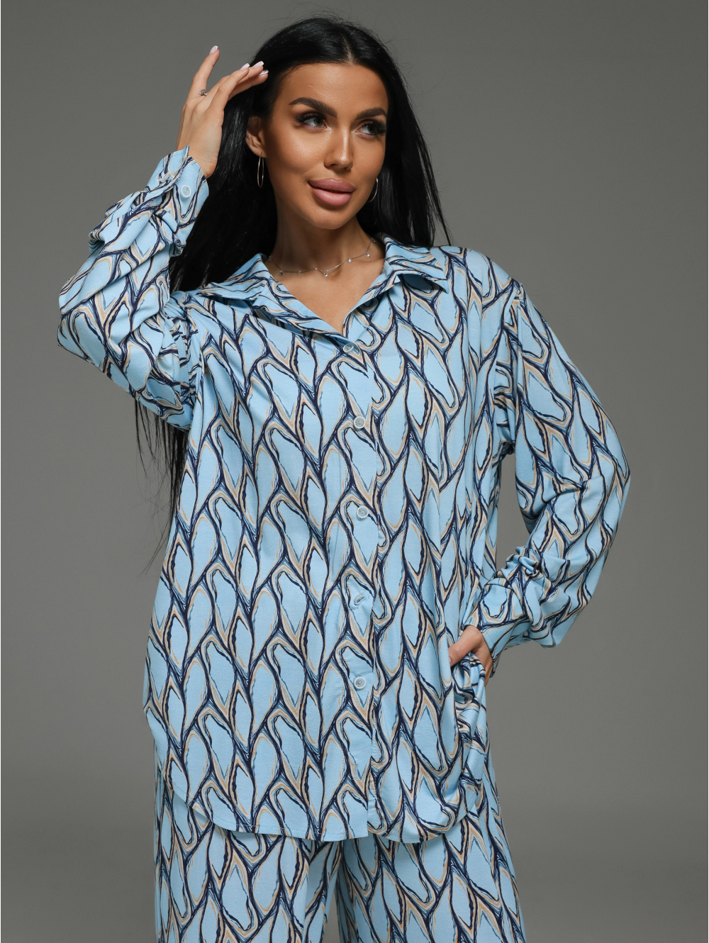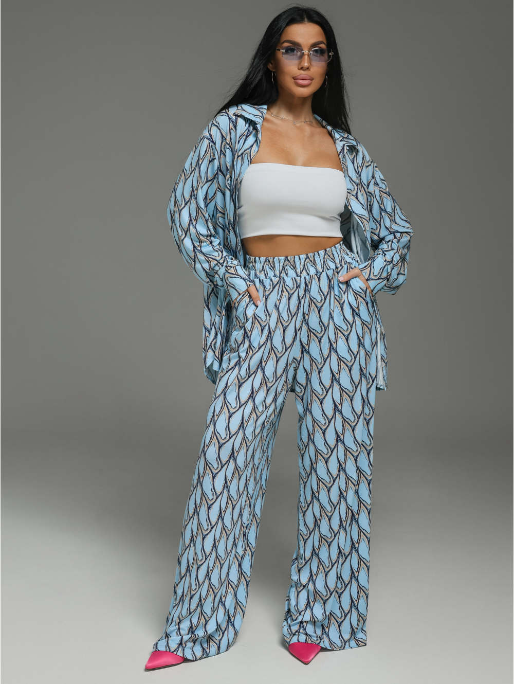 Костюм женский Парадиз состоит из рубашки и брюк. Рубашка прямого силуэта с центральной бортовой застежкой на пуговицы, с втачным воротником, с длинным втачным рукавом с манжетой. Брюки прямые от бедра с отрезным поясом.