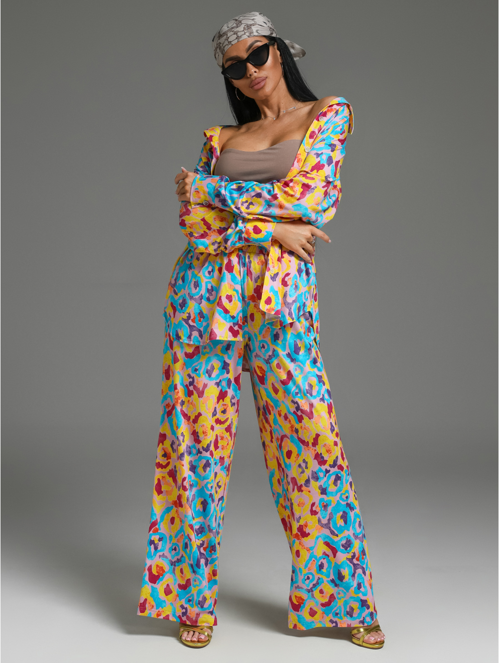 Костюм женский Парадиз состоит из рубашки и брюк. Рубашка прямого силуэта с центральной бортовой застежкой на пуговицы, с втачным воротником, с длинным втачным рукавом с манжетой. Брюки прямые от бедра с отрезным поясом.