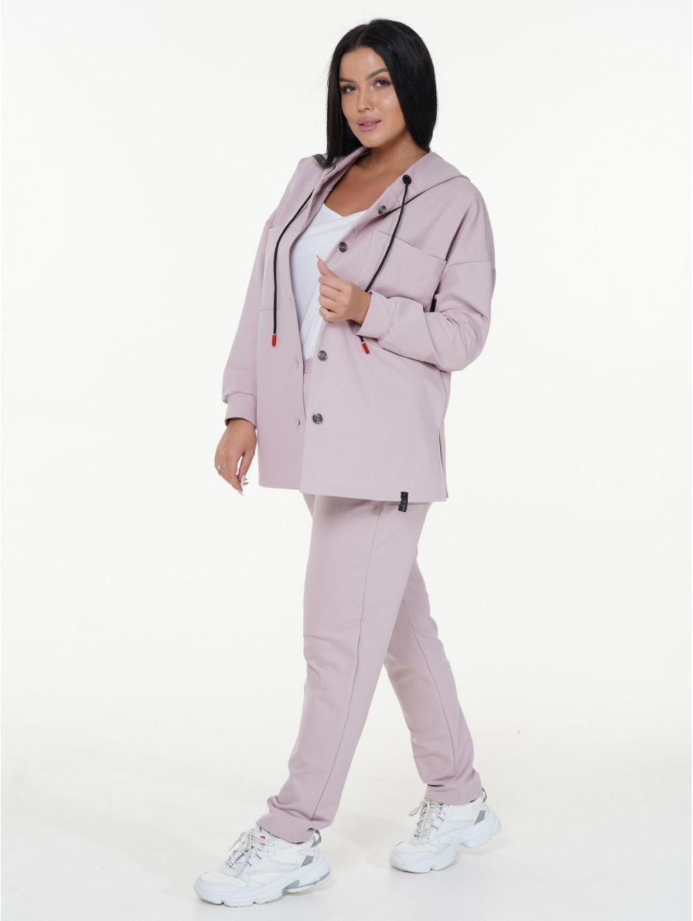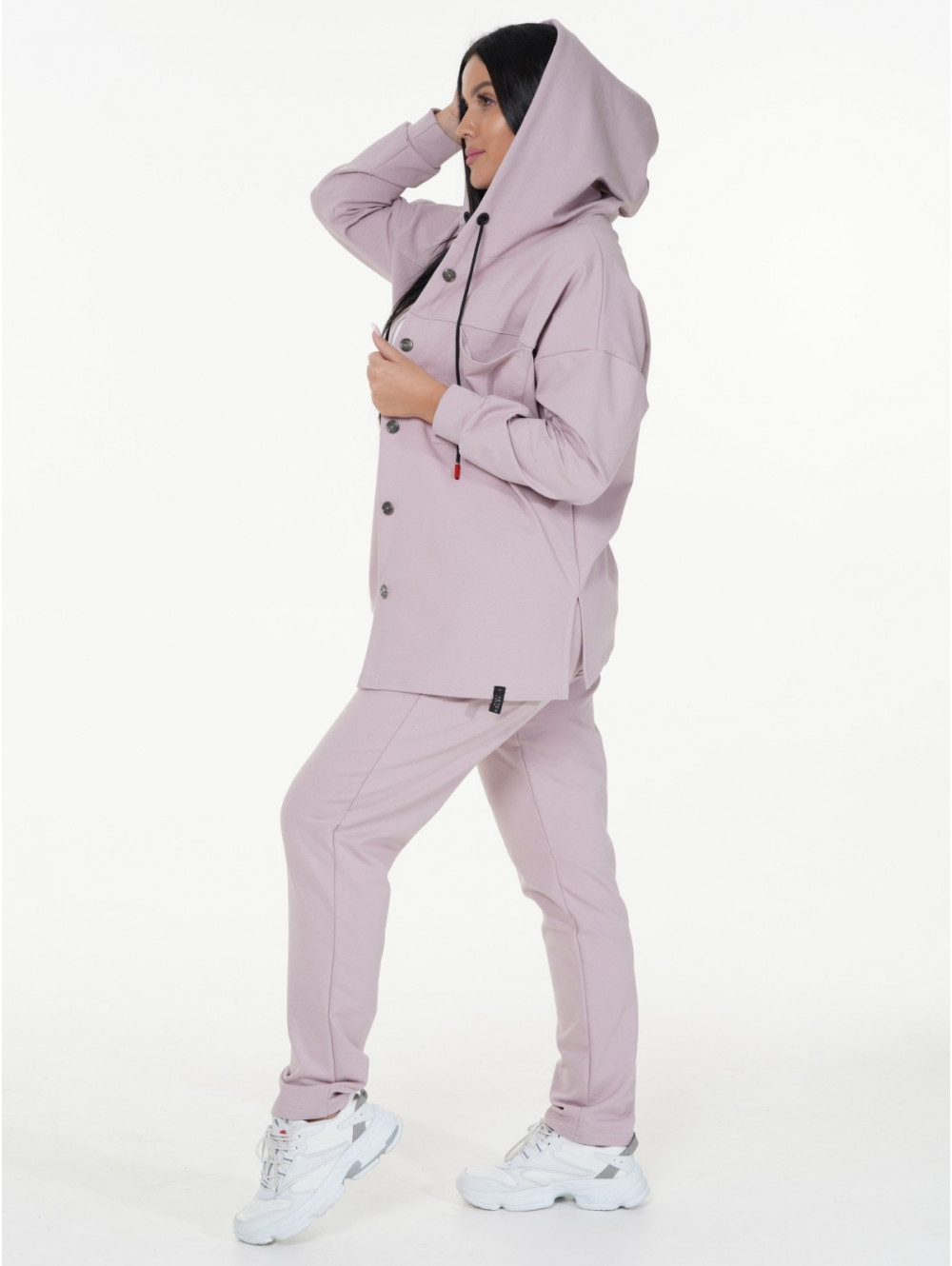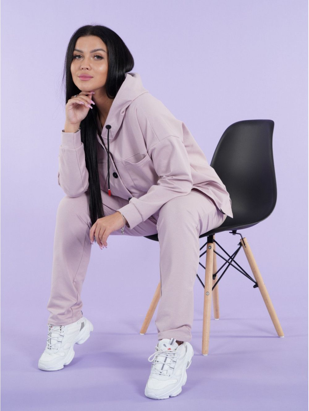 Представляем Вам наш костюм ПРЕСТИЖ,в стиле оверсайз, состоящий из кофты с капюшоном и на пуговицах и брюк с карманами. На полочке также находятся накладные карманы.
