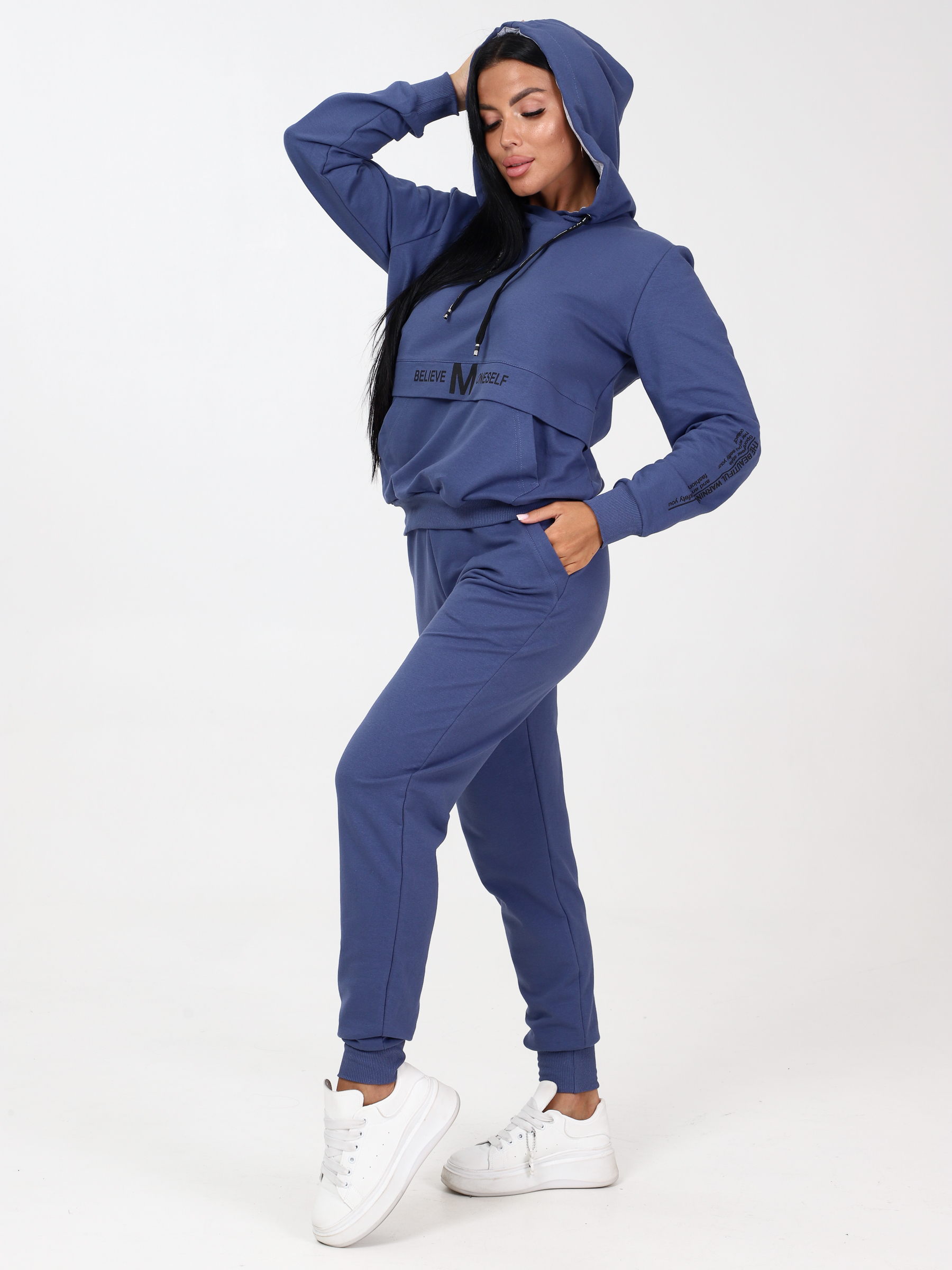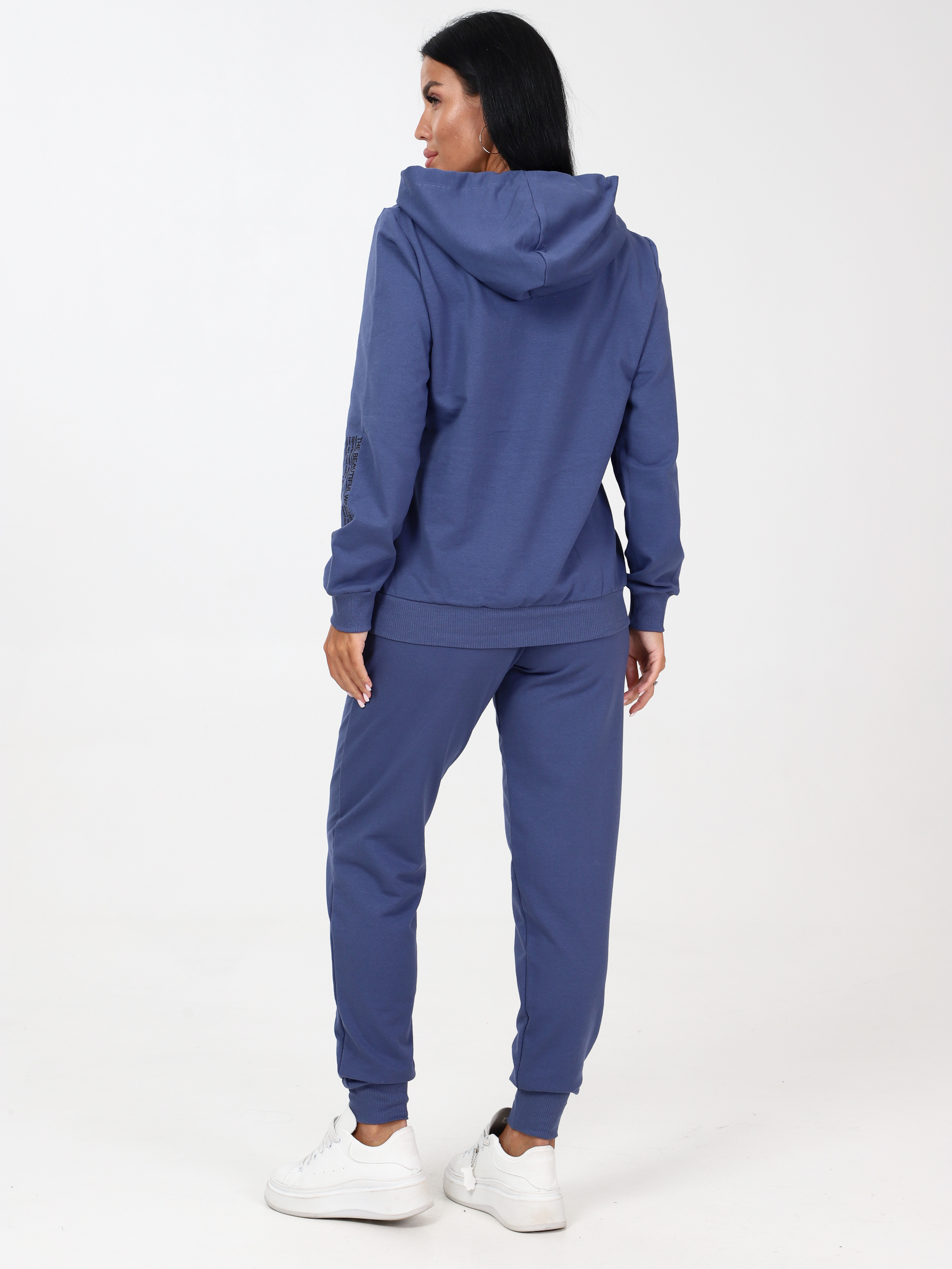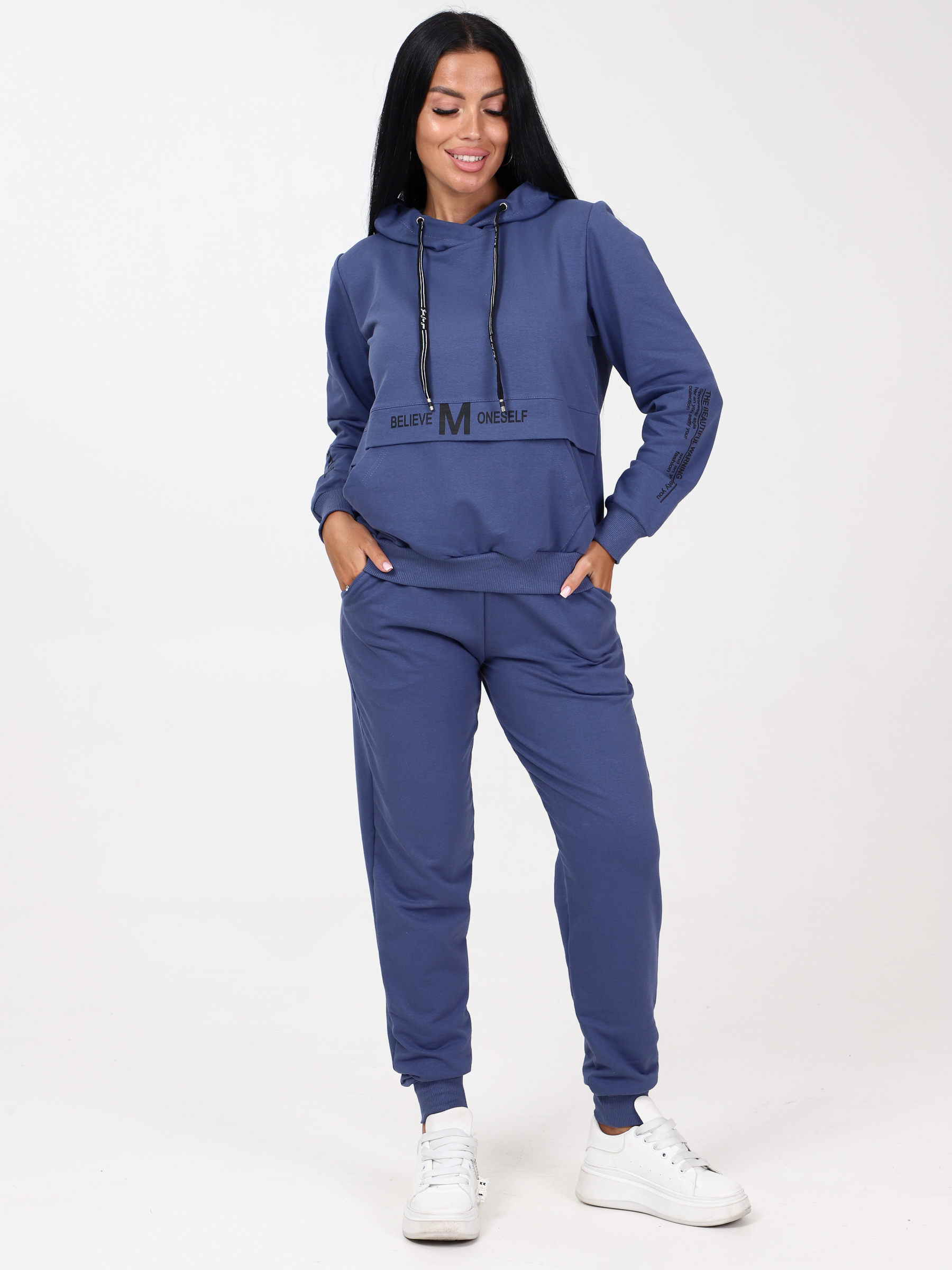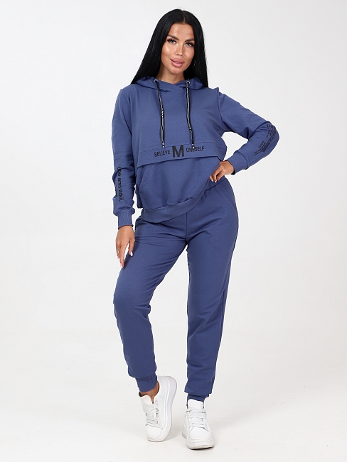 Женский спортивный костюм из футера: состоит из удобных джоггеров и худи (толстовка) с капюшоном. Костюм выглядит очень стильно благодаря нанесенному печатному принту на толстовке-худи. Брюки - джоггеры в меру заужены. Пояс на резинке, манжеты рукавов и низ брюк сшиты из мягкого и эластичного кашкорсе. Низ толстовки тожеиз кашкорсе, поэтому прекрасно садится по любой фигуре и выглядит эстетично, скрывая недостатки. Карман-кенгуру со входом с 2-х сторон. Двухсторонний капюшон изнутри отделан трикотажем - кулиркой, что отличает наш костюм от многих других и выглядит очень аккуратно. Футерный костюм идеален для прогулок, занятий спортом, для активного отдыха, поездок на природу и т.д. Брючный костюм очень комфортен и практичен для повседневной носки.