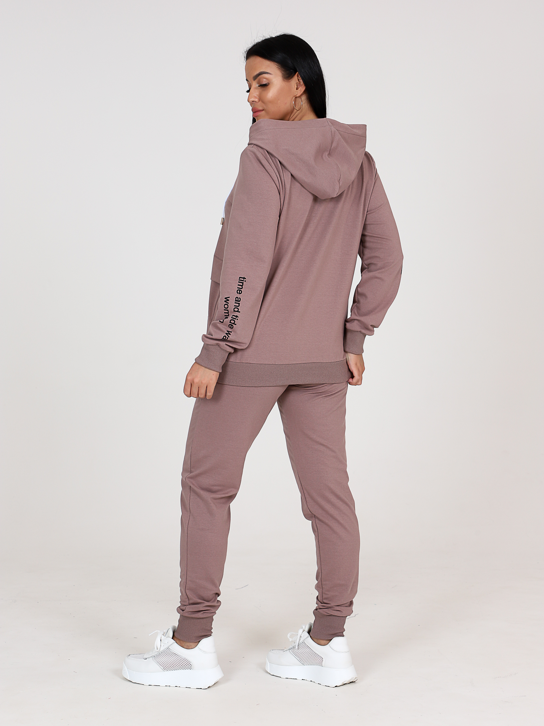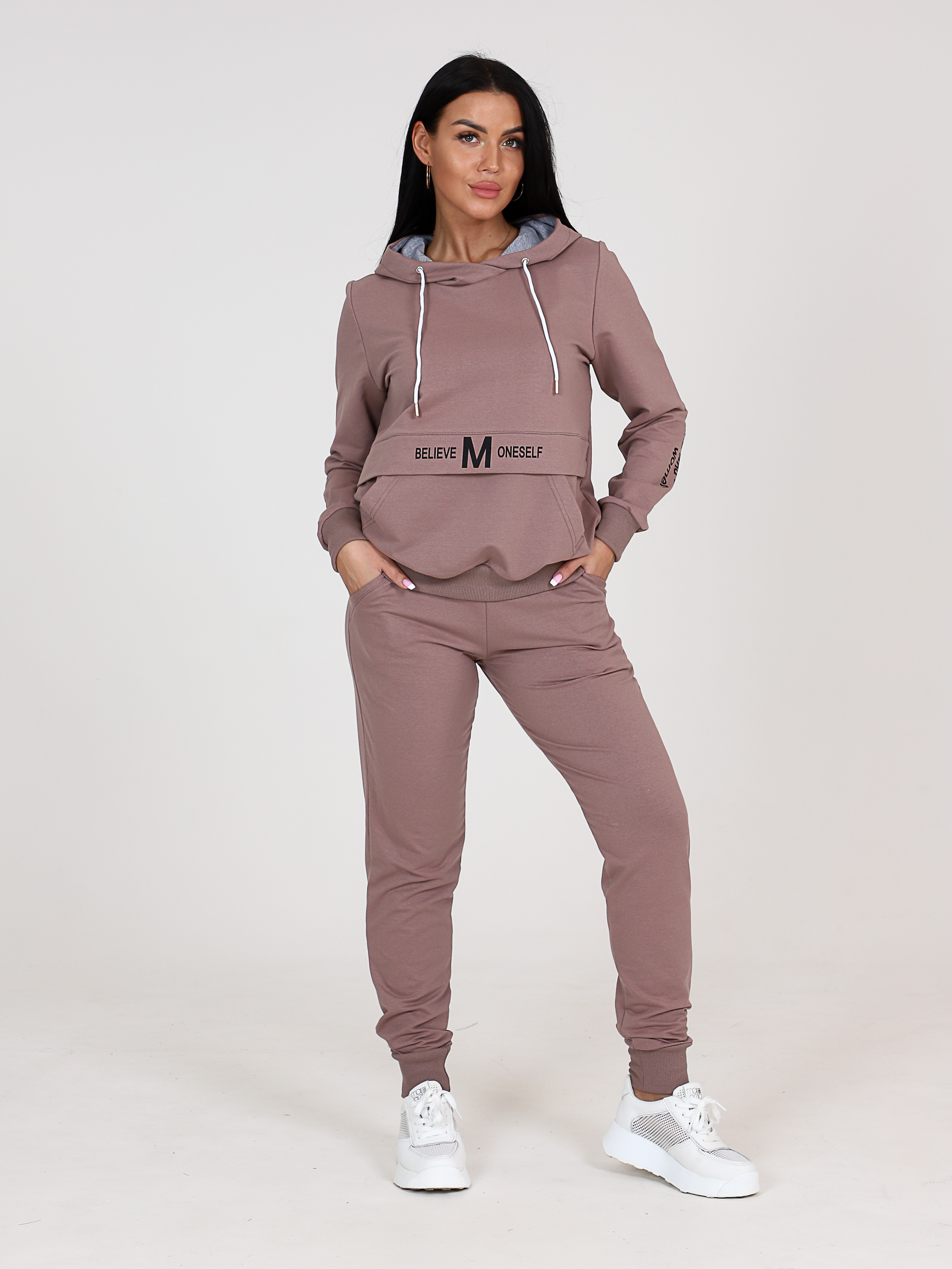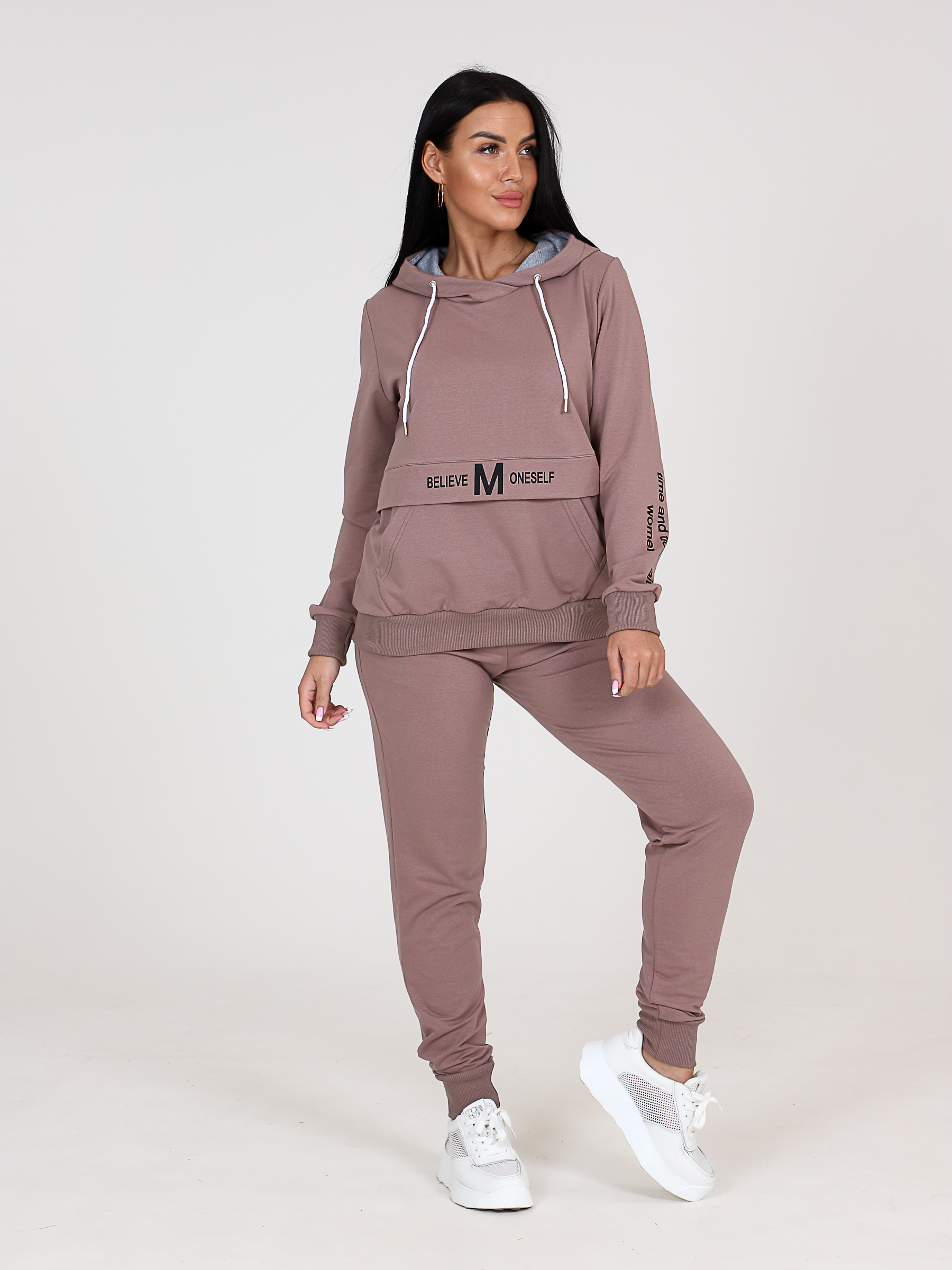 Женский спортивный костюм из футера: состоит из удобных джоггеров и худи (толстовка) с капюшоном. Костюм выглядит очень стильно благодаря нанесенному печатному принту на толстовке-худи. Брюки - джоггеры в меру заужены. Пояс на резинке, манжеты рукавов и низ брюк сшиты из мягкого и эластичного кашкорсе. Низ толстовки тожеиз кашкорсе, поэтому прекрасно садится по любой фигуре и выглядит эстетично, скрывая недостатки. Карман-кенгуру со входом с 2-х сторон. Двухсторонний капюшон изнутри отделан трикотажем - кулиркой, что отличает наш костюм от многих других и выглядит очень аккуратно. Футерный костюм идеален для прогулок, занятий спортом, для активного отдыха, поездок на природу и т.д. Брючный костюм очень комфортен и практичен для повседневной носки.