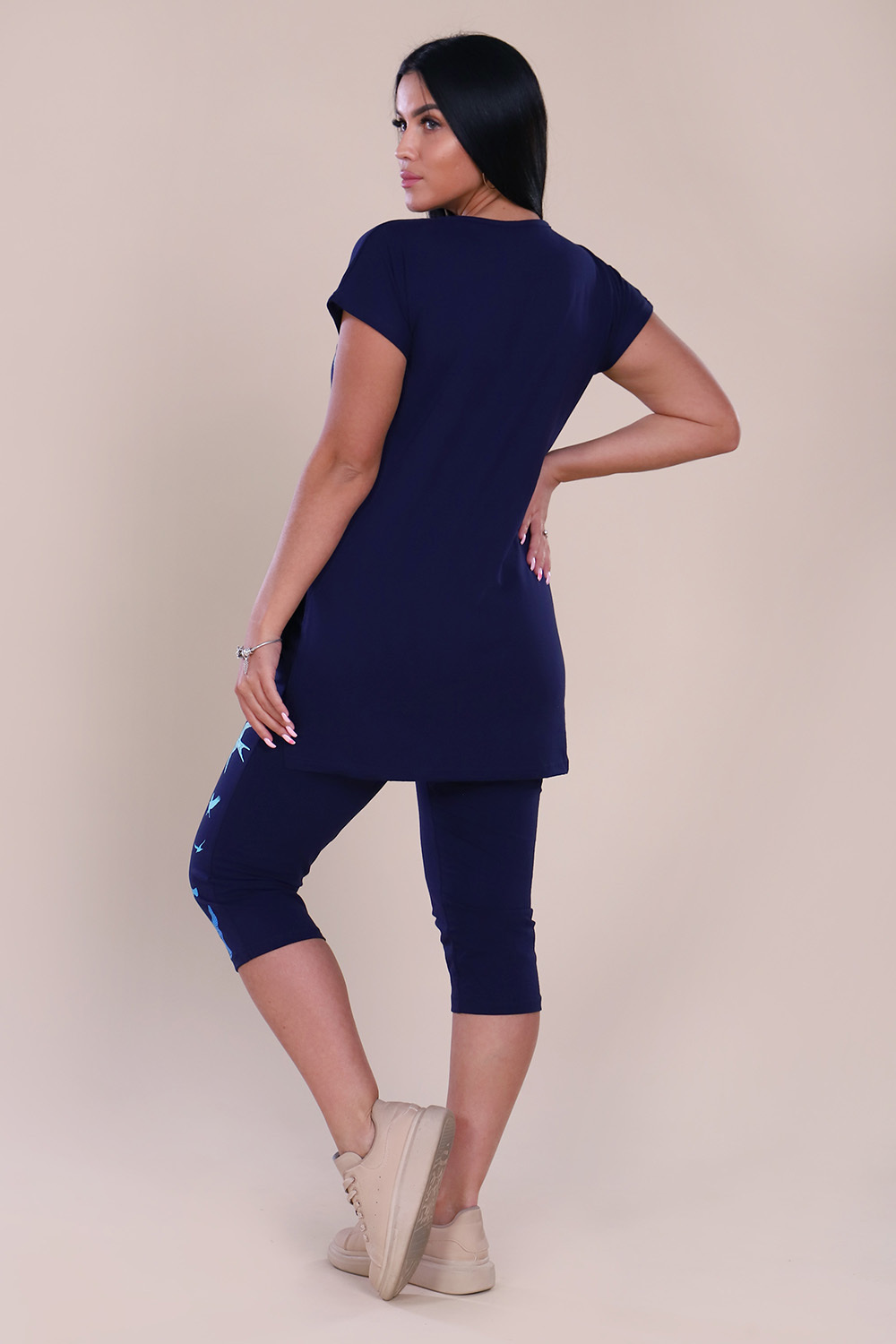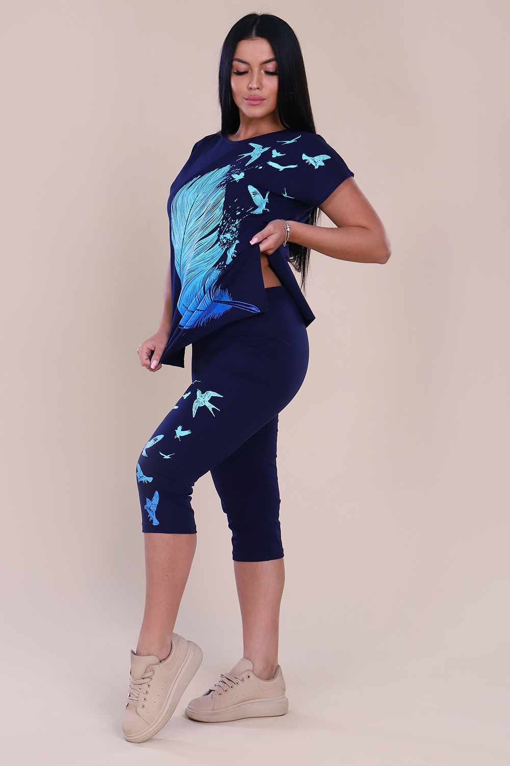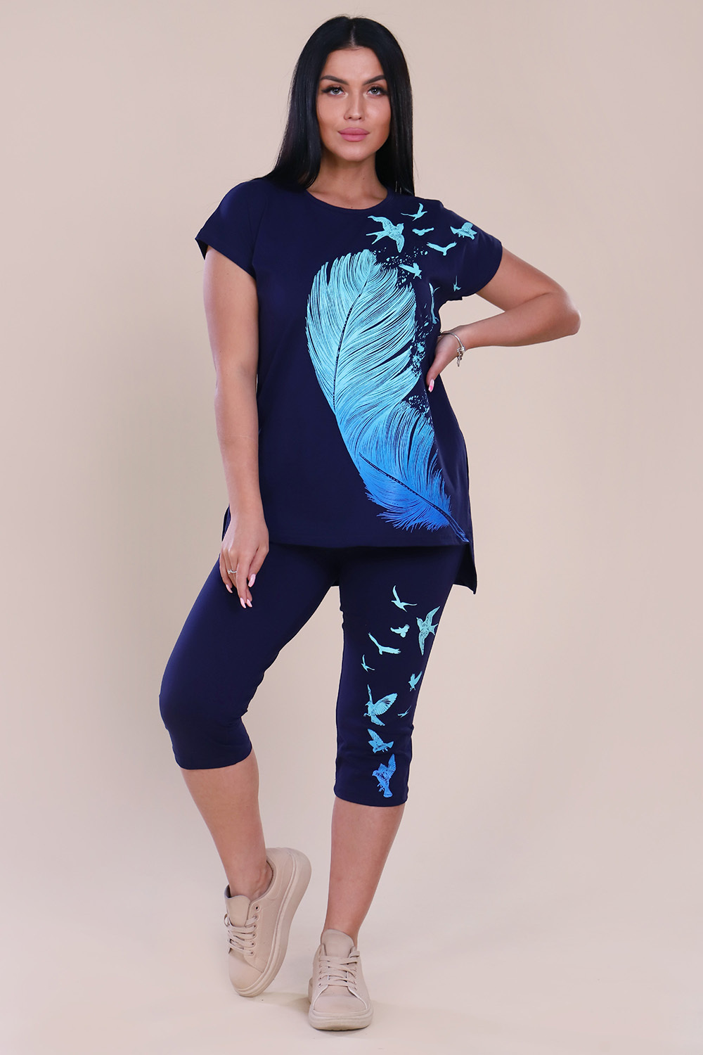 Женский костюм с бриджами из кулирки — это комплект из туники или футболки и бриджей, изготовленный из трикотажного полотна кулирка (100% хлопок). Такая одежда подходит для дома, отдыха, прогулок и активного времяпрепровождения благодаря воздухопроницаемости, мягкости и комфорту.