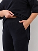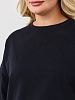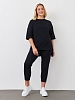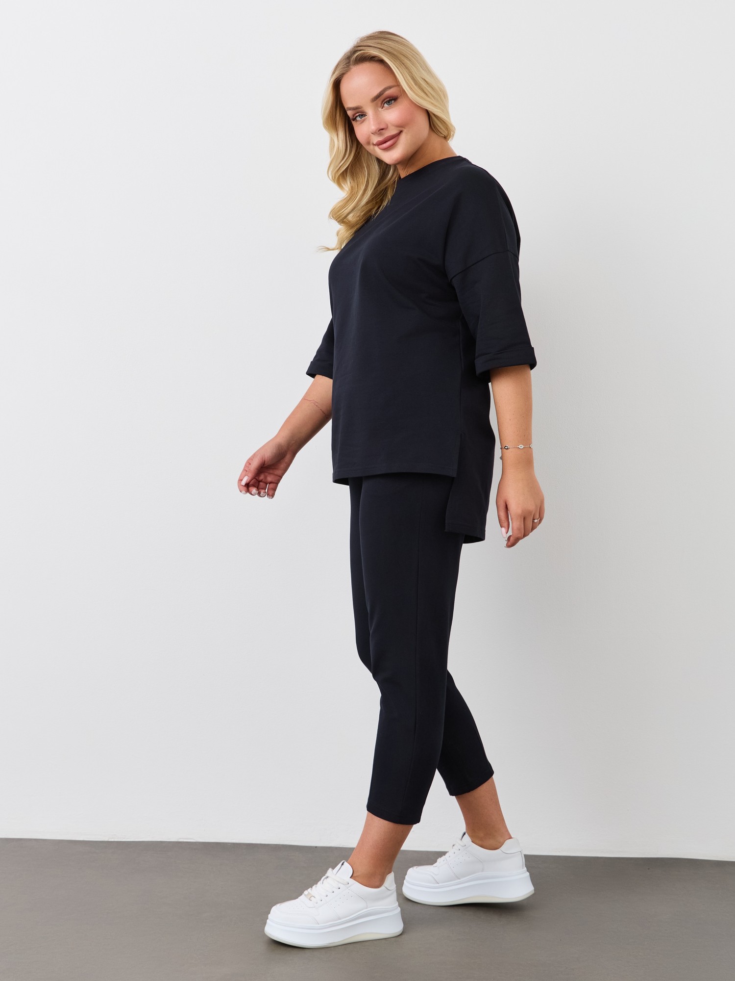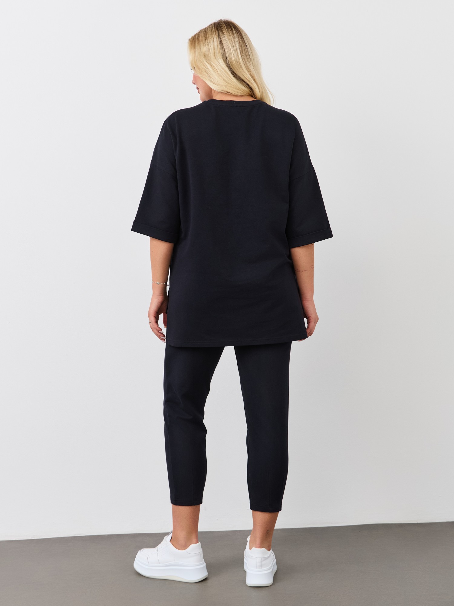 Костюм из гладкокрашеного трикотажного полотна «футер-двунитка», состоящий из джемпера и брюк. Джемпер – свободного покроя, с рукавами на основе цельнокроеных длиной до локтя, горловиной овальной формы, обработанной втачной планкой, разрезами в боковых швах и принтом на полочке. Рукава – с цельнокроеными манжетами-отворотами. Модный элемент- разность длины полочки и спинки на 10 см. Брюки – укороченные, на притачном поясе с эластичной тесьмой внутри и карманами в боковых швах. На нижних частях передних и задних половин обработаны по две вертикальные вытачки.