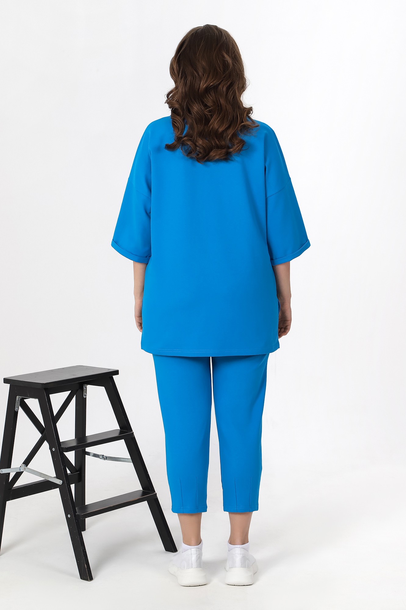 Костюм из гладкокрашеного трикотажного полотна «футер-двунитка», состоящий из джемпера и брюк. Джемпер – свободного покроя, с рукавами на основе цельнокроеных длиной до локтя, горловиной овальной формы, обработанной втачной планкой, разрезами в боковых швах и принтом на полочке. Рукава – с цельнокроеными манжетами-отворотами. Модный элемент- разность длины полочки и спинки на 10 см. Брюки – укороченные, на притачном поясе с эластичной тесьмой внутри и карманами в боковых швах. На нижних частях передних и задних половин обработаны по две вертикальные вытачки.