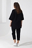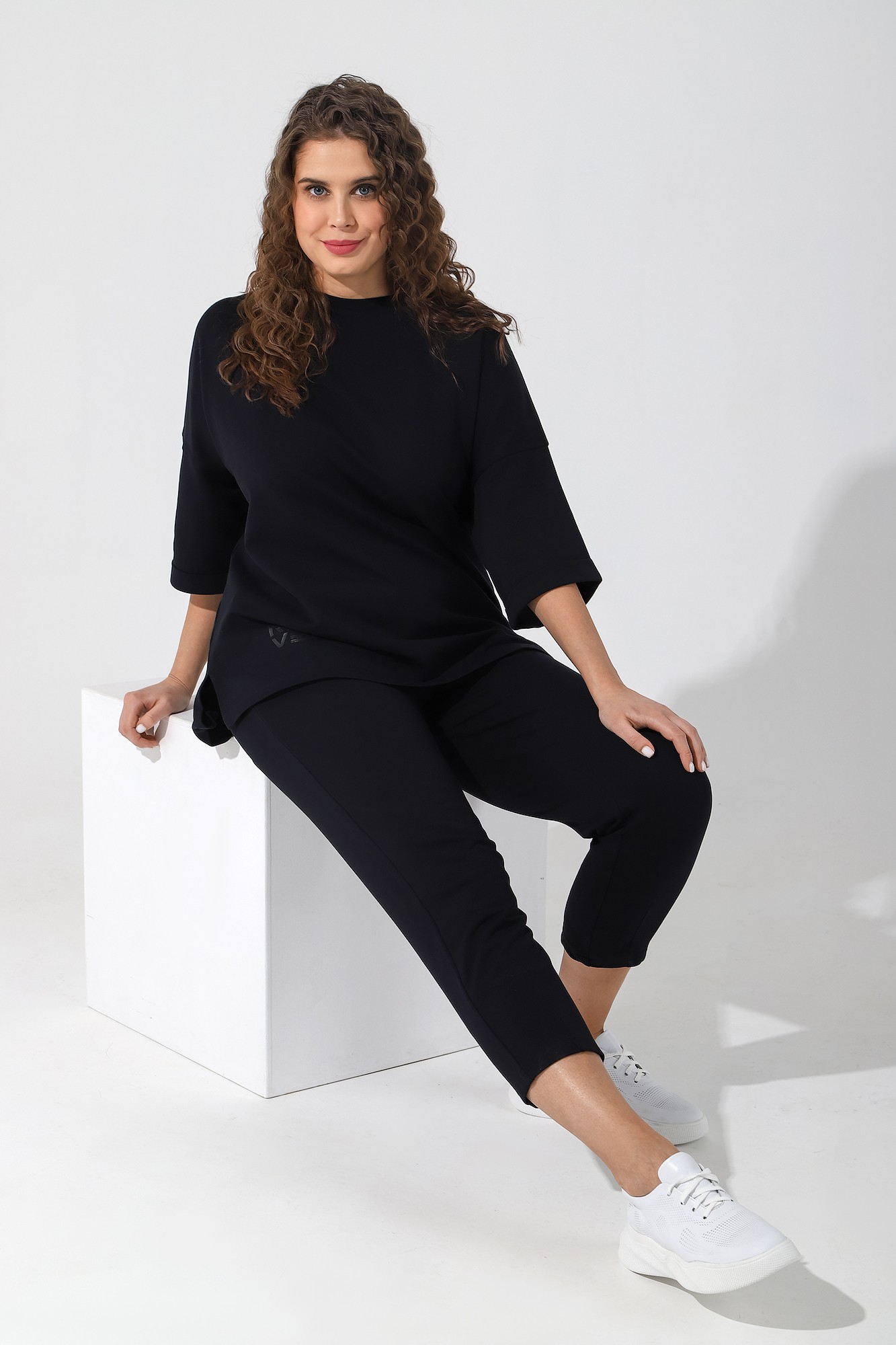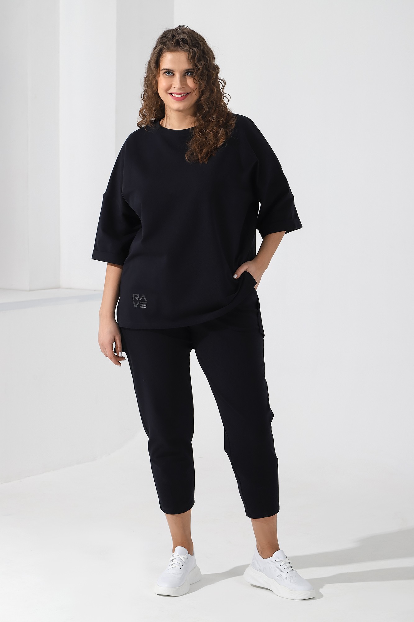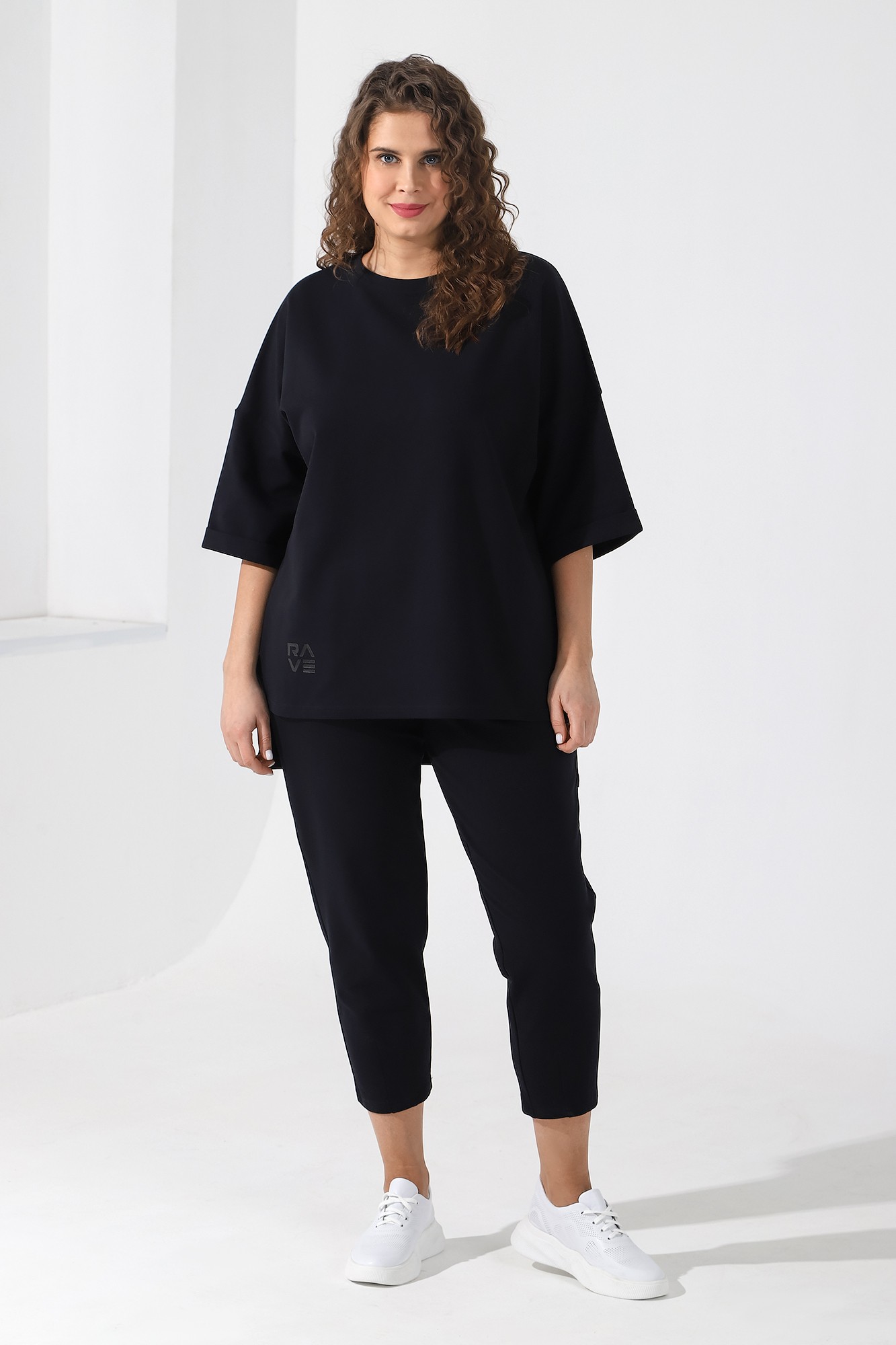 Костюм из гладкокрашеного трикотажного полотна «футер-двунитка», состоящий из джемпера и брюк. Джемпер – свободного покроя, с рукавами на основе цельнокроеных длиной до локтя, горловиной овальной формы, обработанной втачной планкой, разрезами в боковых швах и принтом на полочке. Рукава – с цельнокроеными манжетами-отворотами. Модный элемент- разность длины полочки и спинки на 10 см. Брюки – укороченные, на притачном поясе с эластичной тесьмой внутри и карманами в боковых швах. На нижних частях передних и задних половин обработано по две вертикальные вытачки.