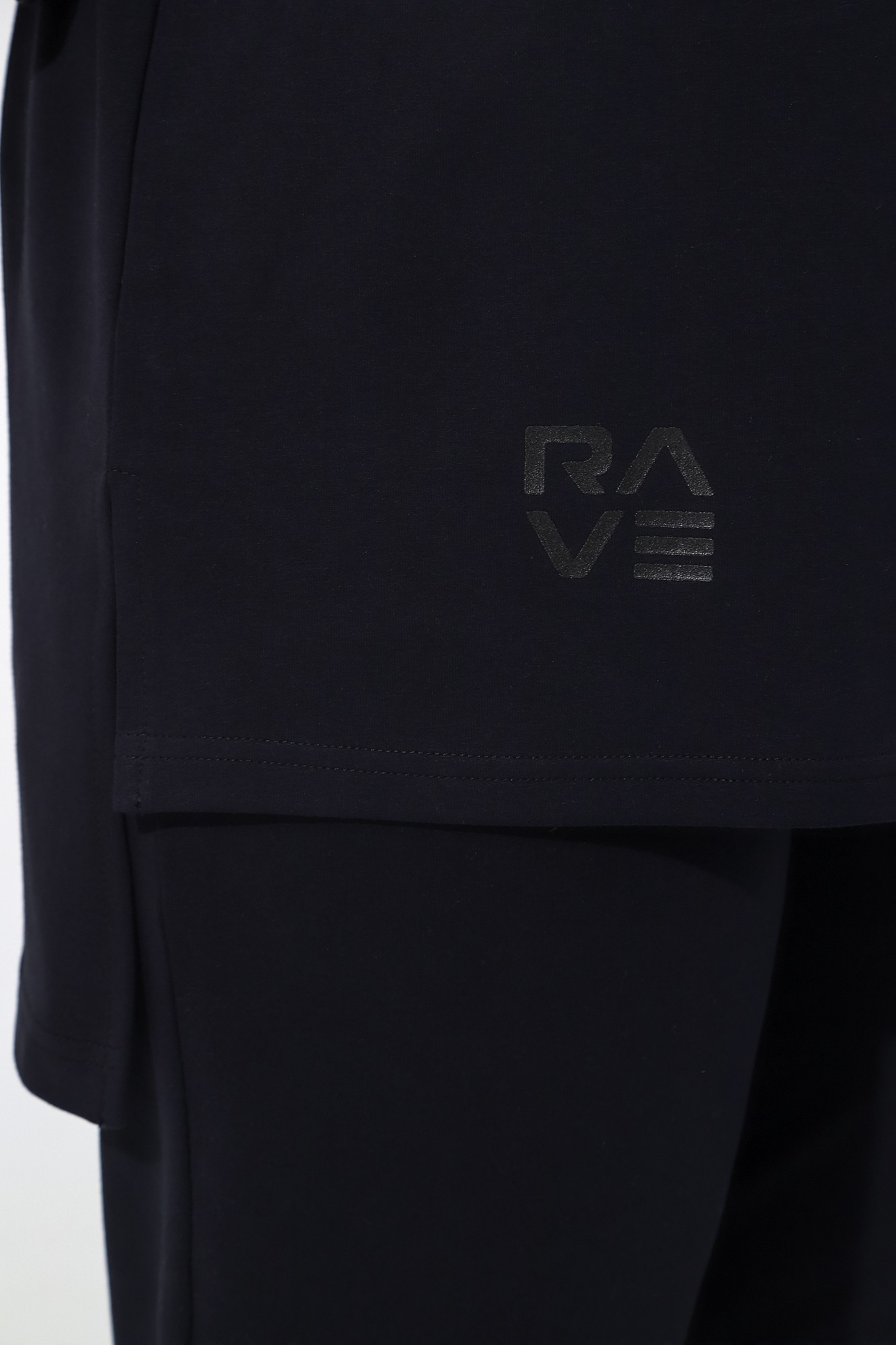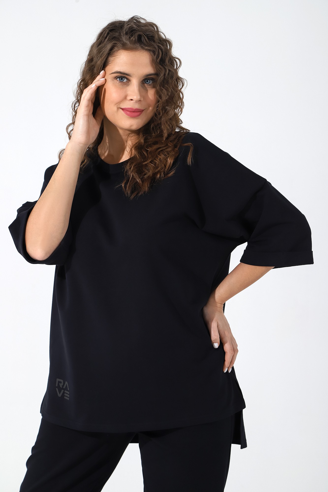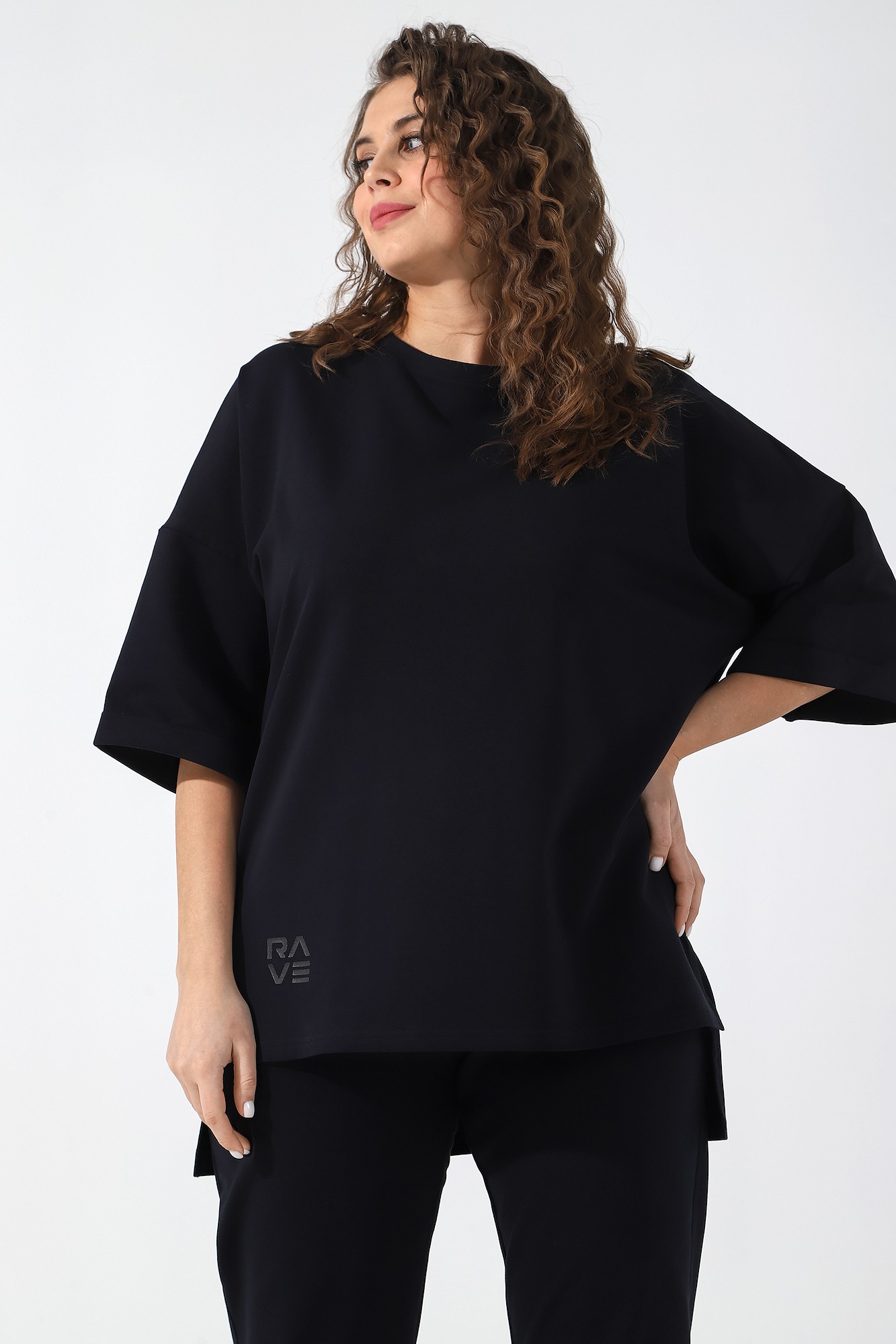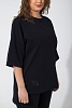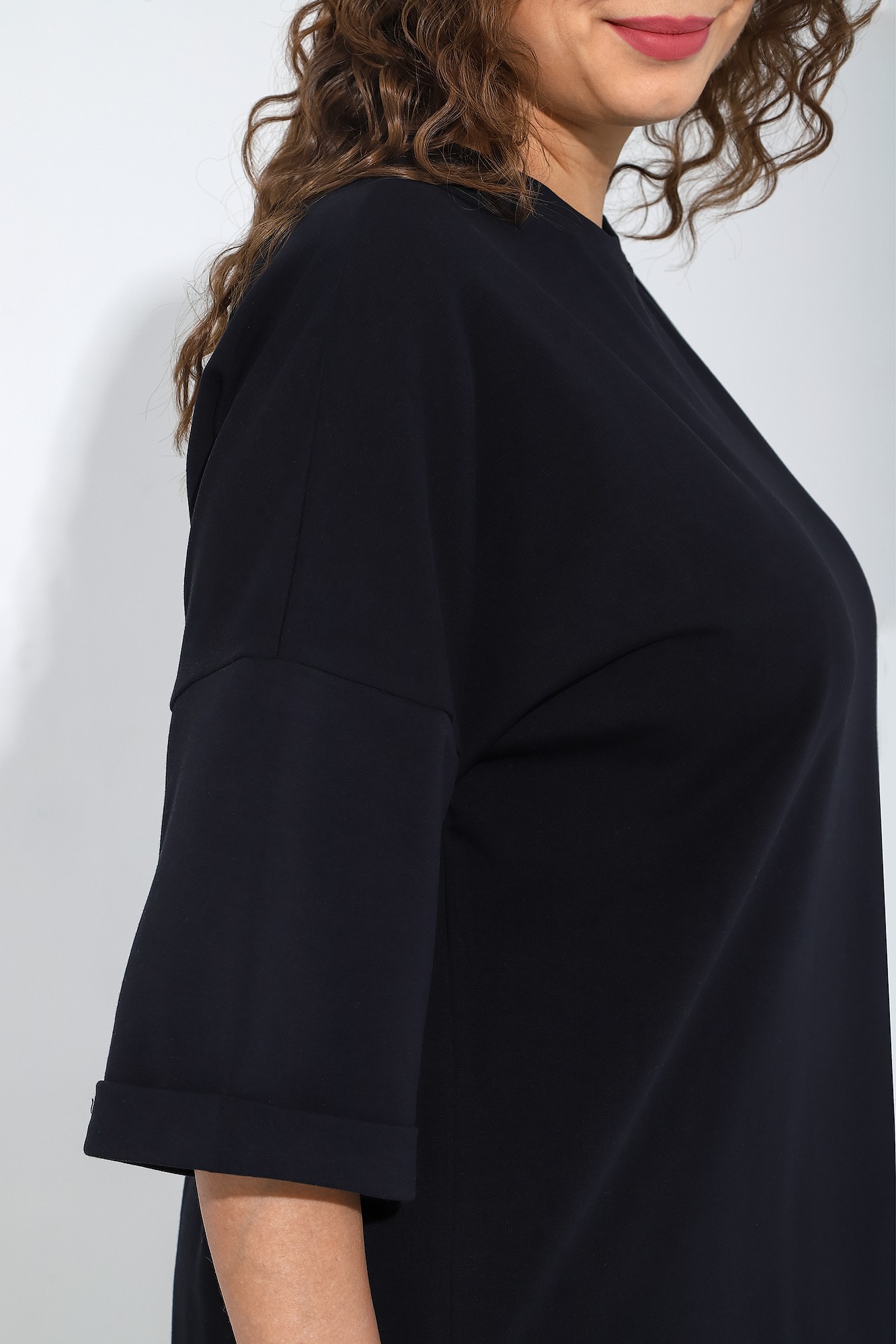 Костюм из гладкокрашеного трикотажного полотна «футер-двунитка», состоящий из джемпера и брюк. Джемпер – свободного покроя, с рукавами на основе цельнокроеных длиной до локтя, горловиной овальной формы, обработанной втачной планкой, разрезами в боковых швах и принтом на полочке. Рукава – с цельнокроеными манжетами-отворотами. Модный элемент- разность длины полочки и спинки на 10 см. Брюки – укороченные, на притачном поясе с эластичной тесьмой внутри и карманами в боковых швах. На нижних частях передних и задних половин обработано по две вертикальные вытачки.