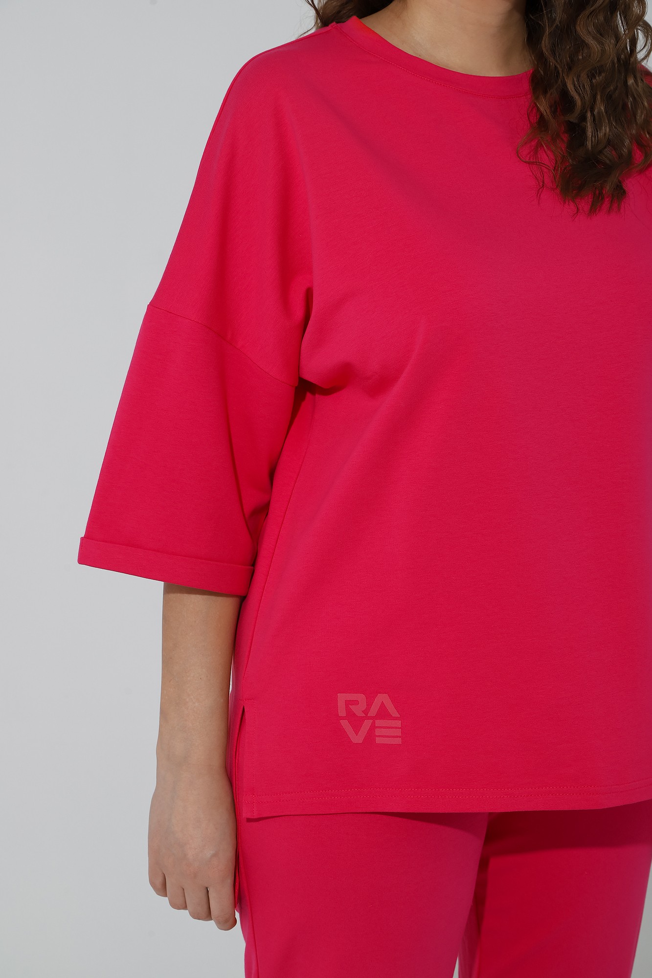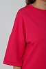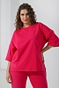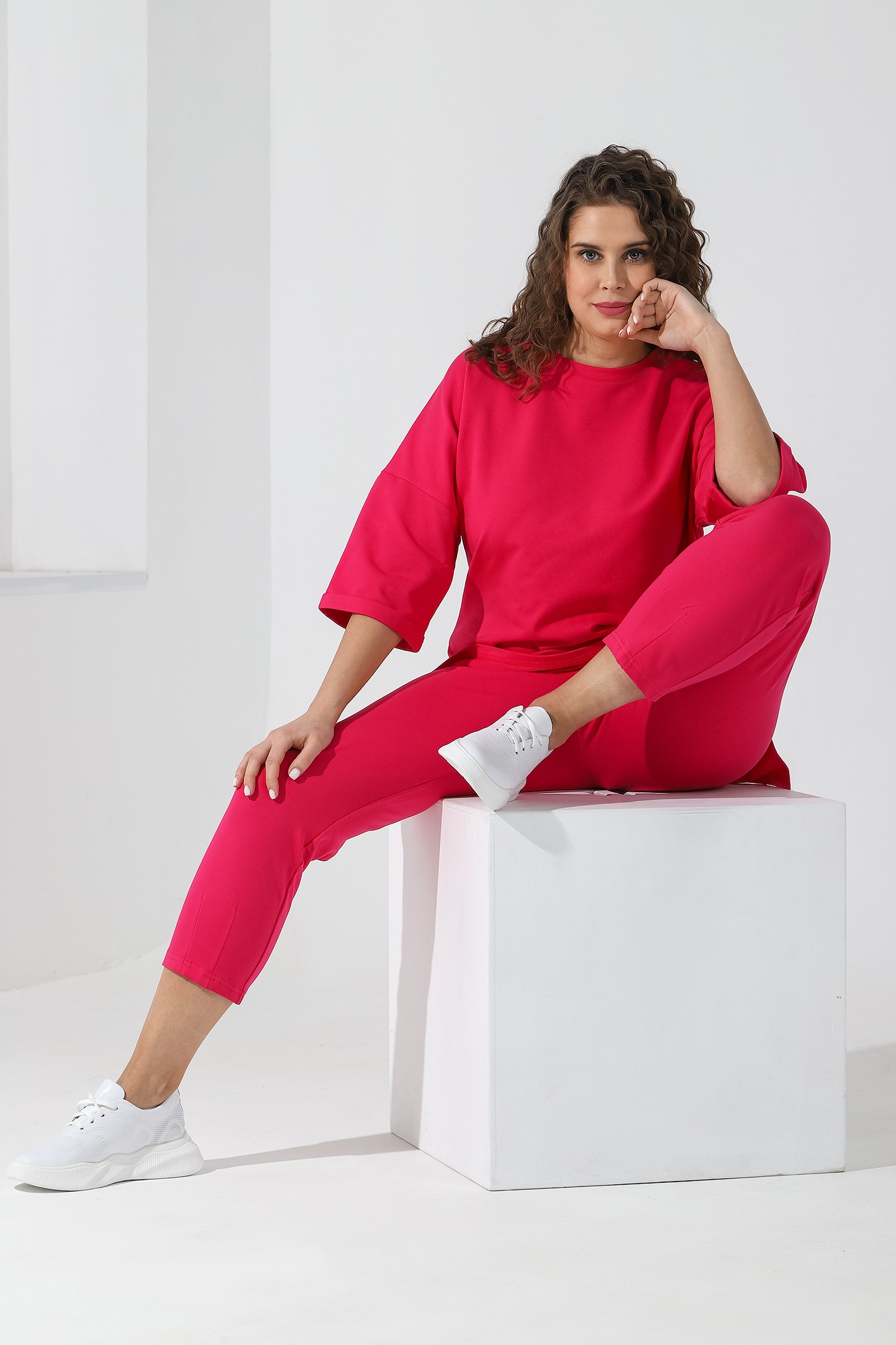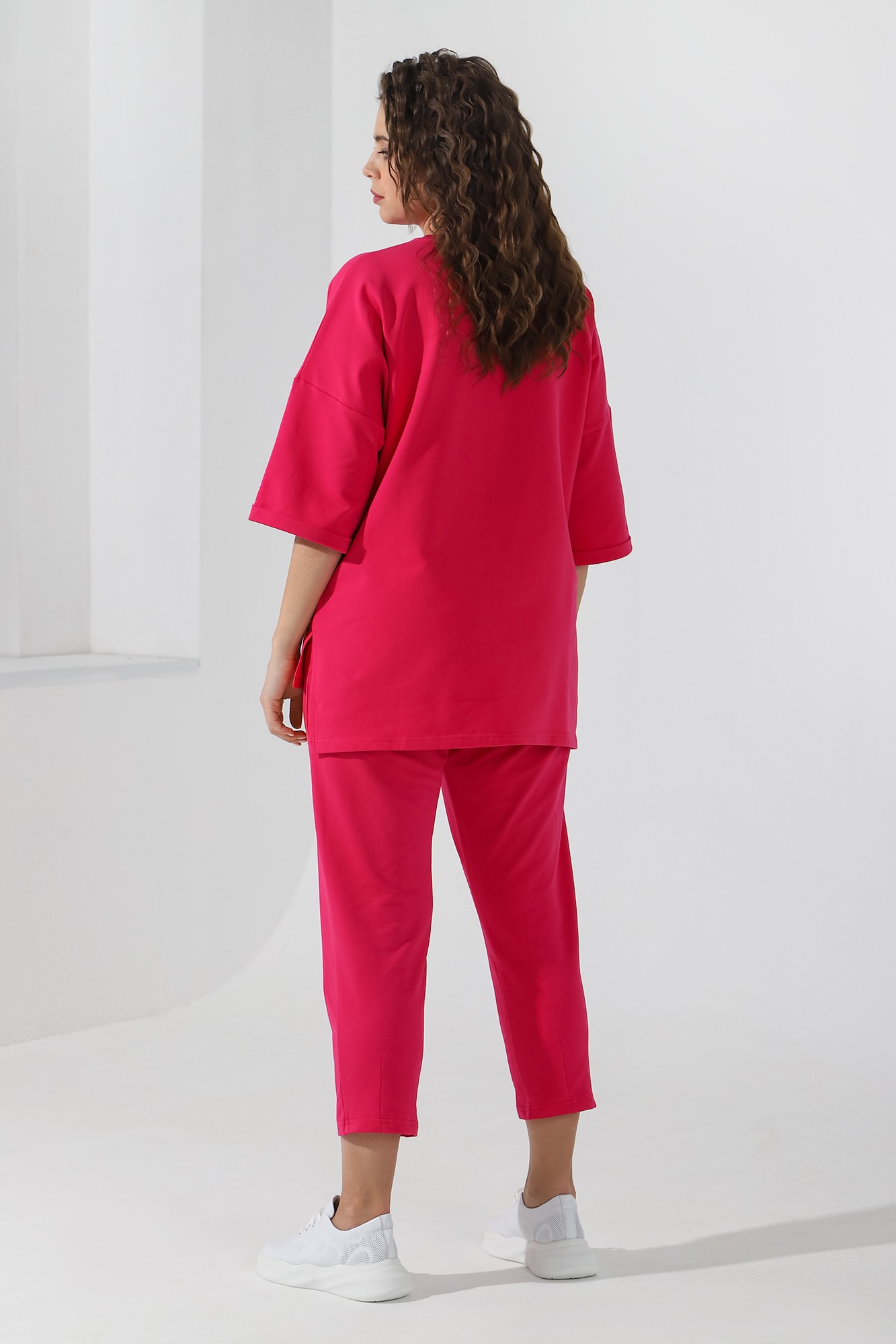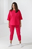 Костюм из гладкокрашеного трикотажного полотна «футер-двунитка», состоящий из джемпера и брюк. Джемпер – свободного покроя, с рукавами на основе цельнокроеных длиной до локтя, горловиной овальной формы, обработанной втачной планкой, разрезами в боковых швах и принтом на полочке. Рукава – с цельнокроеными манжетами-отворотами. Модный элемент- разность длины полочки и спинки на 10 см. Брюки – укороченные, на притачном поясе с эластичной тесьмой внутри и карманами в боковых швах. На нижних частях передних и задних половин обработано по две вертикальные вытачки.