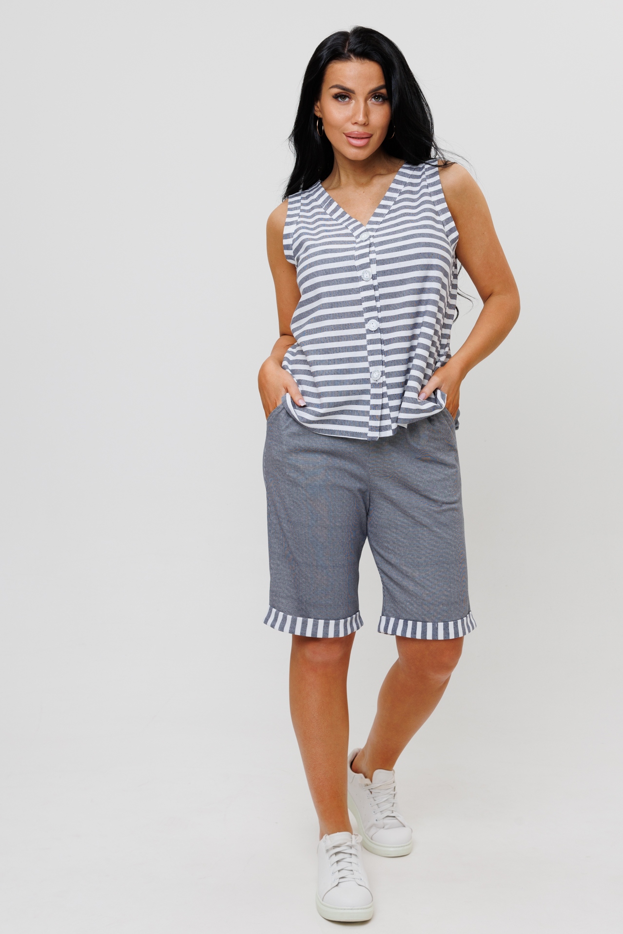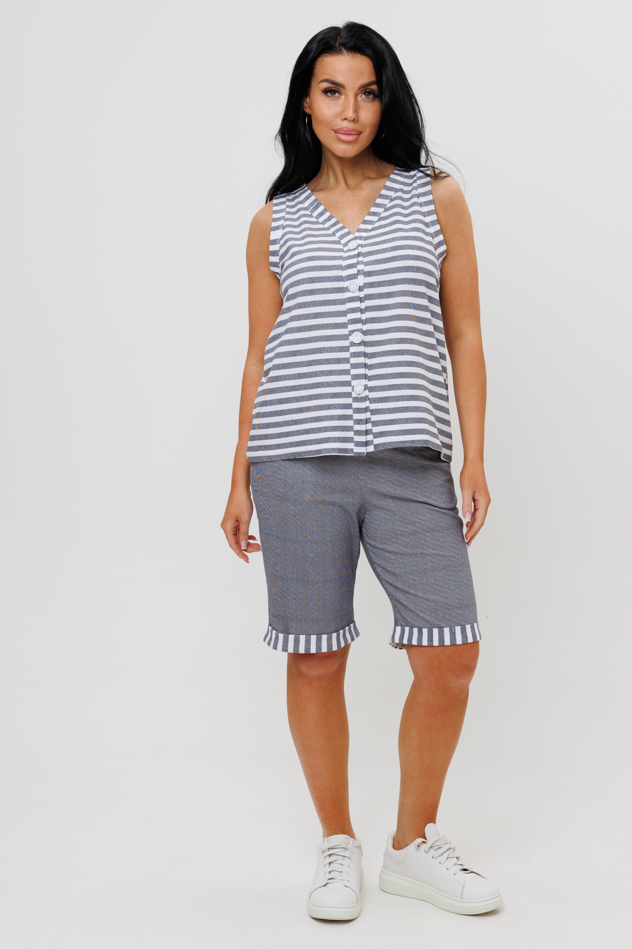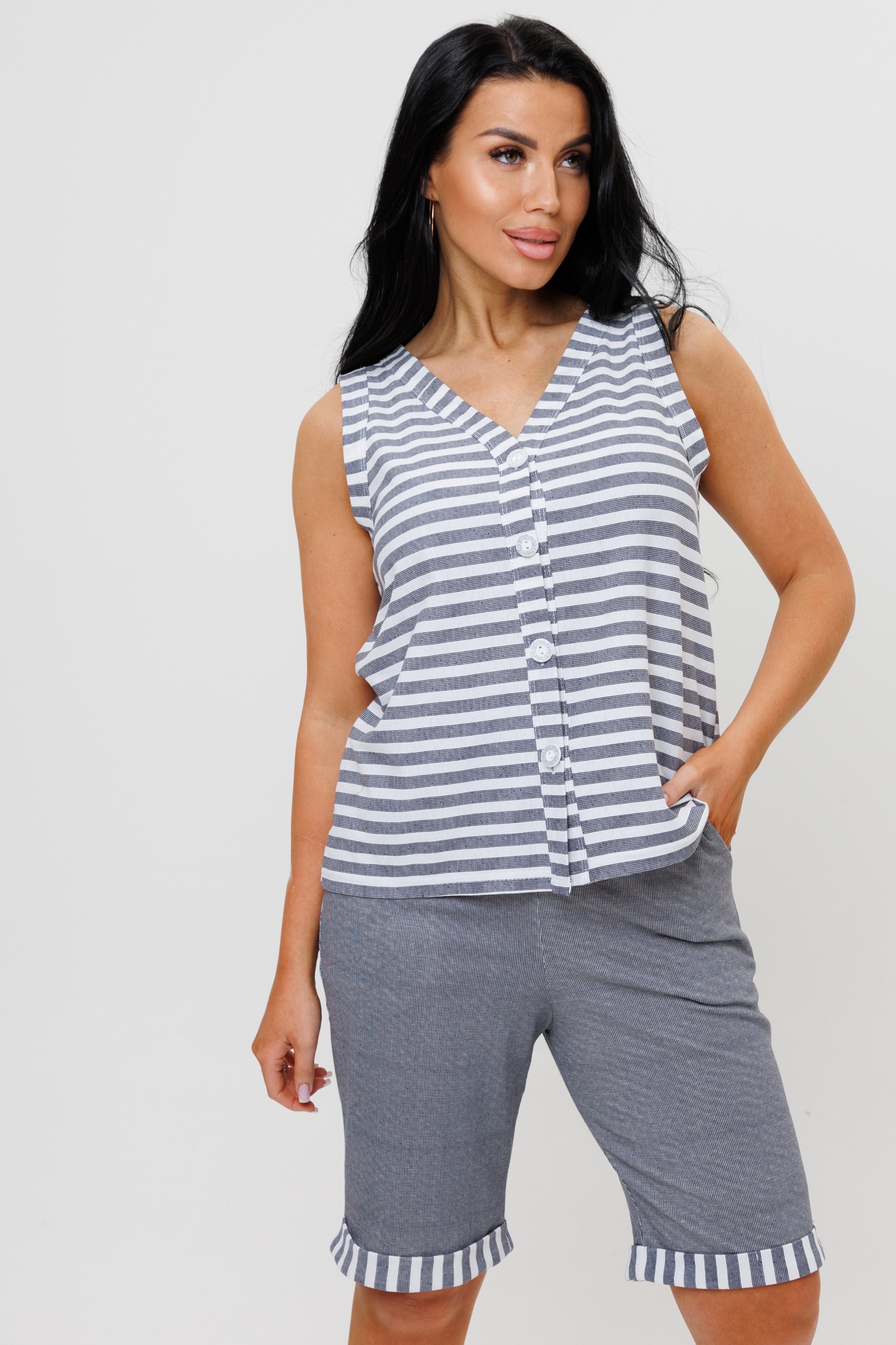Летний женский костюм с бермудами - это идеальный вариант одежды для женщин, любящих комфортные и стильные вещи. Он подойдет для повседневных прогулок и дома. Костюм состоит из стильной рубашки на пуговицах без рукавов с V-образным вырезом и бермудов, выполненных из ткани компаньона, отделанных манжетами в тон рубашки.
