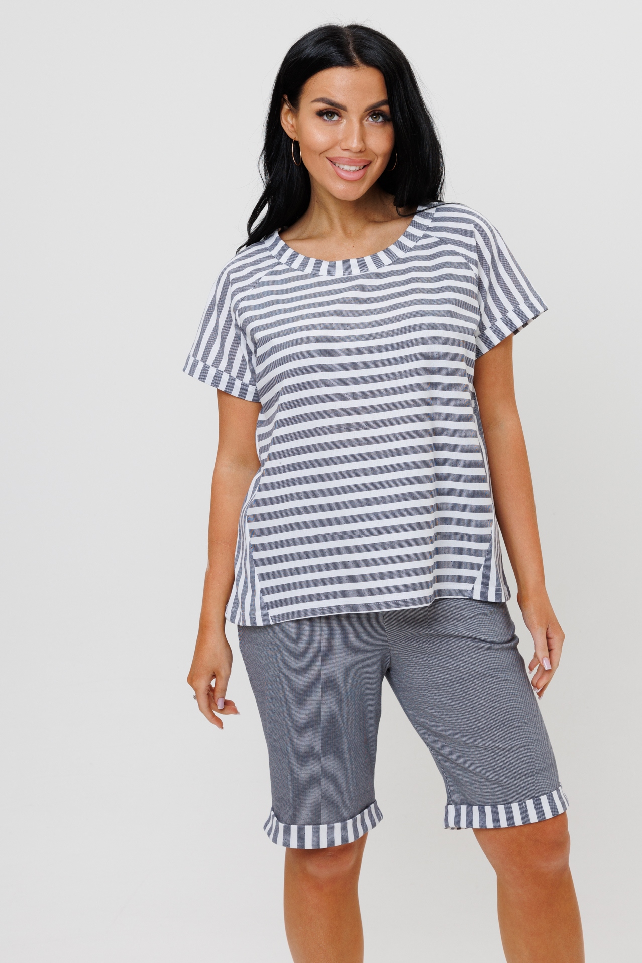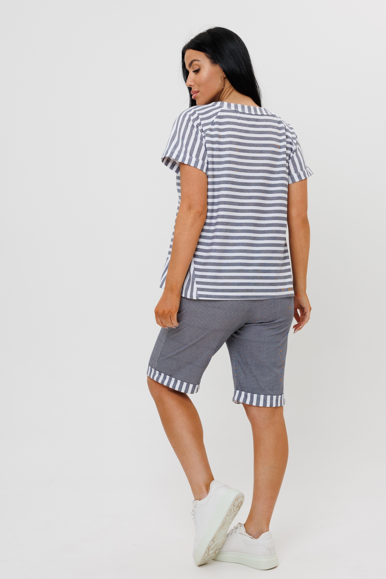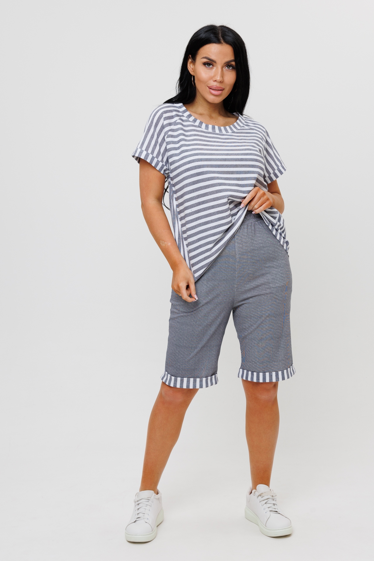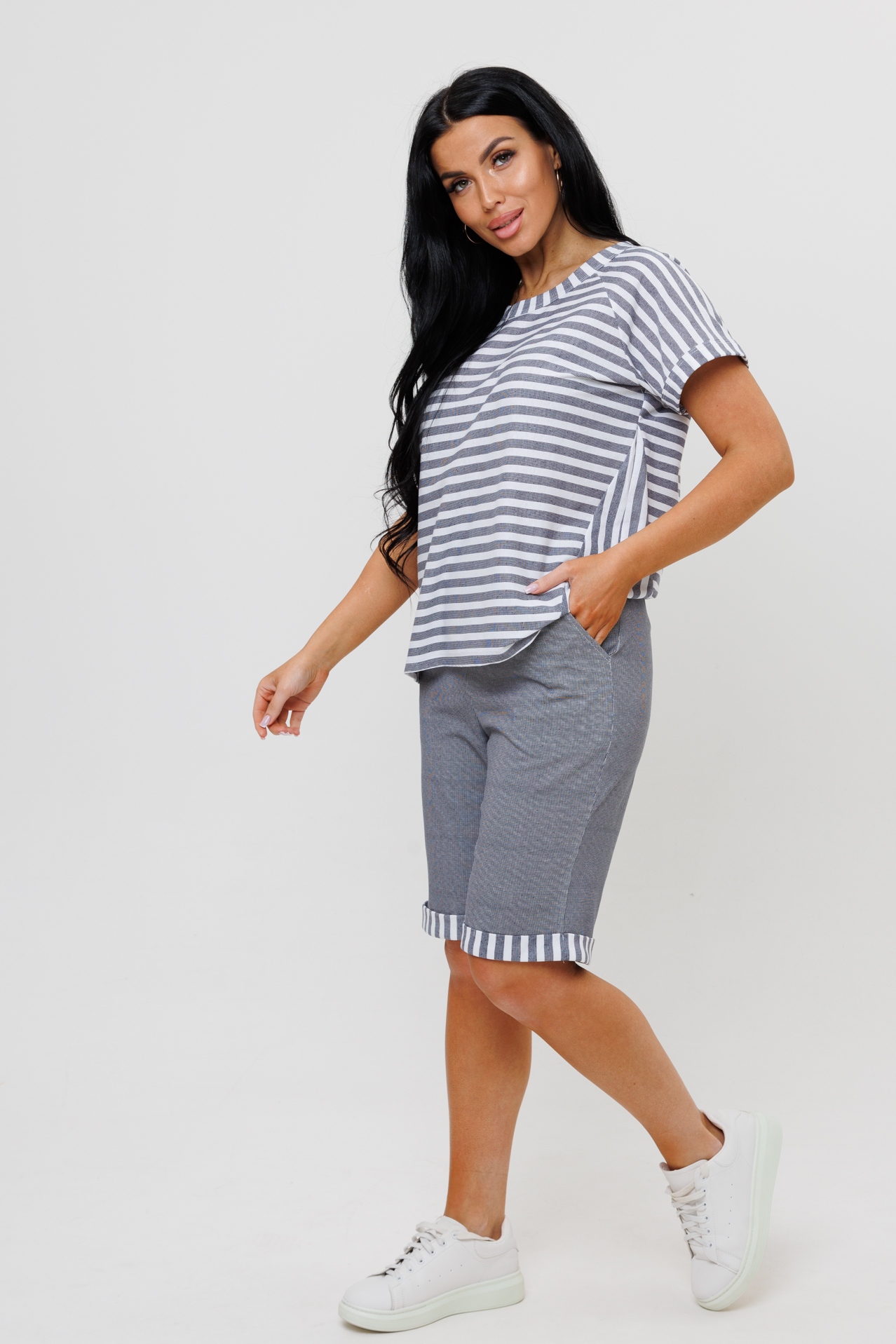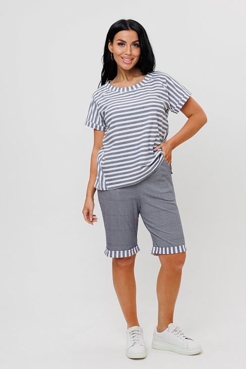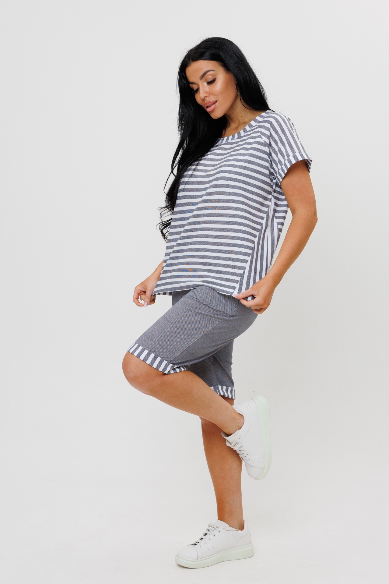 Женский костюм состоит из футболки и бермудов с карманами на резинке, выполненный из трикотажного хлопкового полотна. Костюм имеет прямой свободный силуэт, подходит женщинам, девушкам и беременным. Футболка декорирована боковыми вставками. Свободный короткий рукав реглан отделан манжетам. Бермуды сшиты из ткани компаньона. Низ бермуд подчеркивают манжеты, выполненные из ткани в тон футболки.