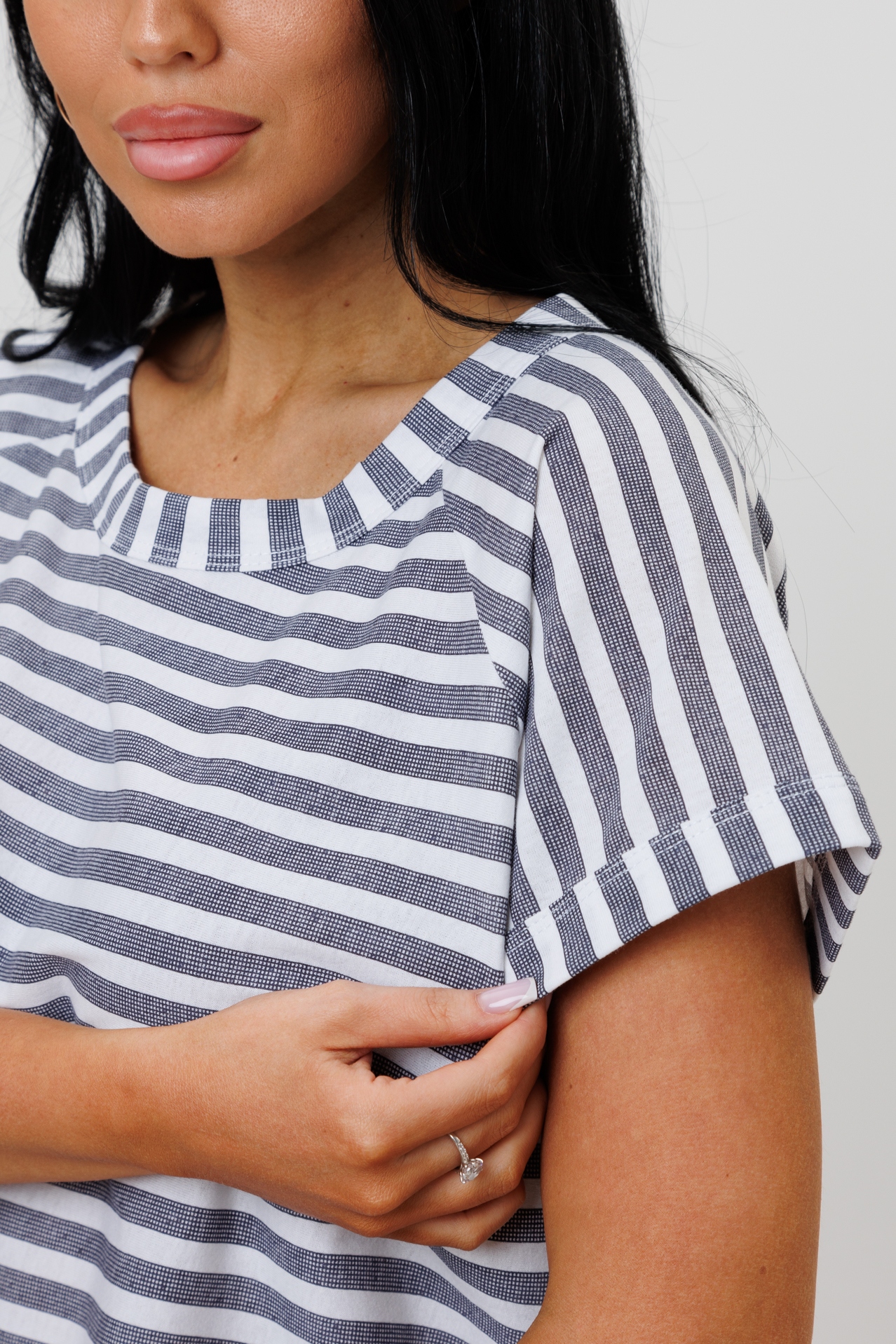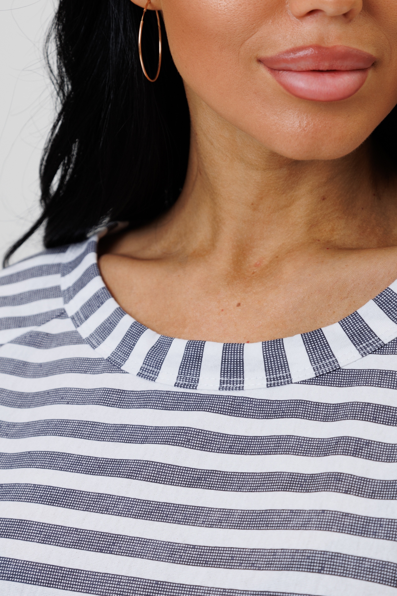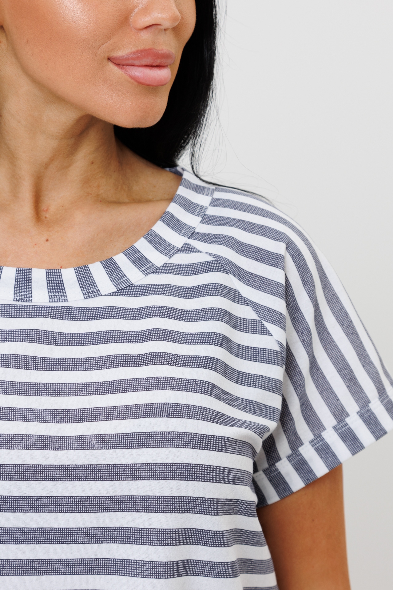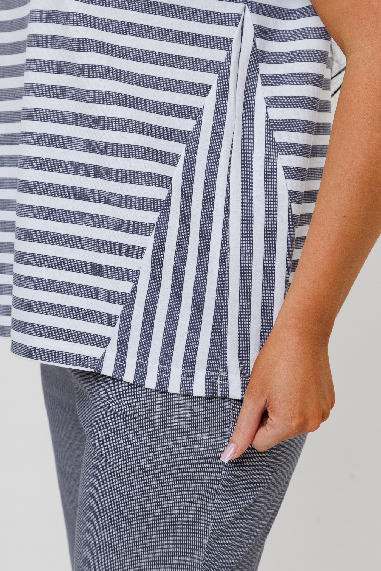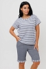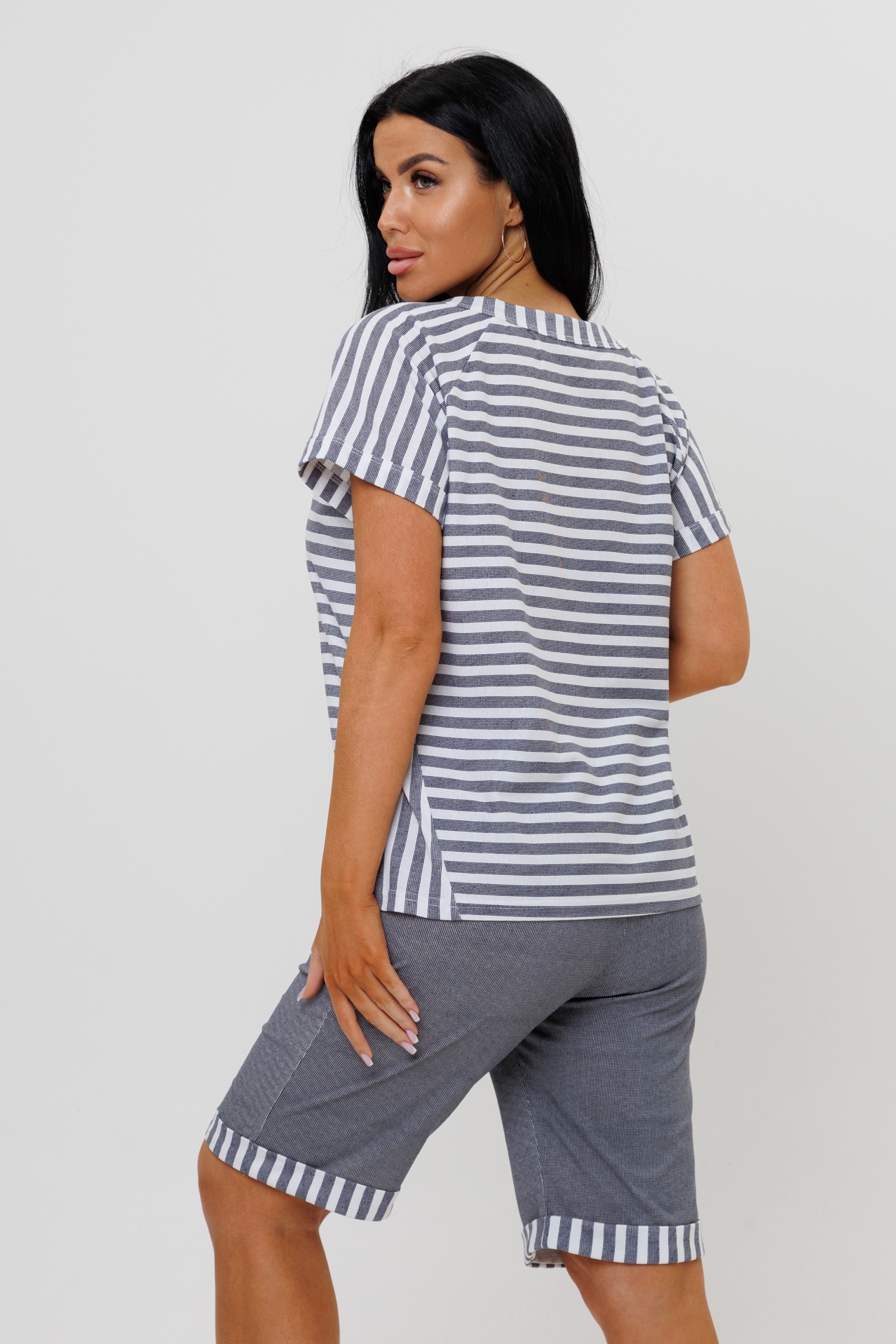 Женский костюм состоит из футболки и бермудов с карманами на резинке, выполненный из трикотажного хлопкового полотна. Костюм имеет прямой свободный силуэт, подходит женщинам, девушкам и беременным. Футболка декорирована боковыми вставками. Свободный короткий рукав реглан отделан манжетам. Бермуды сшиты из ткани компаньона. Низ бермуд подчеркивают манжеты, выполненные из ткани в тон футболки.
