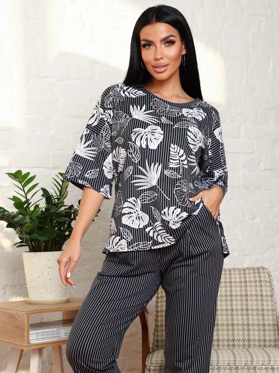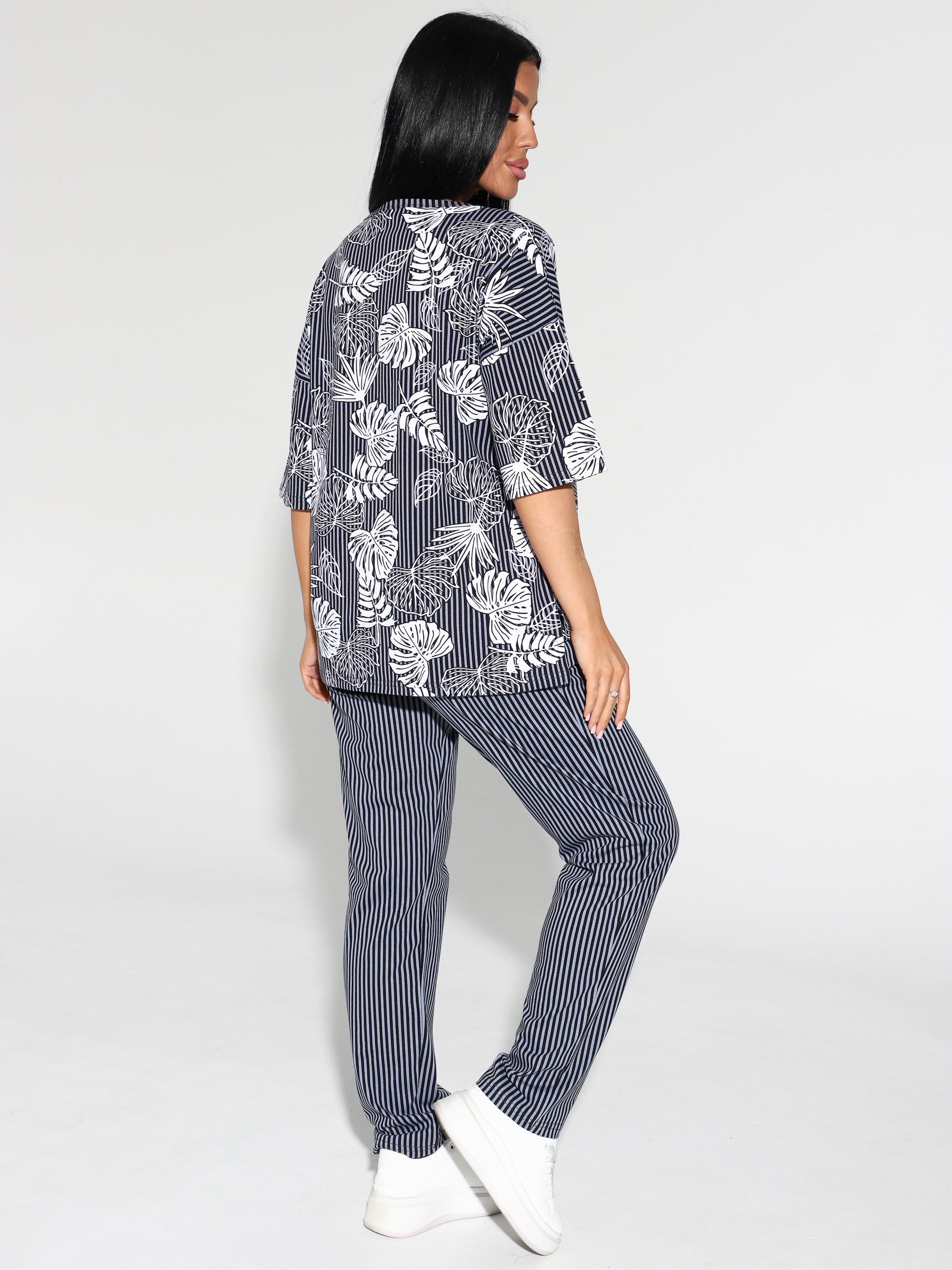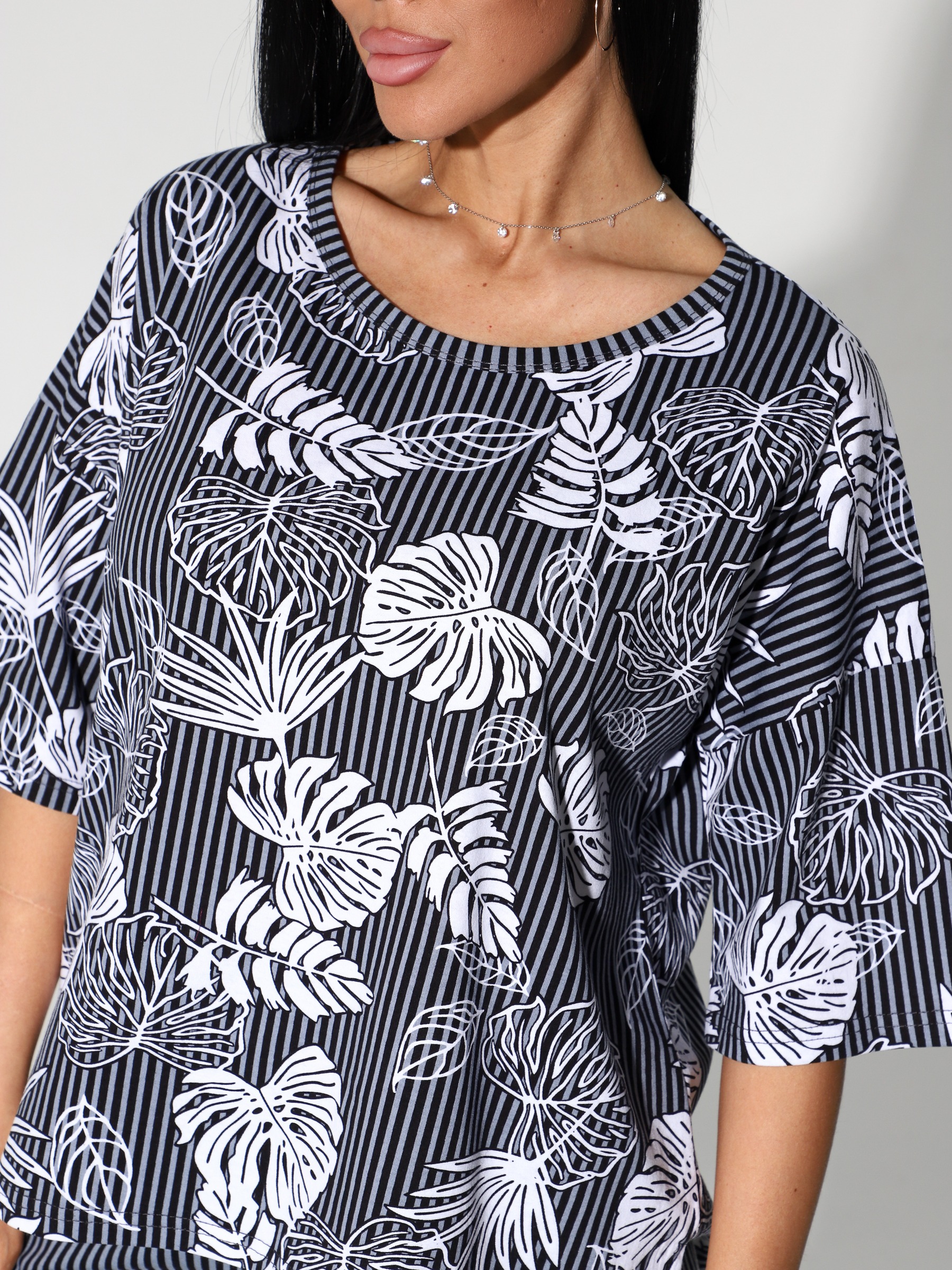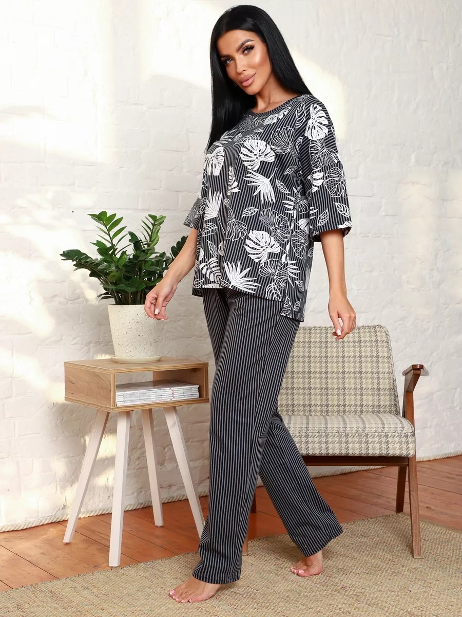 Женский костюм с брюками 1798/6 / Серый свободного силуэта, выполненный из качественных материалов-компаньонов. Модель включает в себя футболку и брюки.