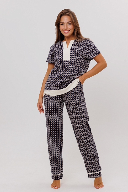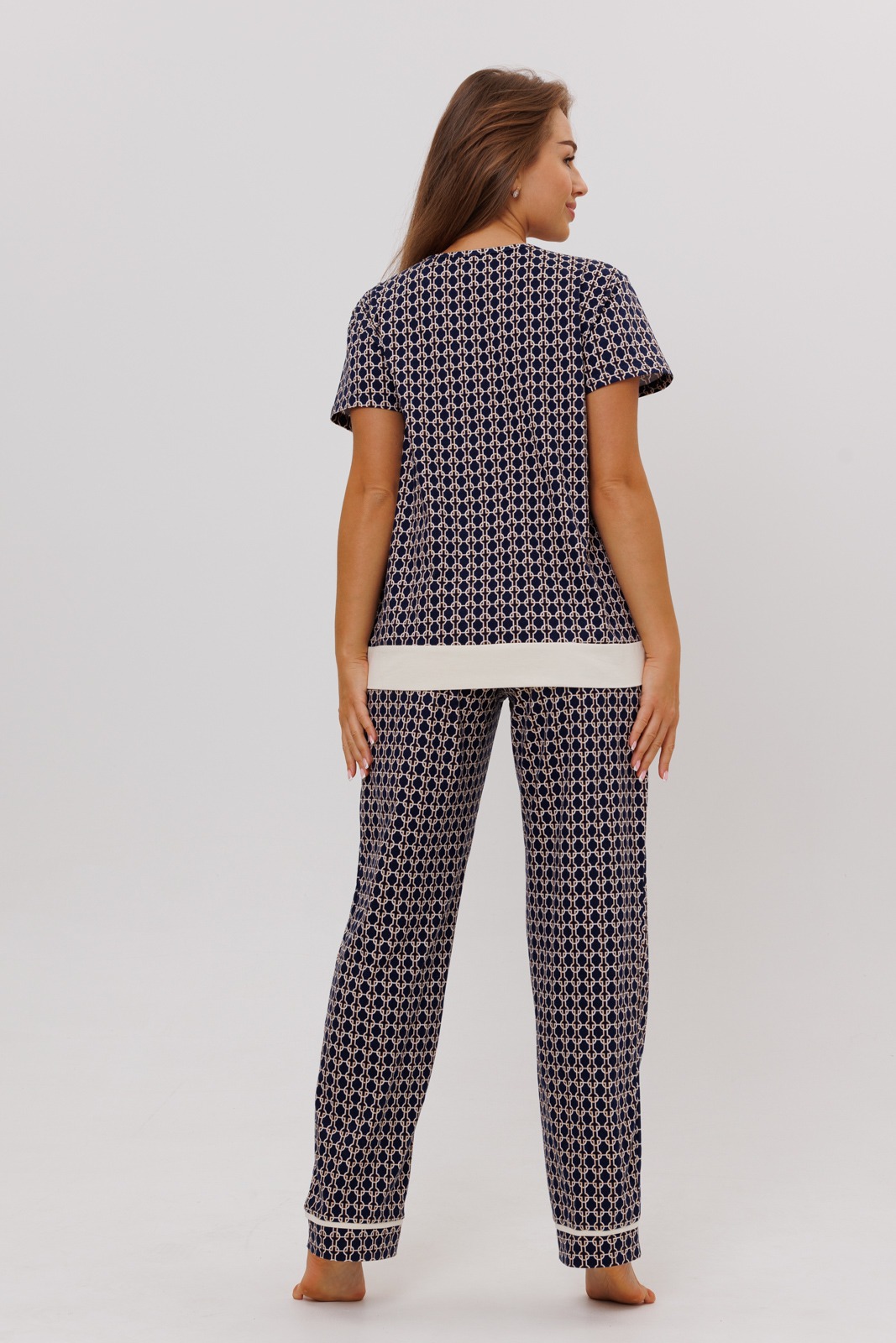 Женский домашний костюм с брюками 1842 / Темно-синий из 100% хлопковой ткани, состоит из футболки и прямых брюк.