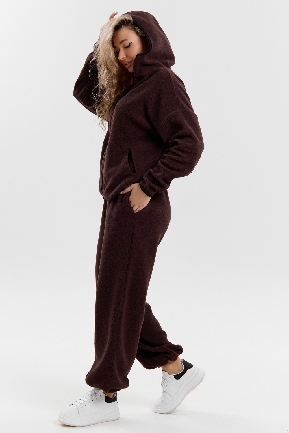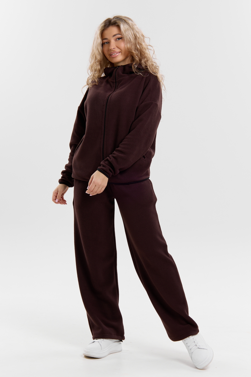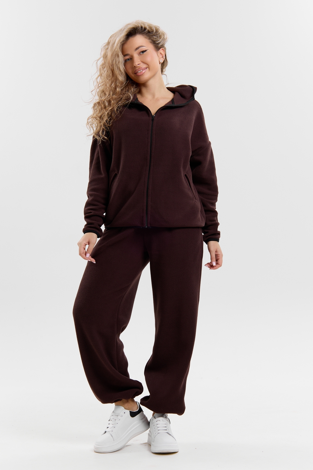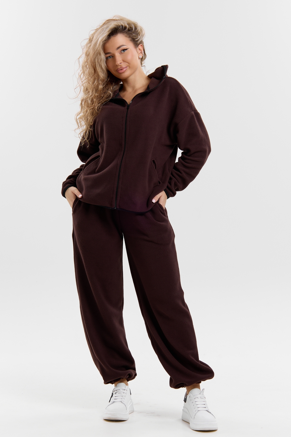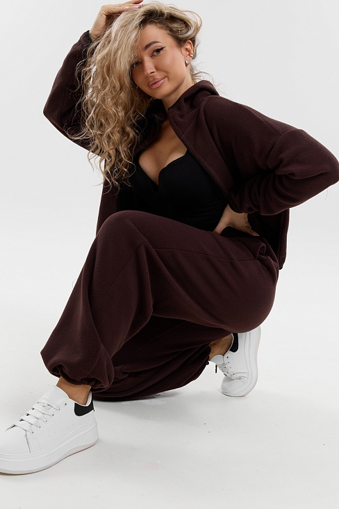 Флисовый костюм на молнии станет незаменимой вещью в вашем гардеробе. Костюм выполнен из плотной, мягкой ткани , что делает его очень теплым и приятным к телу. Благодаря высокому вороту, а также комфортному капюшону, надежно защитит ваше горло от прохлады в любое время года – будь то осень, весна, зима или прохладное лето. Качественная молния добавляет стильный акцент, а удобный замок обеспечивает легкое надевание и снятие. Резинка на поясе обеспечивает идеальную посадку и комфорт, брюки мягко облегают талию, не сдавливая и не сползая. Шнур на поясе добавляет не только стильный акцент, но и даёт возможность индивидуально регулировать посадку. Резинки на манжетах фиксируют брючины, затягивая с помощью фиксатора, создавая аккуратный новый образ. Такой крой визуально вытягивает ноги и придаёт образу собранность. Свободный фасон багги гарантирует свободу движений и комфорт в течение всего дня. Прорезные боковые карманы - незаменимый элемент для удобства. Они не выпирают, не утяжеляют силуэт и в то же время добавляют практичности. В них можно удобно разместить разные мелочи- это маленькая деталь, которая делает модель ещё более функциональной. Флисовый костюм помогает создавать стильные образы. Его универсальный крой позволяет использовать его как повседневную одежду для прогулок, так и для дома. Модный фасон подойдет для женщин любого телосложения.