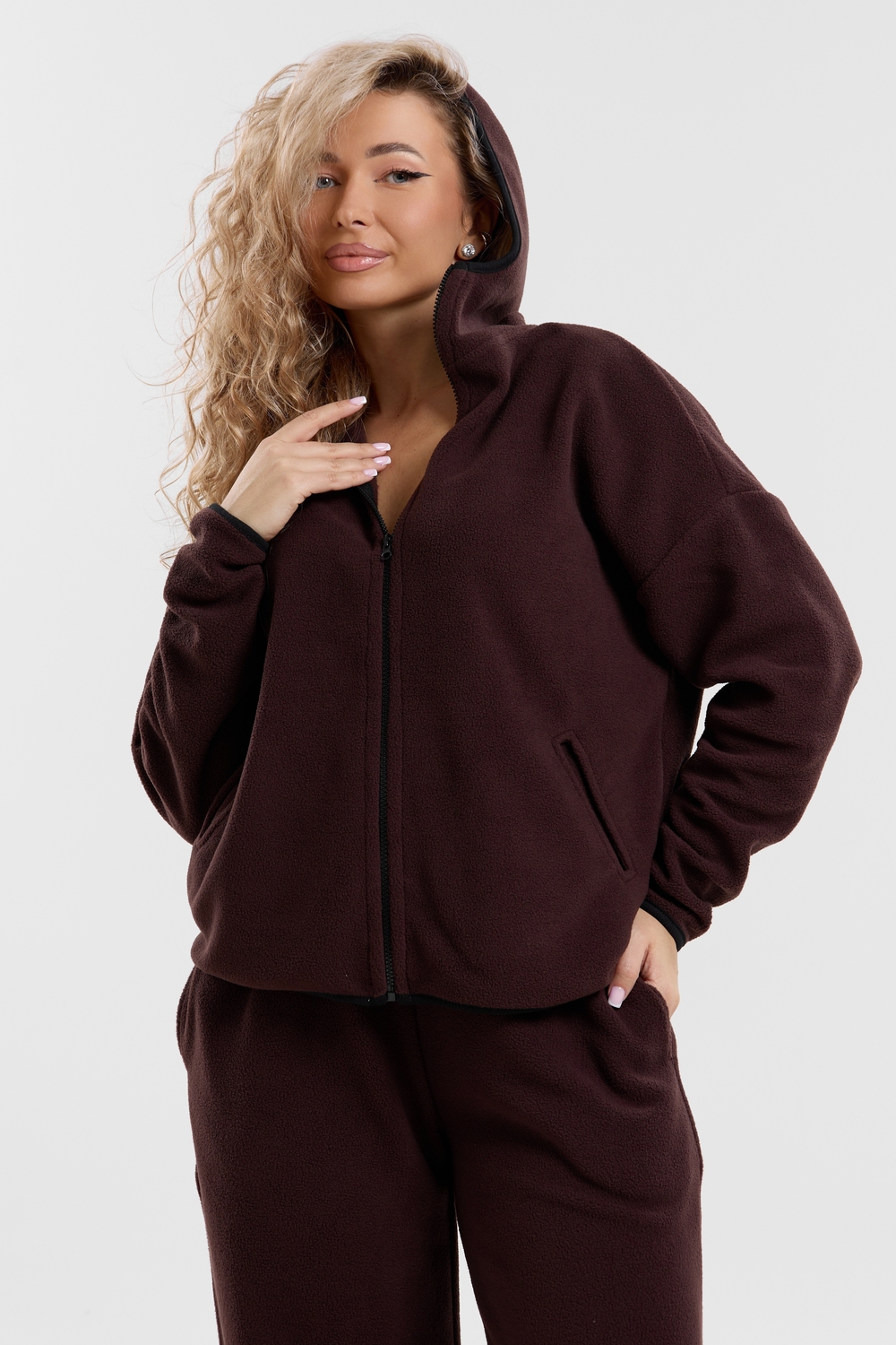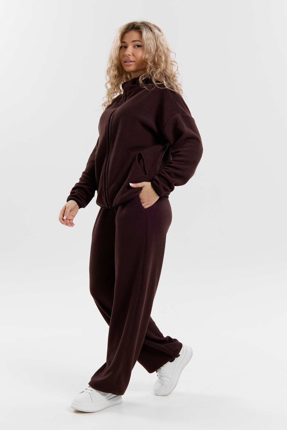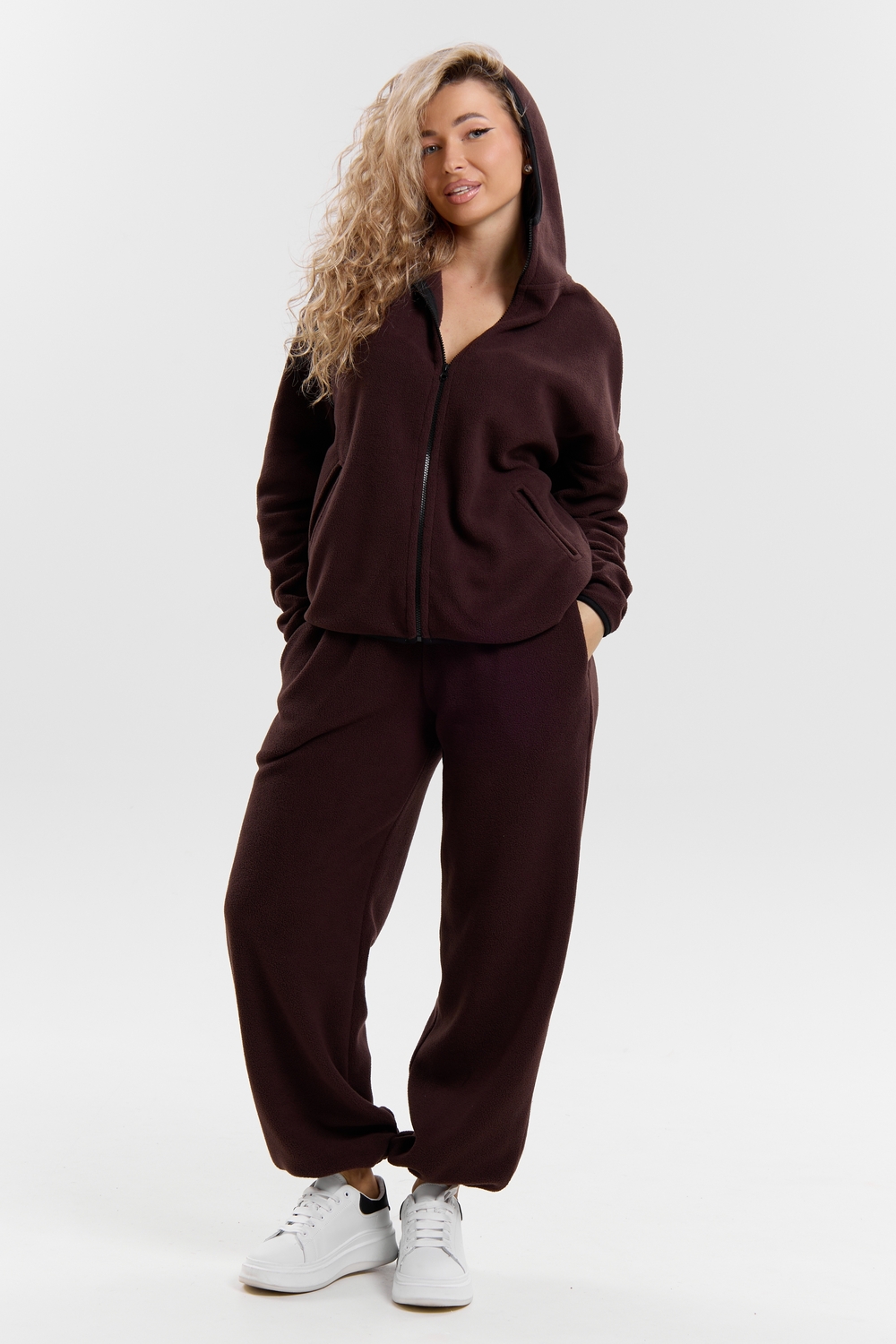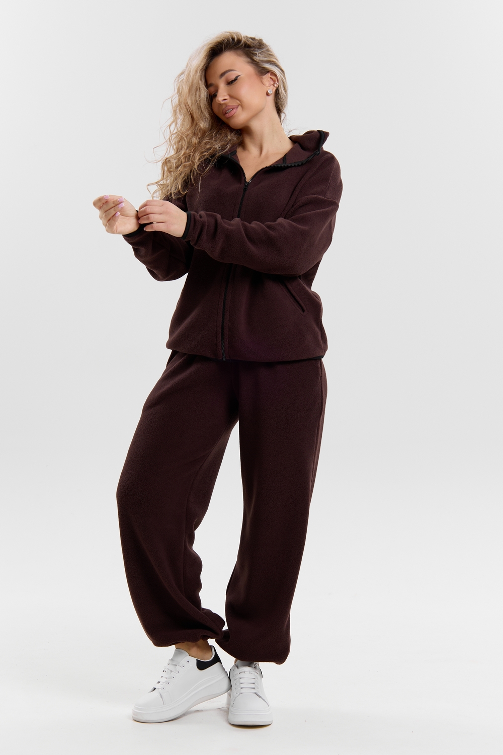 Флисовый костюм на молнии станет незаменимой вещью в вашем гардеробе. Костюм выполнен из плотной, мягкой ткани , что делает его очень теплым и приятным к телу. Благодаря высокому вороту, а также комфортному капюшону, надежно защитит ваше горло от прохлады в любое время года – будь то осень, весна, зима или прохладное лето. Качественная молния добавляет стильный акцент, а удобный замок обеспечивает легкое надевание и снятие. Резинка на поясе обеспечивает идеальную посадку и комфорт, брюки мягко облегают талию, не сдавливая и не сползая. Шнур на поясе добавляет не только стильный акцент, но и даёт возможность индивидуально регулировать посадку. Резинки на манжетах фиксируют брючины, затягивая с помощью фиксатора, создавая аккуратный новый образ. Такой крой визуально вытягивает ноги и придаёт образу собранность. Свободный фасон багги гарантирует свободу движений и комфорт в течение всего дня. Прорезные боковые карманы - незаменимый элемент для удобства. Они не выпирают, не утяжеляют силуэт и в то же время добавляют практичности. В них можно удобно разместить разные мелочи- это маленькая деталь, которая делает модель ещё более функциональной. Флисовый костюм помогает создавать стильные образы. Его универсальный крой позволяет использовать его как повседневную одежду для прогулок, так и для дома. Модный фасон подойдет для женщин любого телосложения.