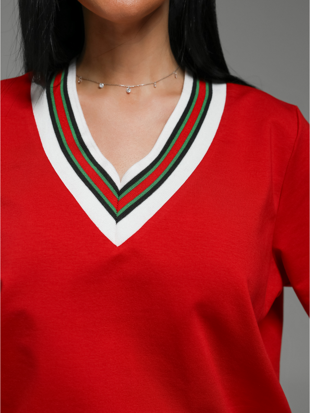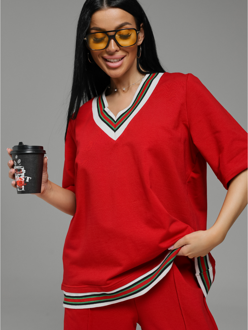 Костюм женский Сити состоит из футболки и брюк. Футболка свободного кроя, с коротким рукавом и V-образным вырезом. Брюки прямые, с отрезным поясом, передние половинки с карманами.