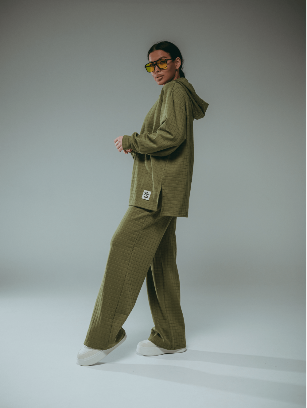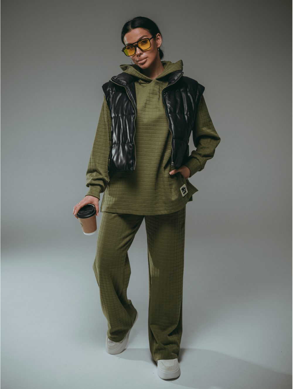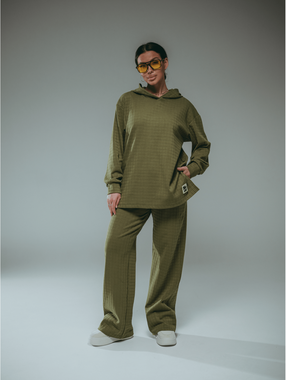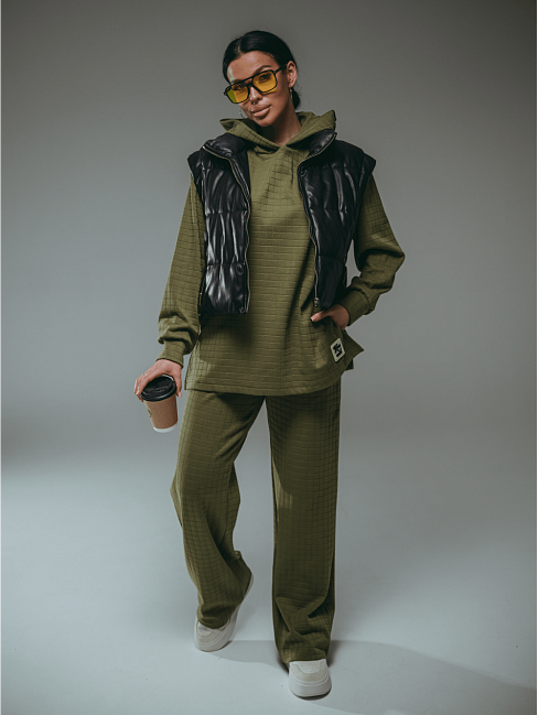Костюм женский Соната состоит из худи и брюк. Худи – прямого кроя со спущенной линией плеча, длинным втачным рукавом на манжете .Брюки прямые от бедра, с отрезным поясом и карманами.