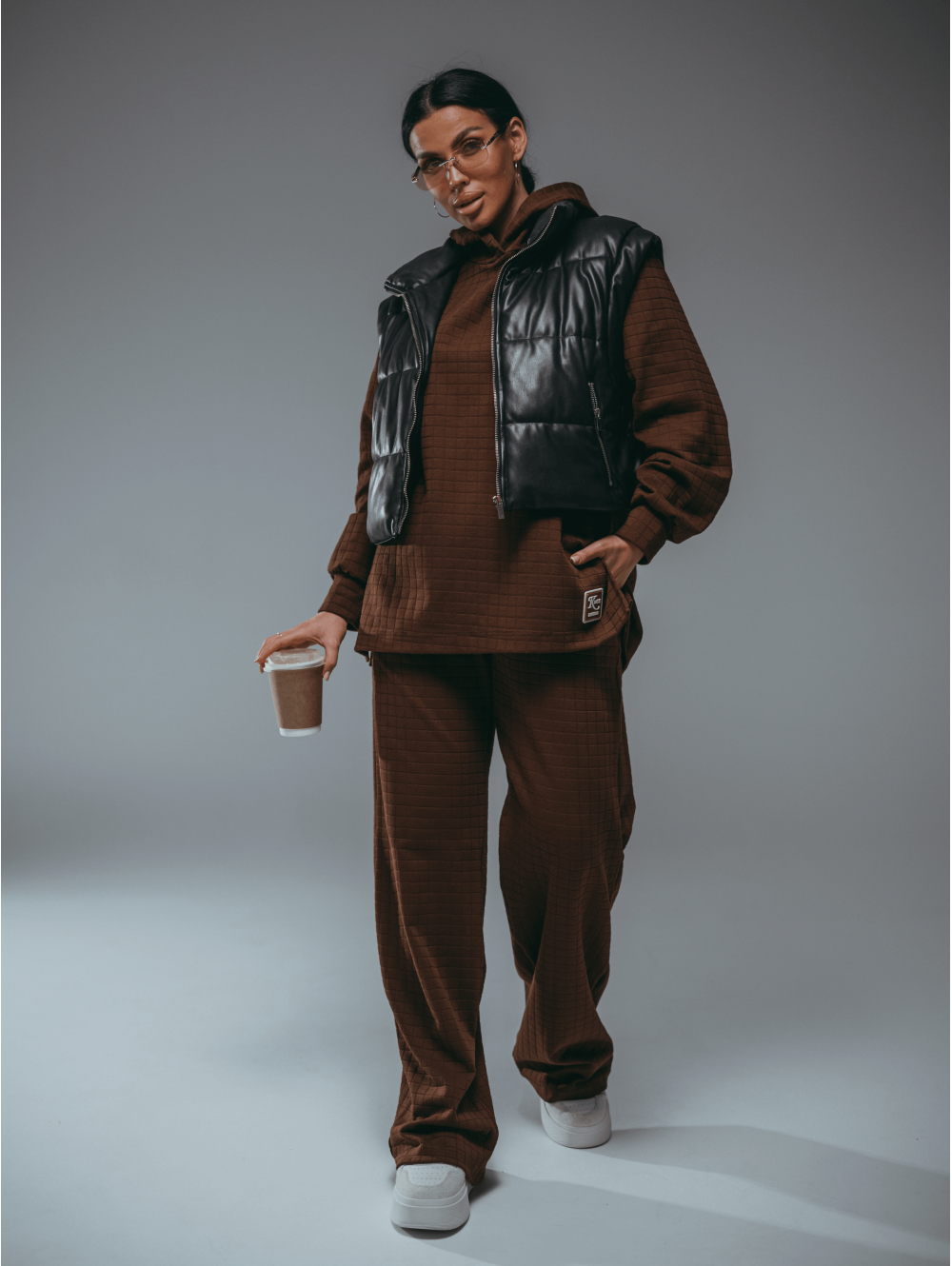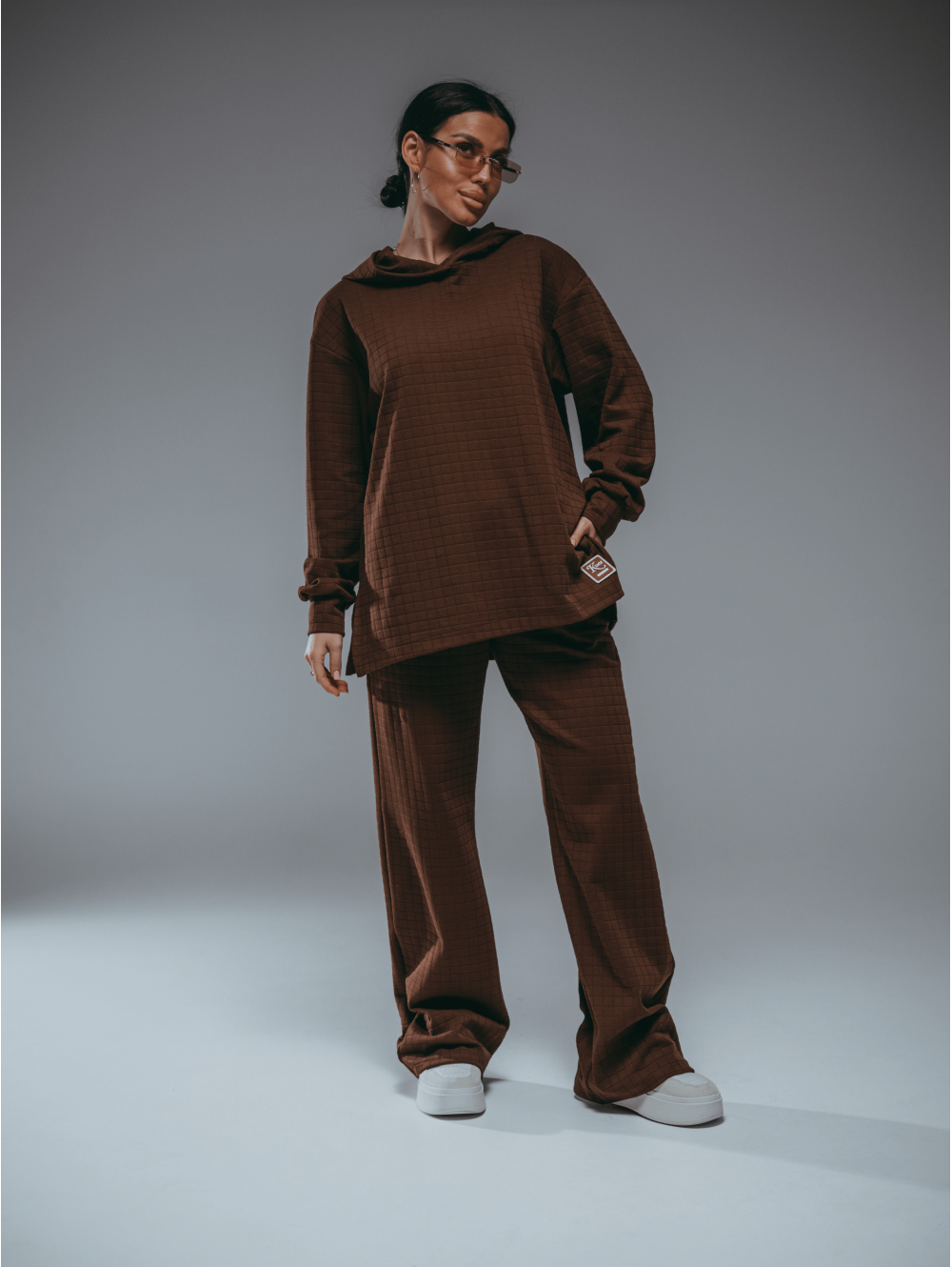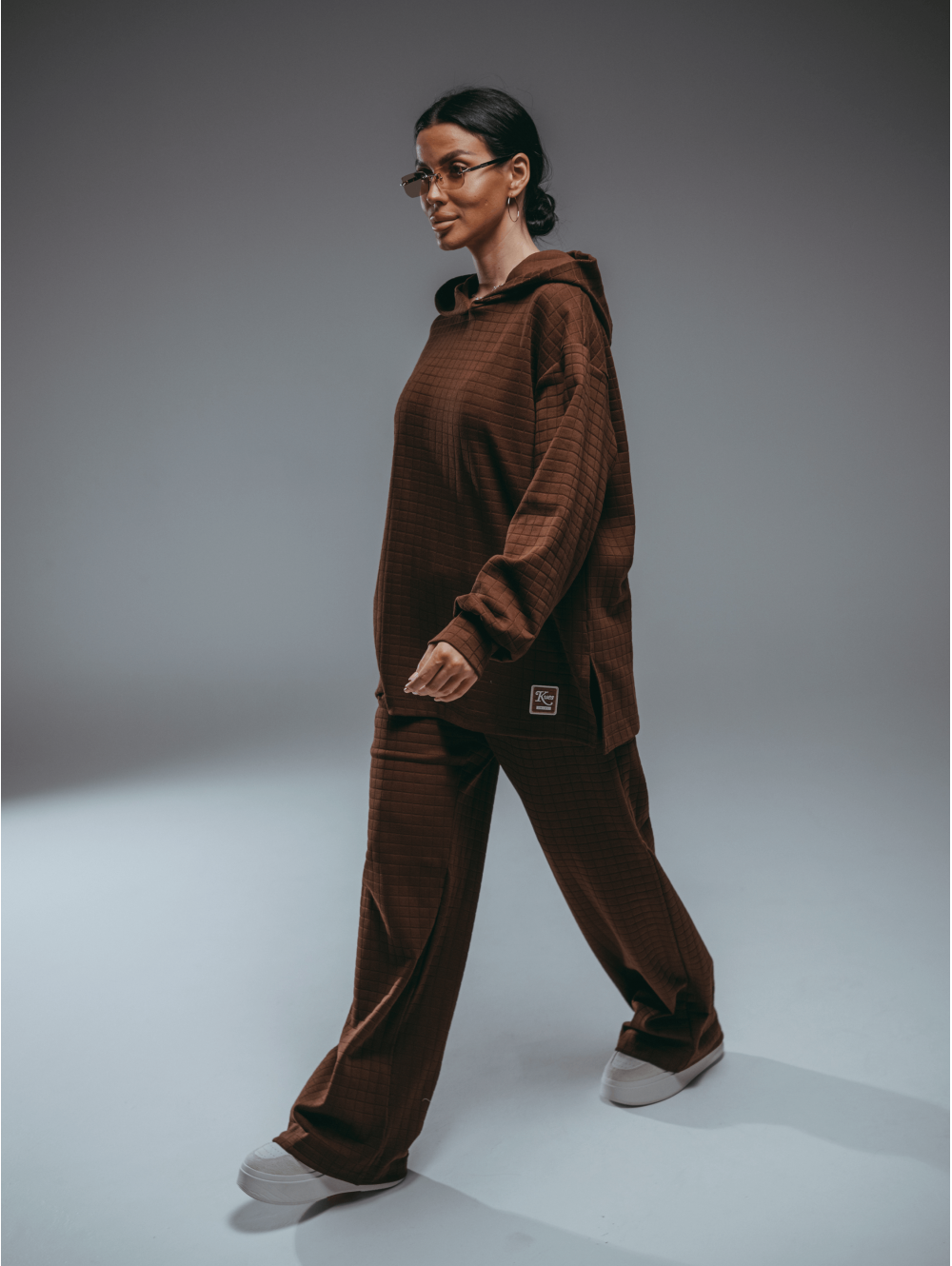 Костюм женский Соната состоит из худи и брюк. Худи – прямого кроя со спущенной линией плеча, длинным втачным рукавом на манжете .Брюки прямые от бедра, с отрезным поясом и карманами.