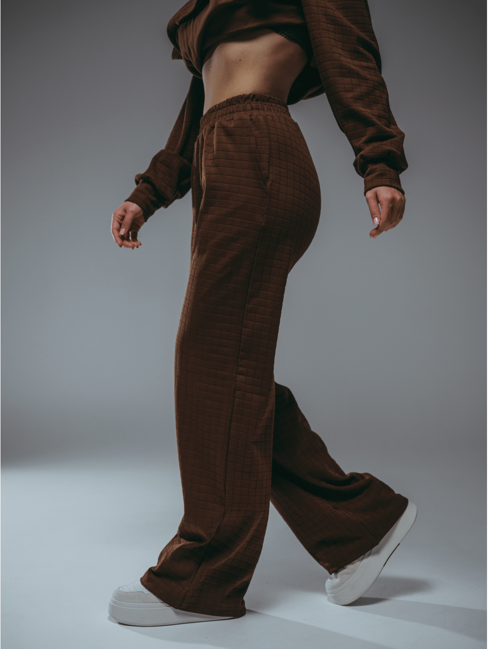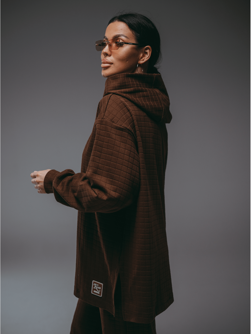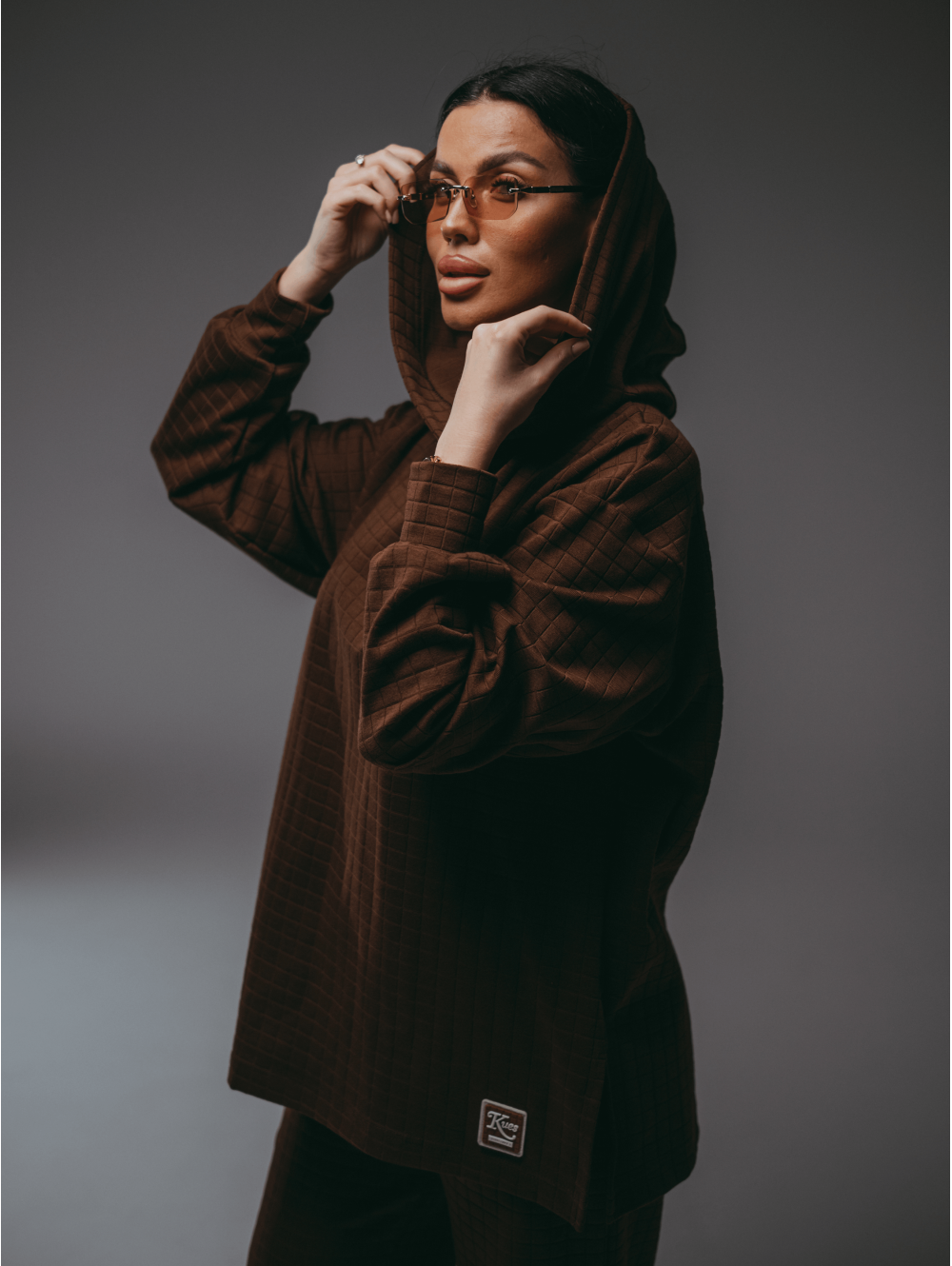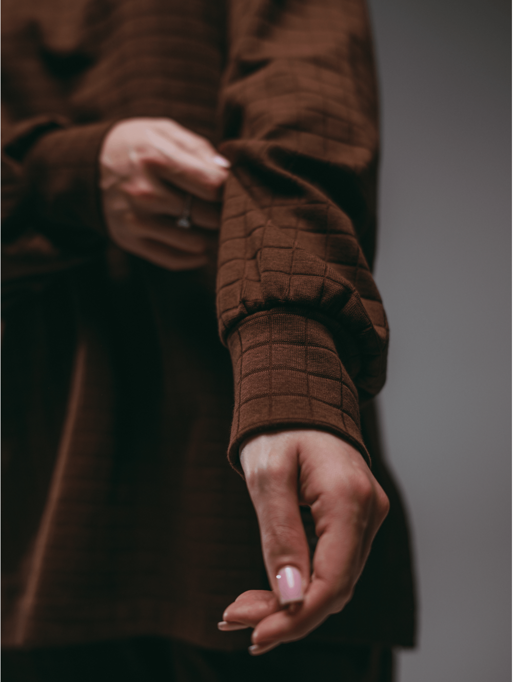 Костюм женский Соната состоит из худи и брюк. Худи – прямого кроя со спущенной линией плеча, длинным втачным рукавом на манжете .Брюки прямые от бедра, с отрезным поясом и карманами.