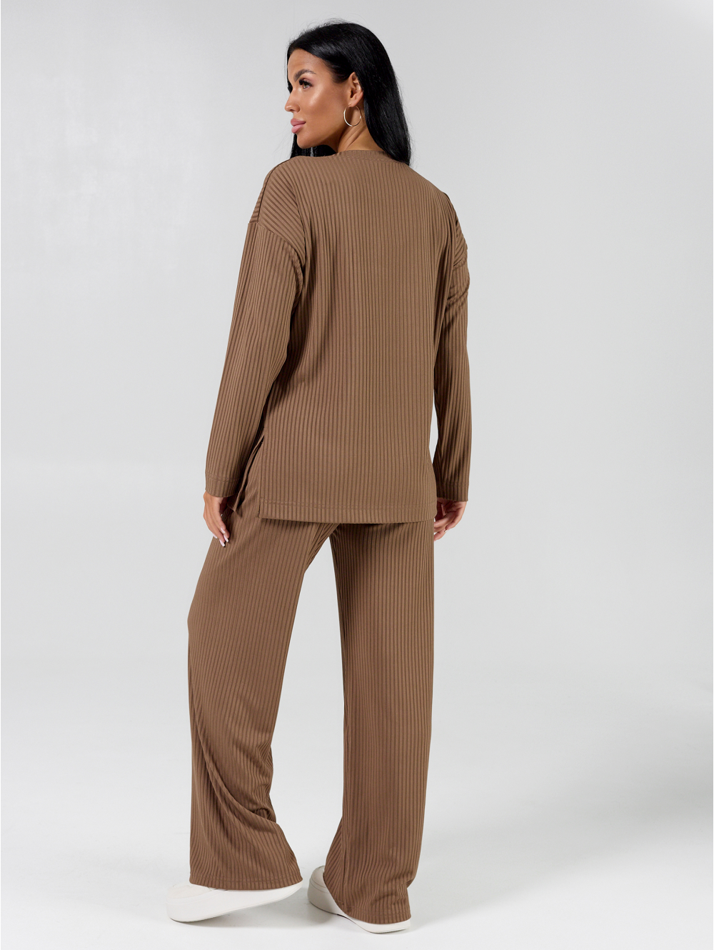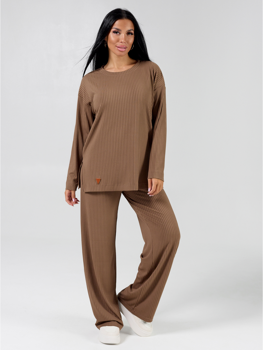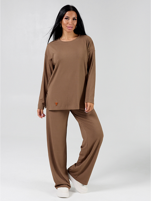 Трикотажный женский костюм Статус из лапши кашкорсе: широкие брюки палаццо с высокой посадкой с мягкой резинкой на поясе + свободный лонгслив в рубчик с длинным рукавом. Универсальный, легкий, удобный в ношении, не стесняет движений. Кофта и штаны свободного кроя создают очень уютное настроение. Скрывает недостатки и подчеркивает достоинства, идеально сядет на абсолютно разную фигуру и рост в любом возрасте. Каждый элемент костюма можно носить отдельно и сочетать с другими вещами в гардеробе. Подходит для создания как строгих, так и романтичных образов (носить с пиджаком и обувью на каблуке). Оптимальный вариант для отдыха, прогулок (просто добавь кроссовки, тренч и аксессуары) и путешествий. Широкий размерный ряд. Самые трендовые цвета. Мягкий и приятный к телу, его просто не захочется снимать. Позволит выглядеть вам на высоте при любых обстоятельствах. Костюм двойка для дома не колется, не мнётся и не вытягивается в коленях.