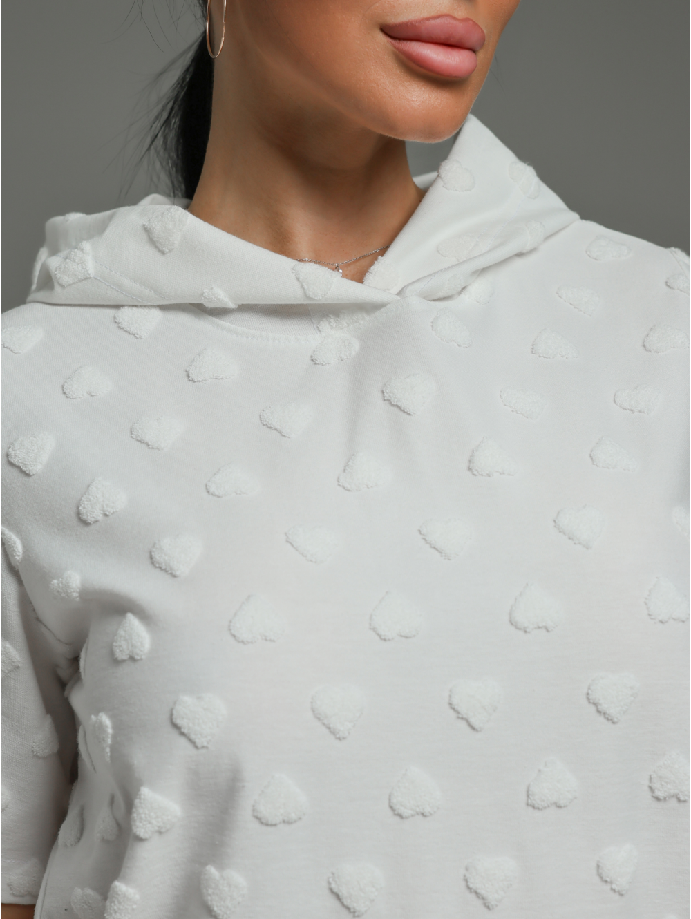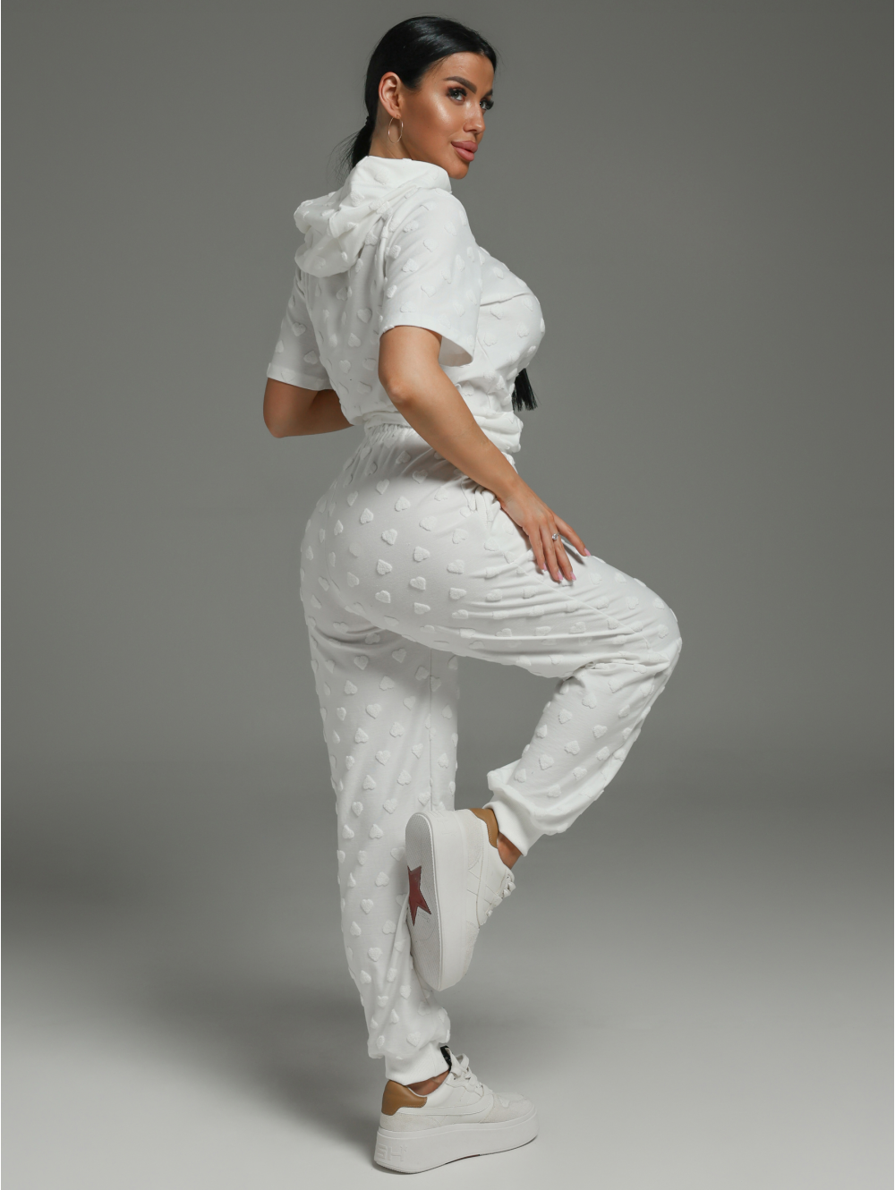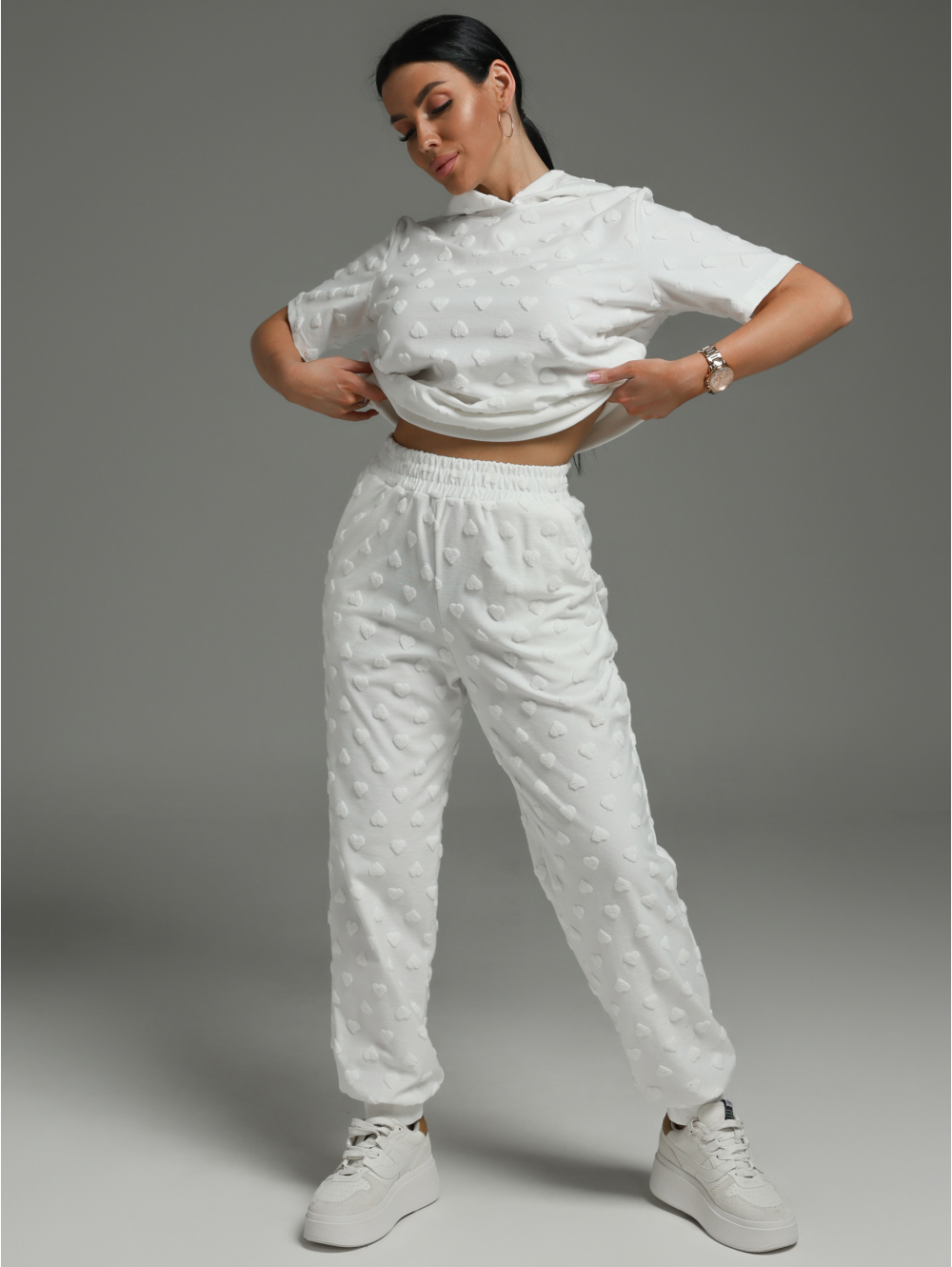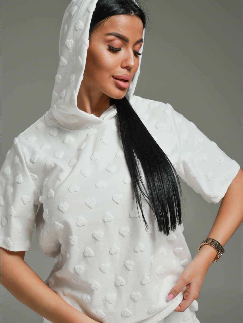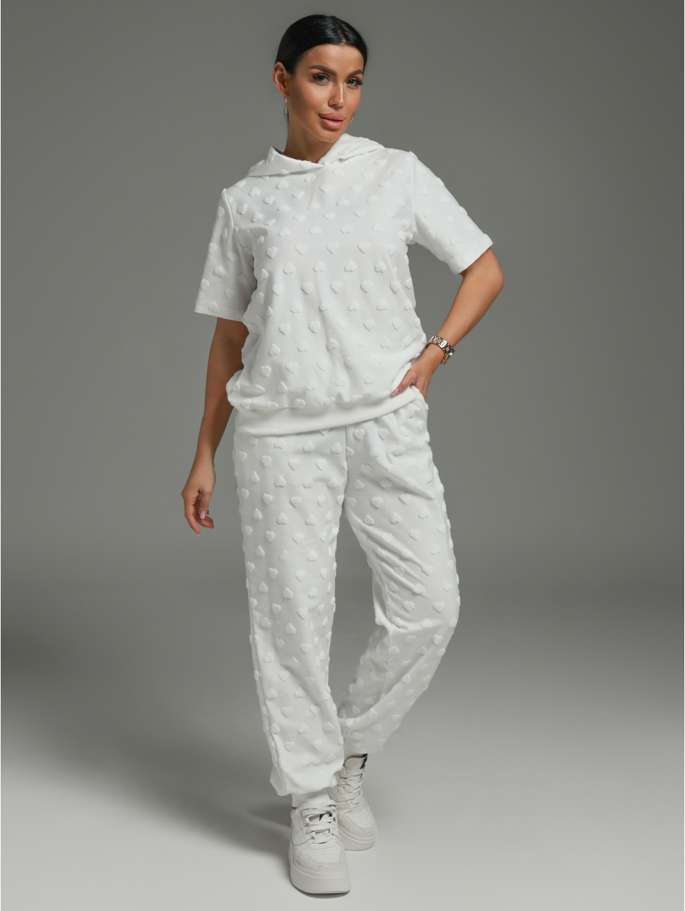Костюм женский Суфле состоит из футболки и брюк. Футболка прямого силуэта с коротким рукавом и капюшоном. Брюки свободного силуэта с карманами.
