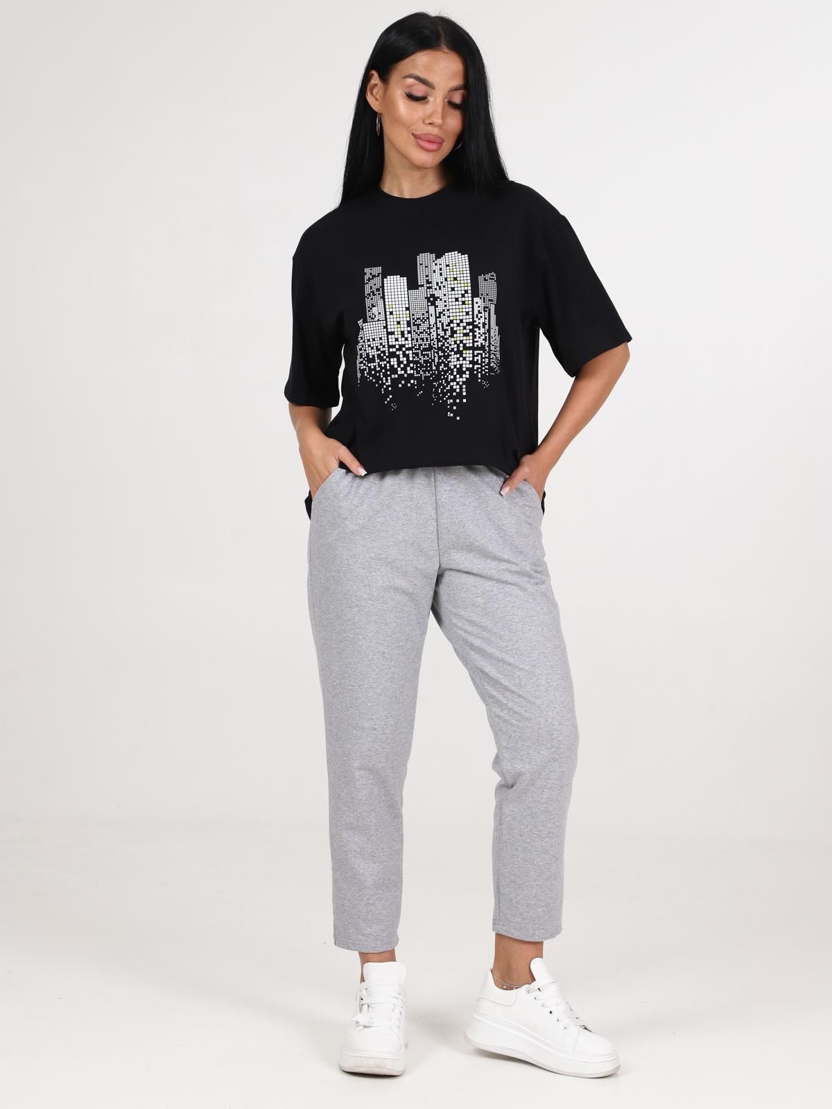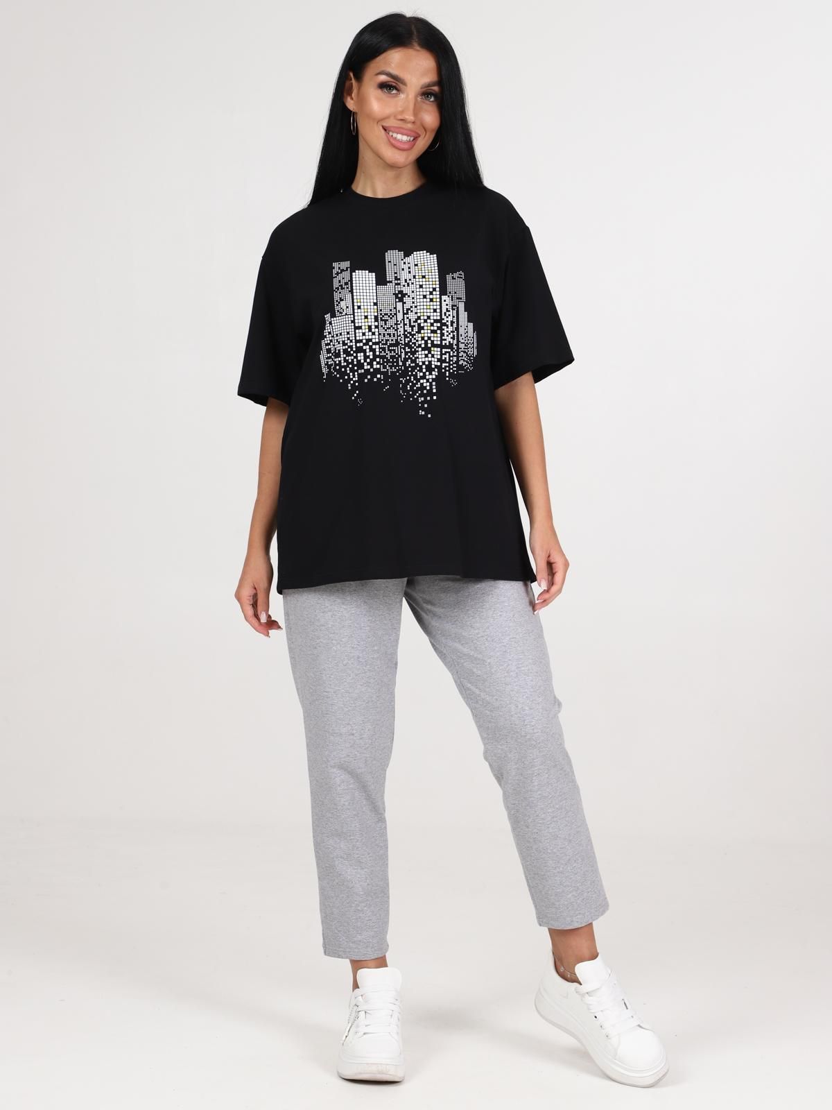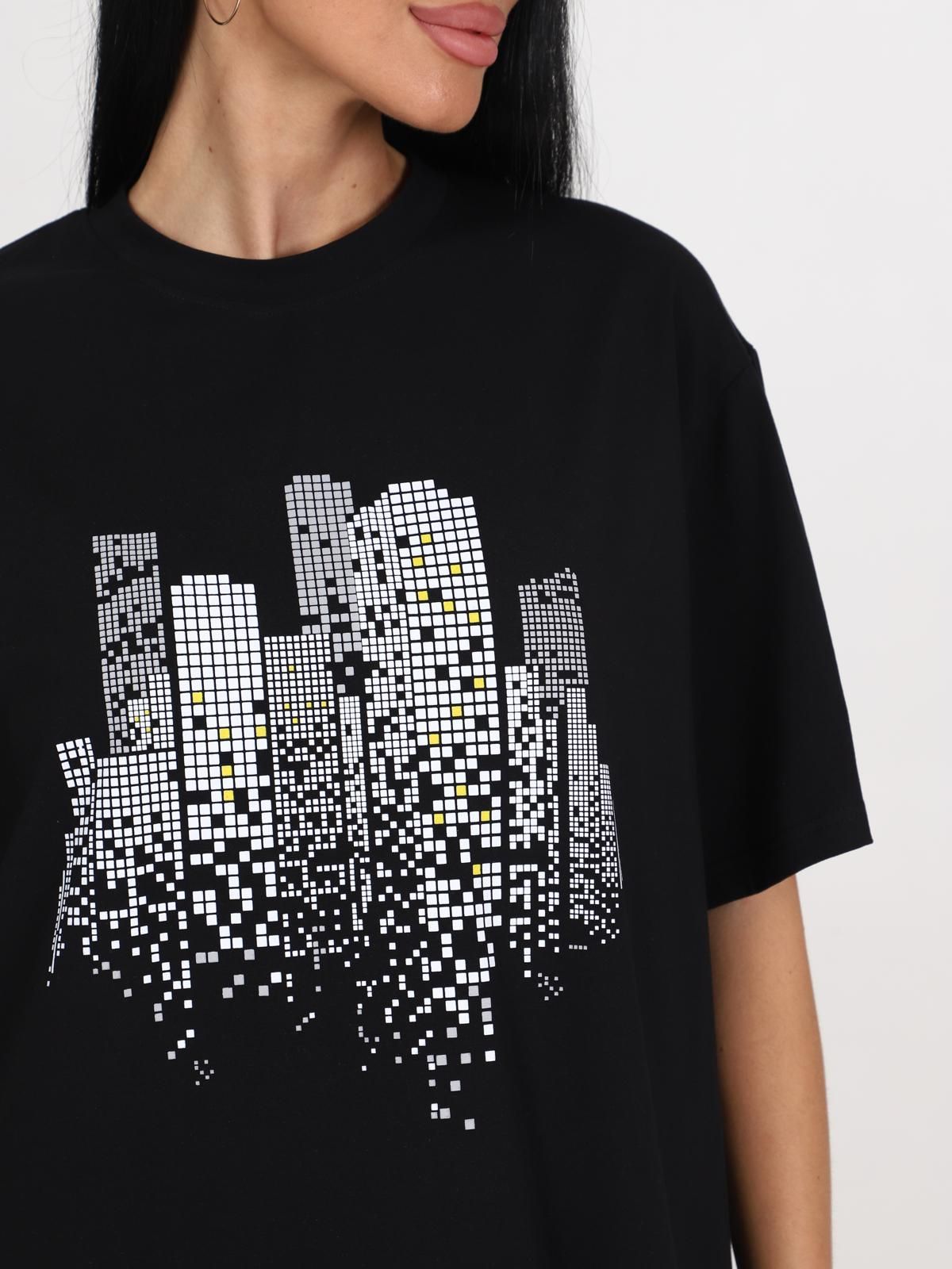 Женский костюм из свободного кроя с коротким рукавом и укороченных брюк. Особенность модели — крупный принт в виде пиксельного городского пейзажа (высотные здания) в бело-серых тонах. Силуэт оверсайз, что делает футболку удобной для повседневной носки.