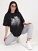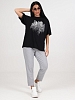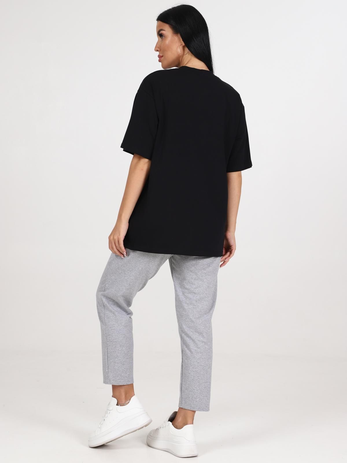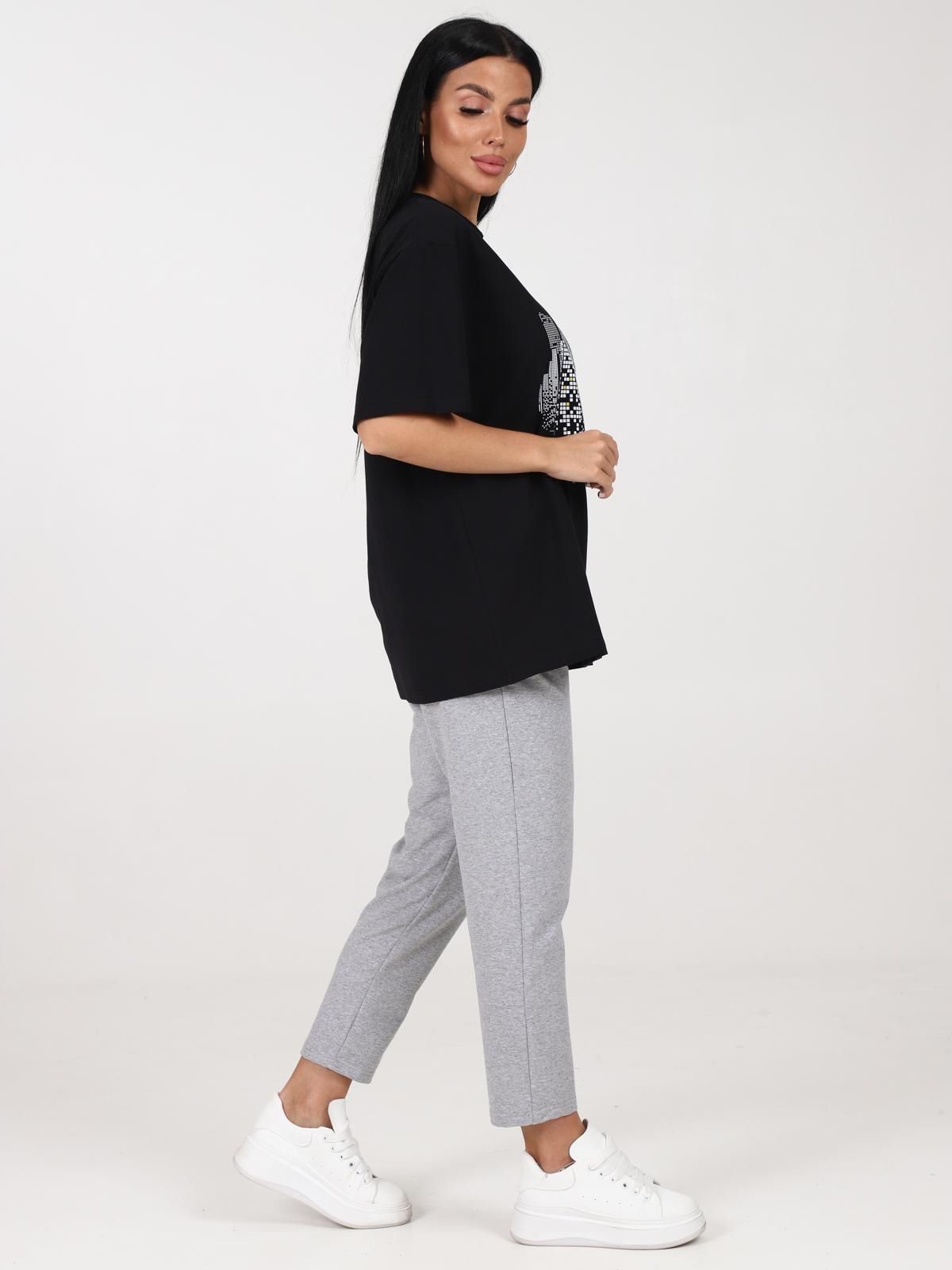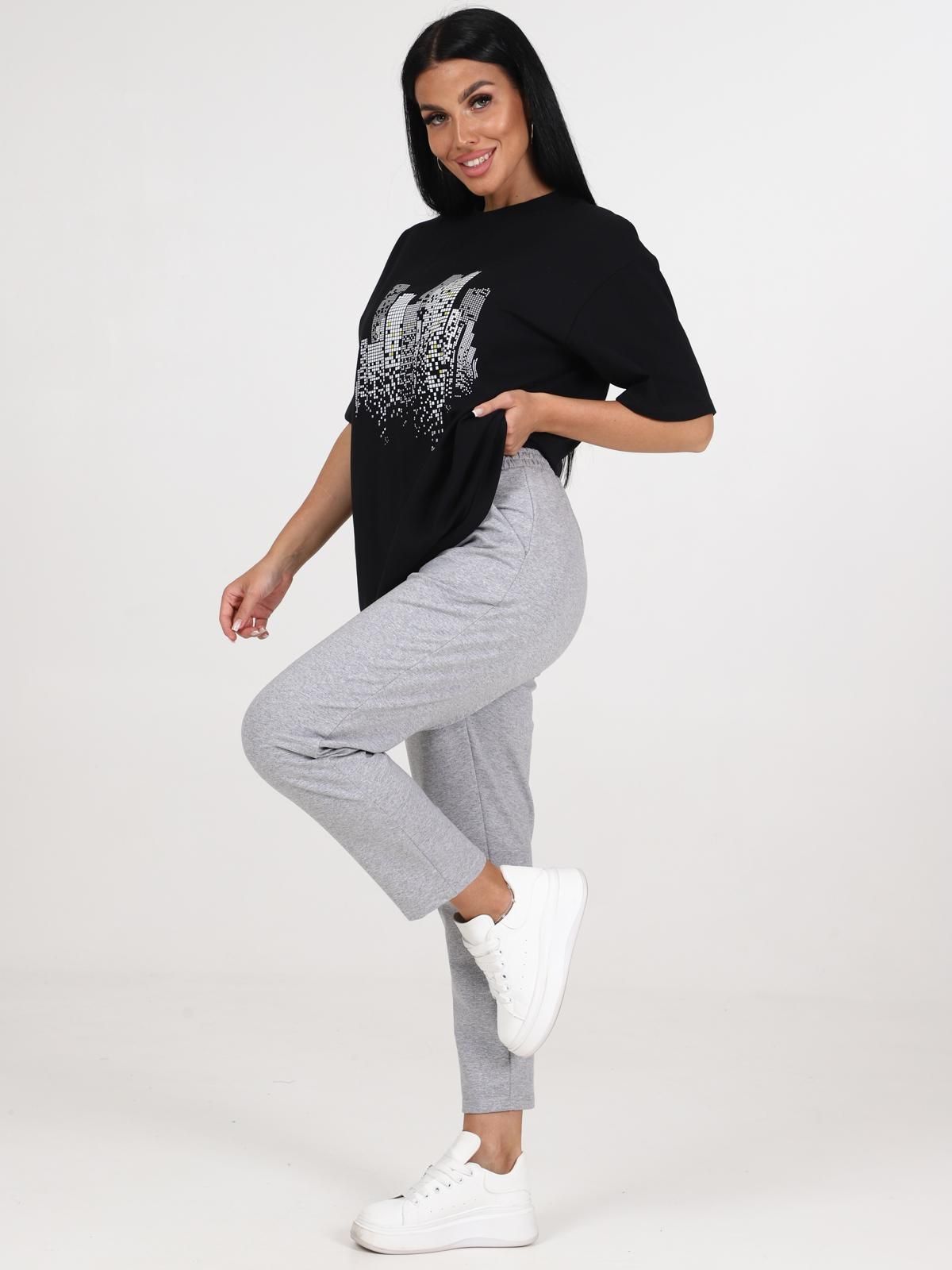 Женский костюм из свободного кроя с коротким рукавом и укороченных брюк. Особенность модели — крупный принт в виде пиксельного городского пейзажа (высотные здания) в бело-серых тонах. Силуэт оверсайз, что делает футболку удобной для повседневной носки.