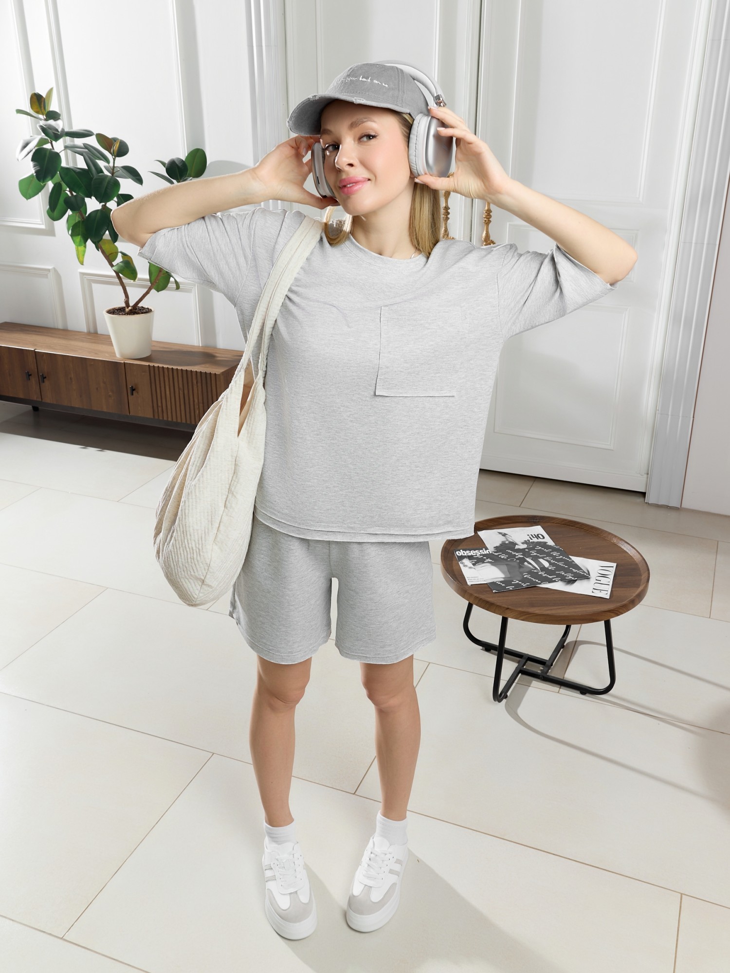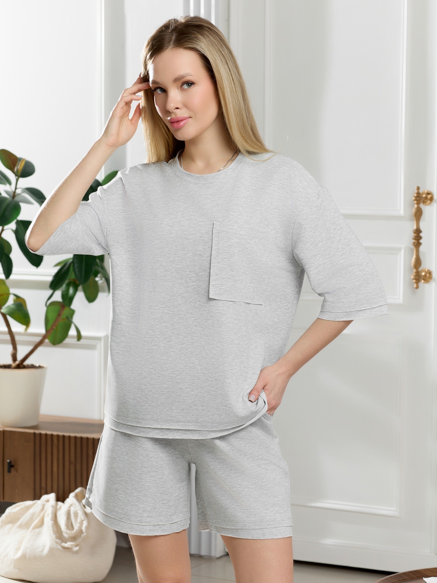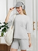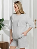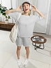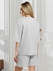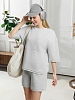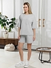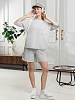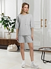 Костюм женский из гладкокрашеного трикотажного полотна "футер с вискозой", состоящий из футболки и шорт. Футболка - свободного покроя, с горловиной овальной формы, обработанной втачной планкой из основного материала, спущенной линией плеча, короткими втачными рукавами, с нагрудным карманом, настроченным на полочку. Нижние срезы рукавов и изделия выполнены без подгибки с имитацией второго слоя. Шорты – средней длины, свободные, на притачном поясе с эластичной тесьмой внутри, карманами в боковых швах. Нижние срезы шорт без подгибки с имитацией второго слоя.