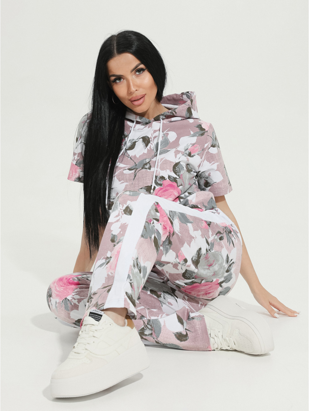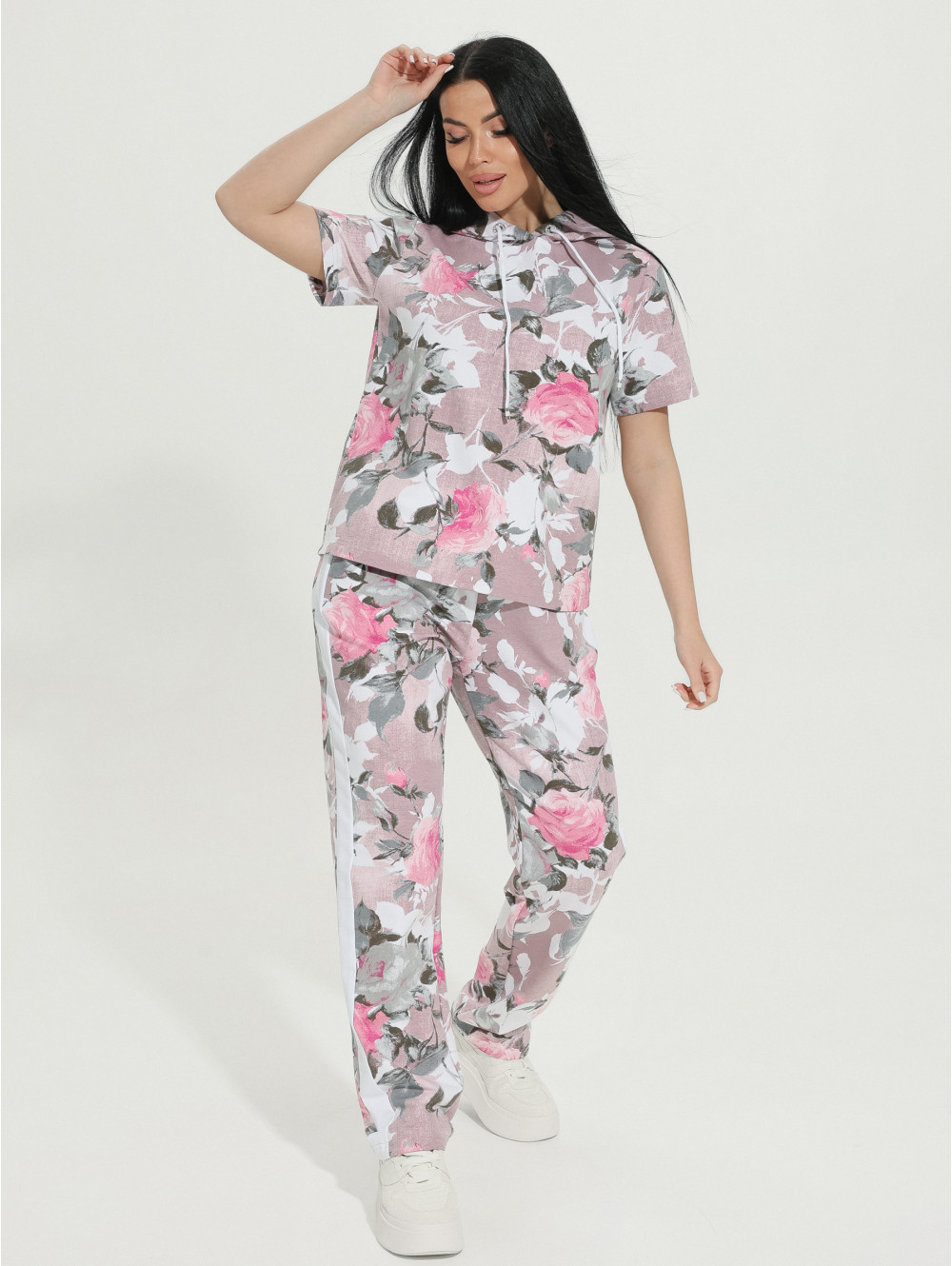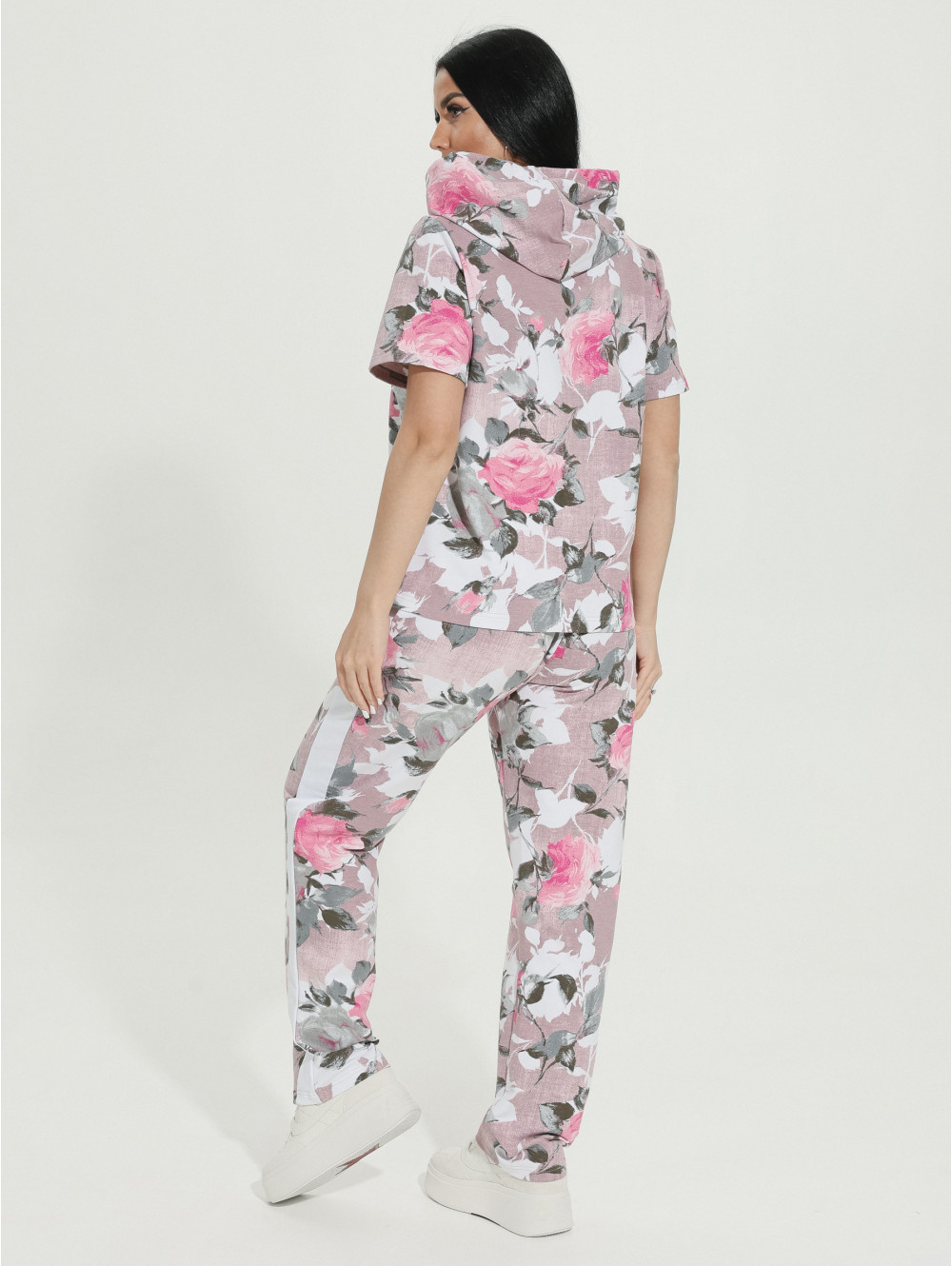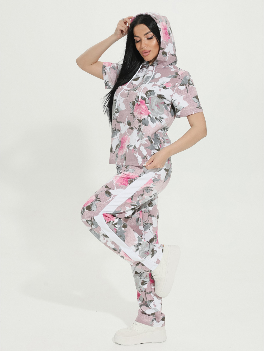 Представляем Вам наш костюм ТИЕНА, состоящий из кофты и брюк с карманами. Кофта с капюшоном, край которого стягивает декоративный шнурок. Рукав короткий. Дополнением к образу служат лампасы. Изделие изготовлено из футера с лайкрой. Красивый рисунок на ткани служит украшением изделия. Футер является натуральной тканью: он изготавливается из хлопка. Благодаря этому, ткань позволяет коже «дышать». Футер хорошо впитывает влагу и при этом остается гипоаллергенным. Благодаря эластичной нити костюм надолго сохранит форму.