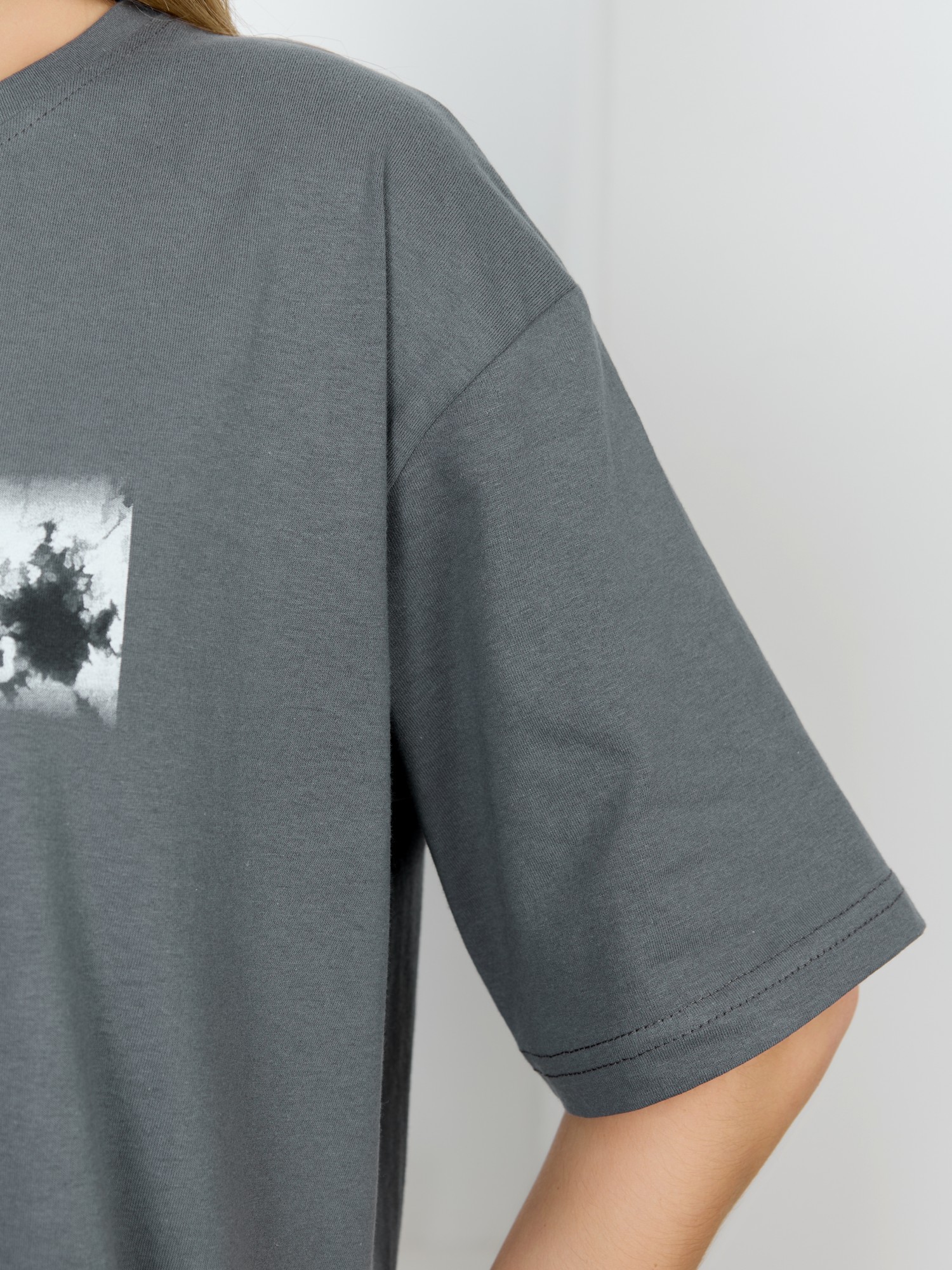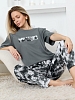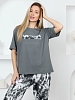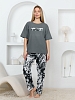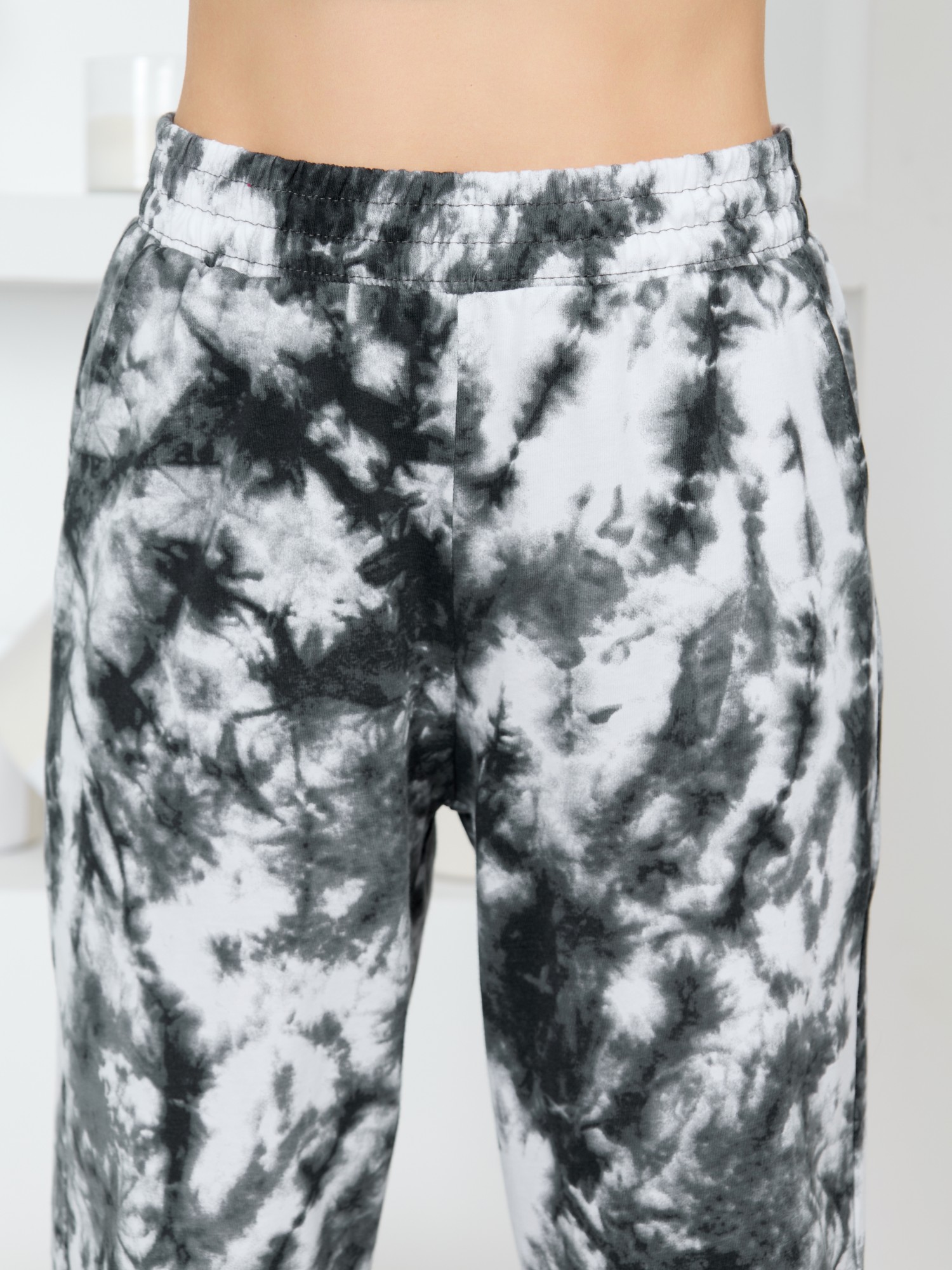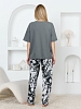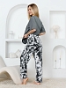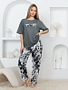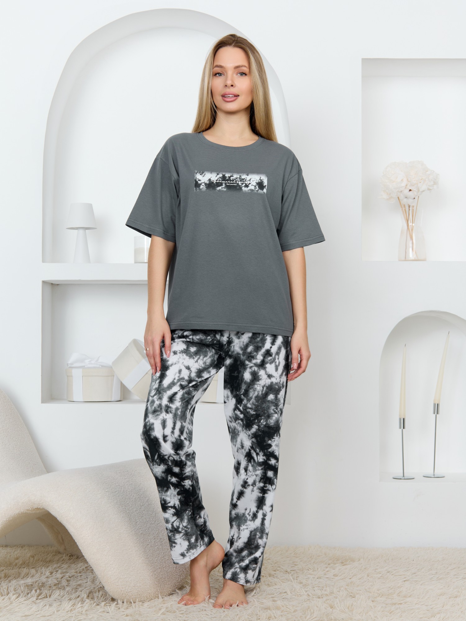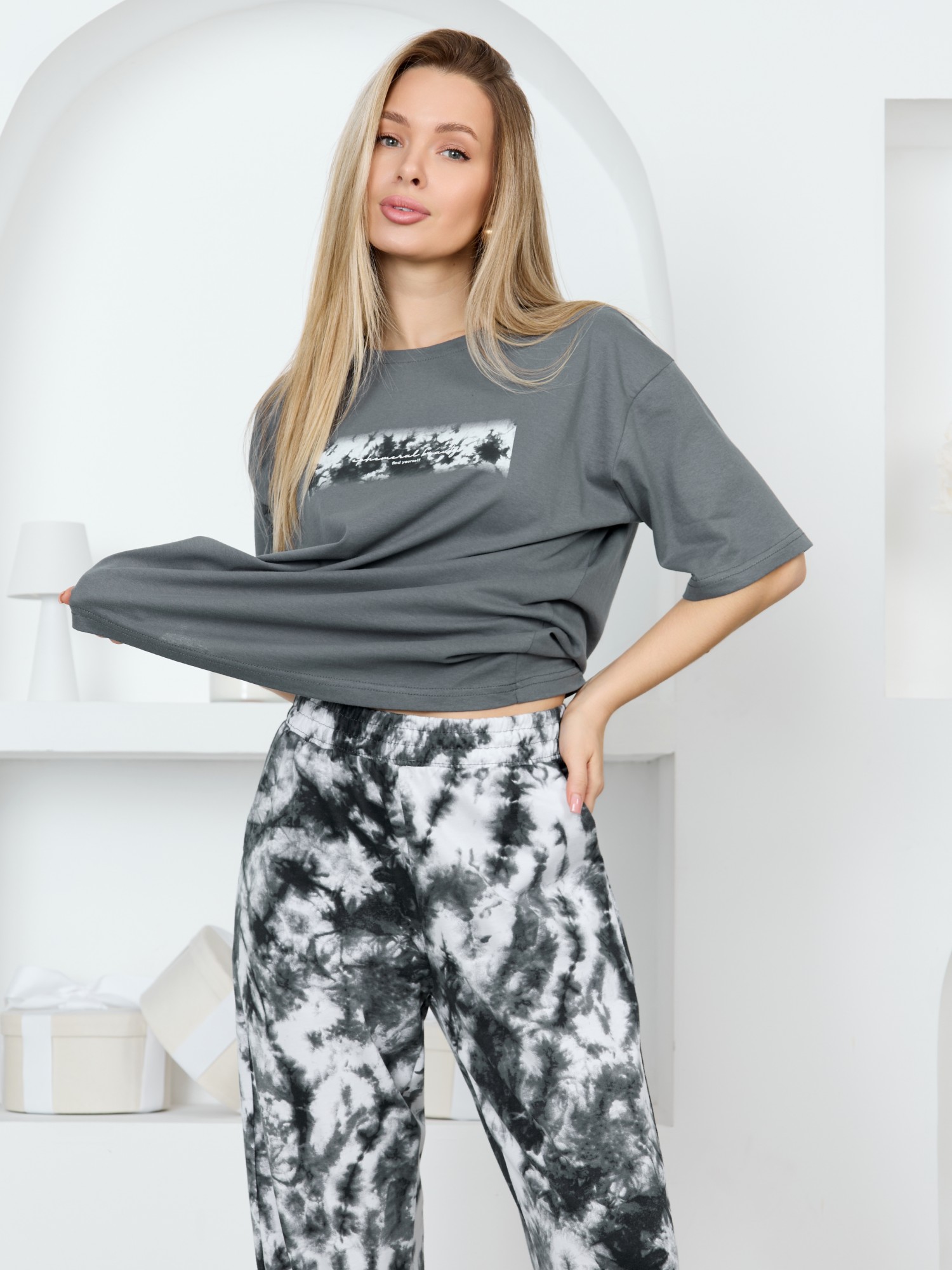 Костюм молодежный из трикотажного полотна «кулирка» в сочетании двух видов тканей гладкокрашеной и с набивным рисунком, состоящий из футболки и брюк.Футболка – свободного покроя из гладкокрашеного полотна, с короткими втачными рукавами, горловиной овальной формы, обработанной притачной бейкой, выполненным в технике «шелкографии».Брюки - из полотна с набивным рисунком, прямые, длинные, с карманами в боковых швах, на притачном поясе с эластичной тесьмой внутри.