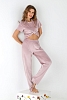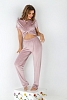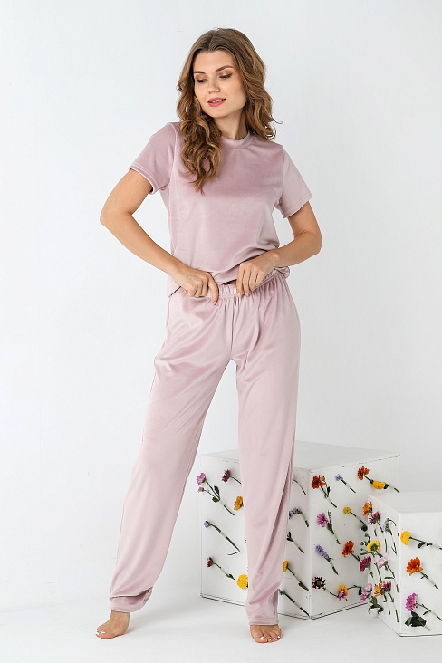Костюм молодежный из трикотажного полотна «велюр-стрейч», состоящий из футболки и брюк. Футболка - классического покроя, с короткими втачными рукавами и горловиной овальной формы, обработанной втачной бейкой. Брюки – длинные, свободного покроя, с эластичной тесьмой по талии.