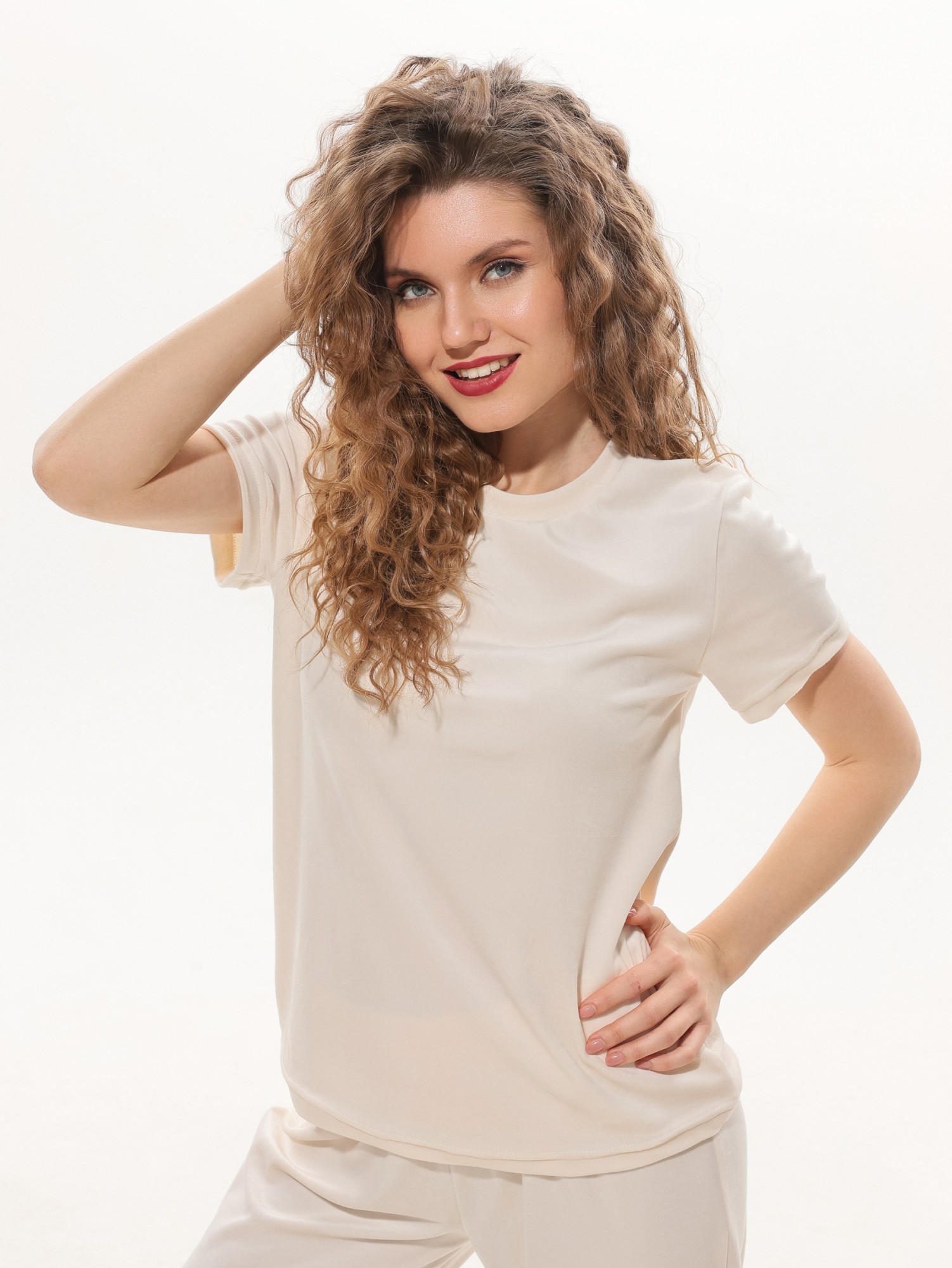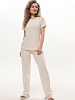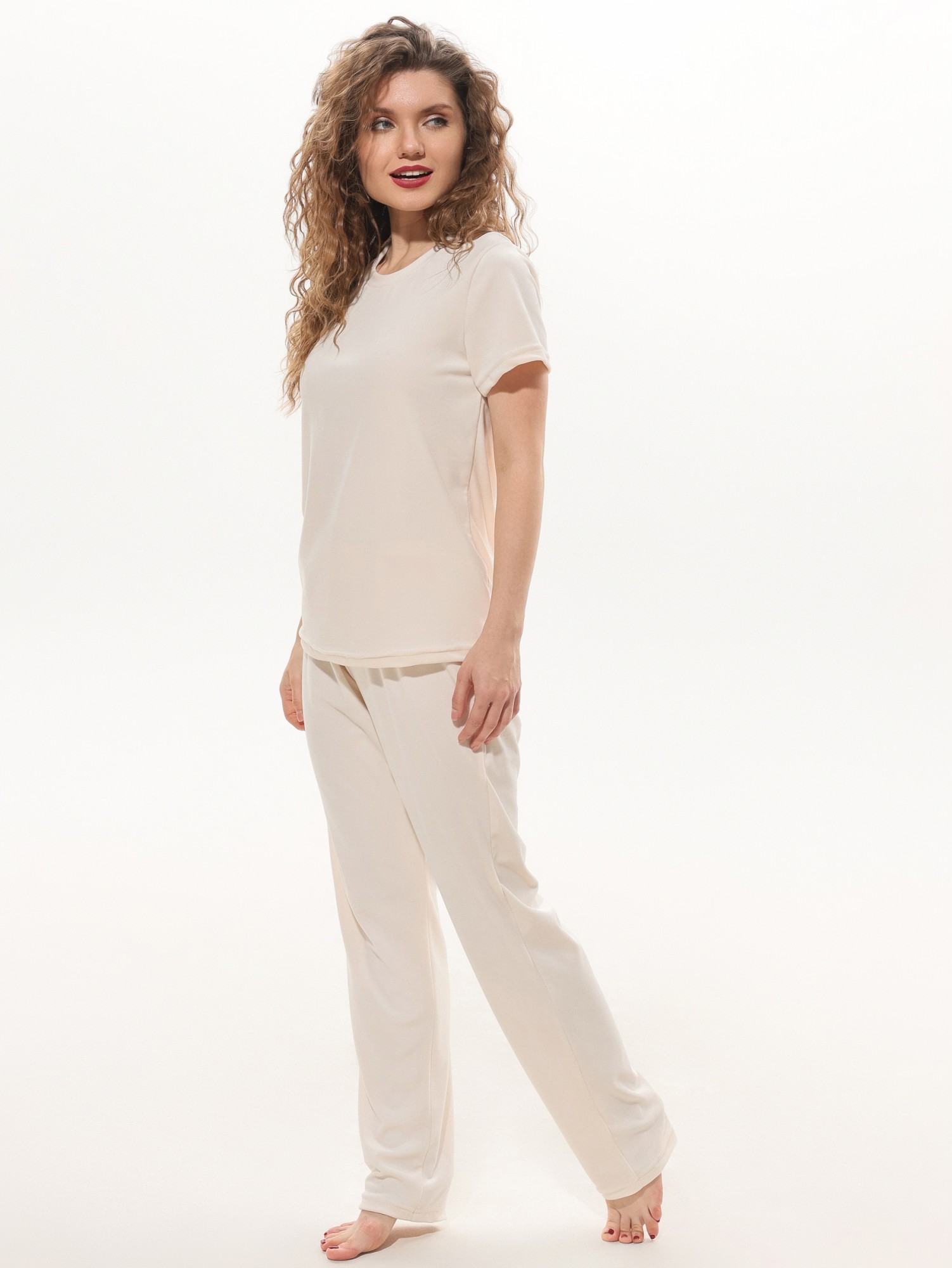 Костюм молодежный из трикотажного полотна «велюр-стрейч», состоящий из футболки и брюк. Футболка - классического покроя, с короткими втачными рукавами и горловиной овальной формы, обработанной втачной бейкой. Брюки – длинные, свободного покроя, с эластичной тесьмой по талии.