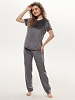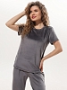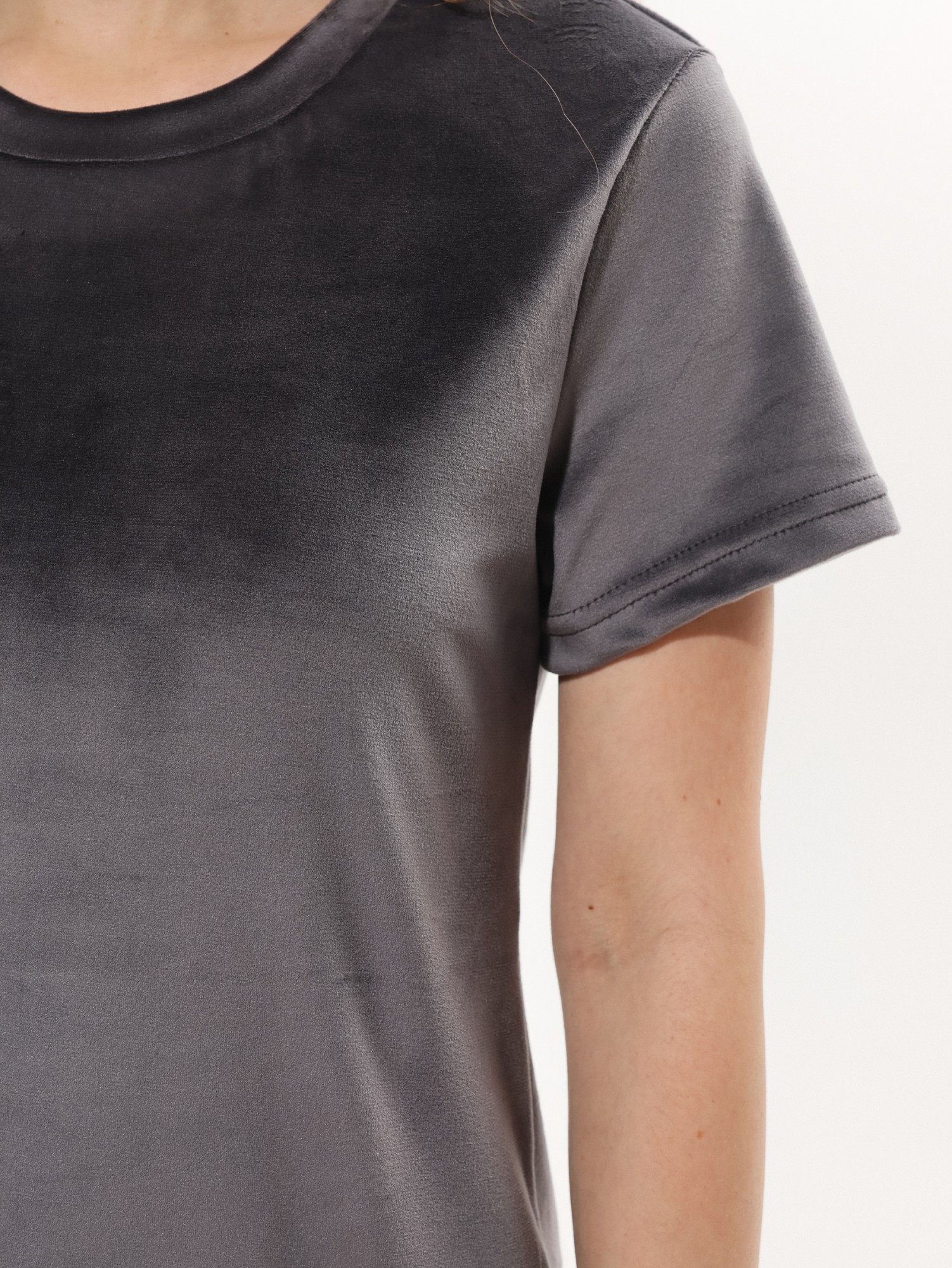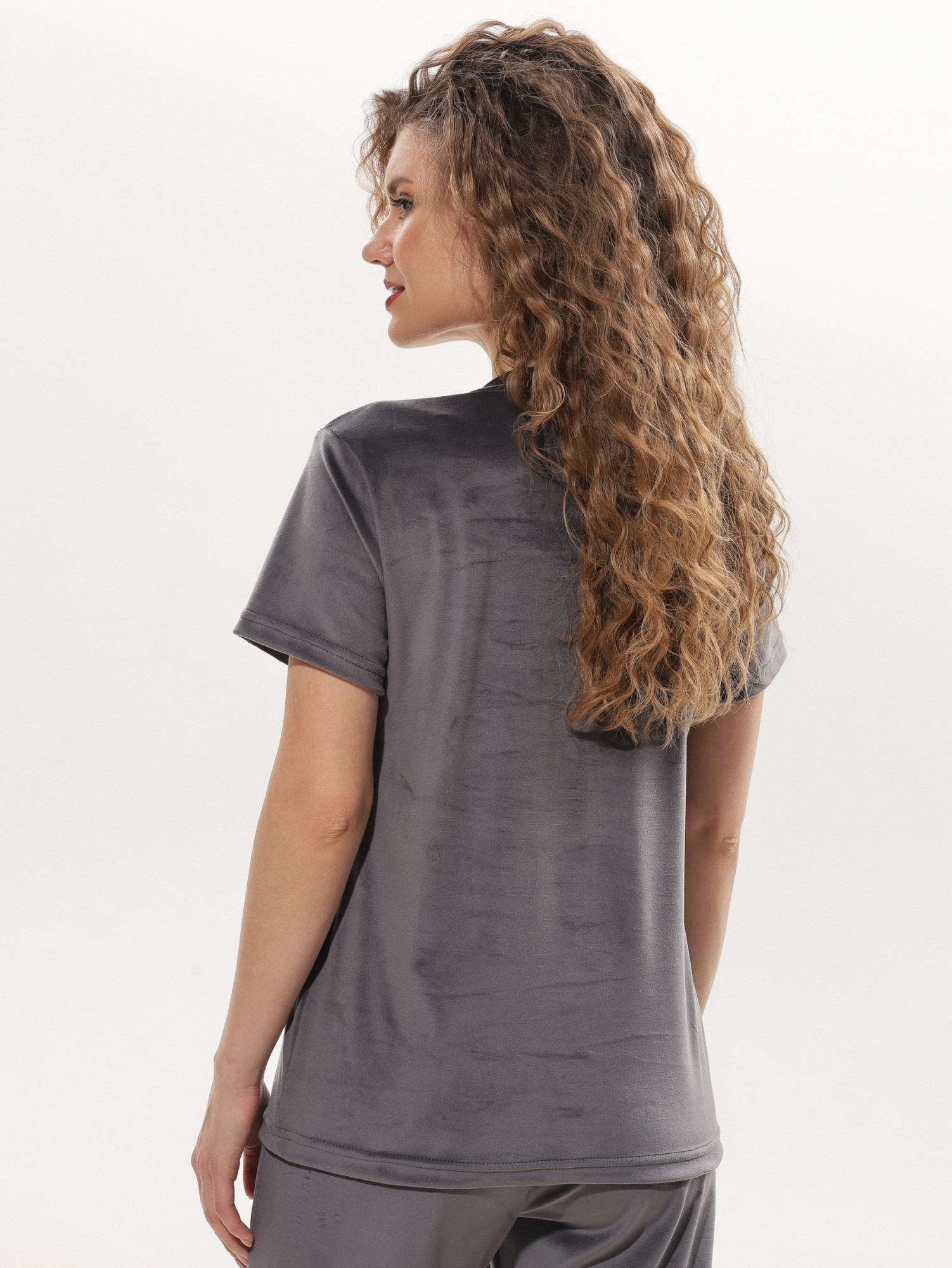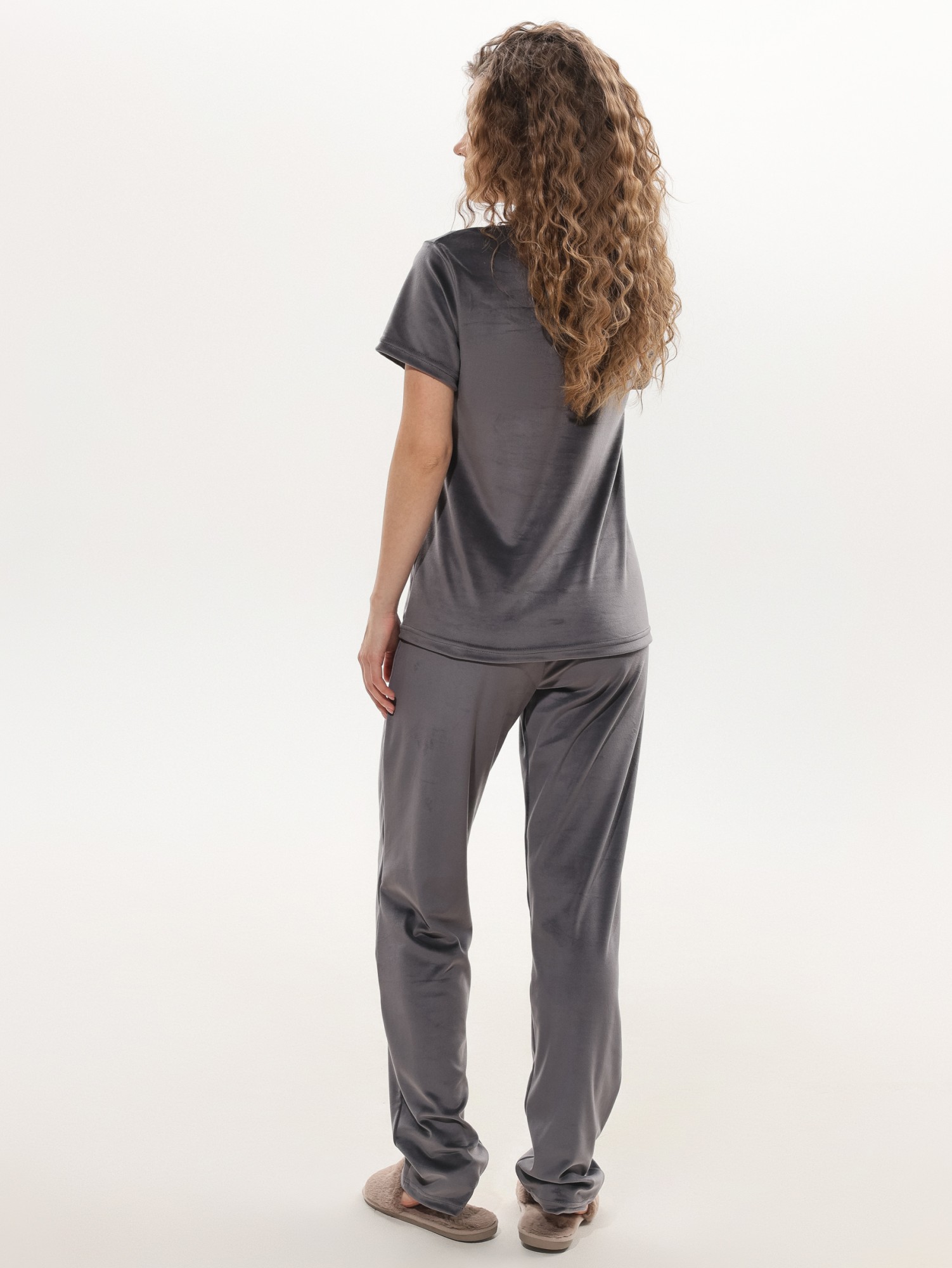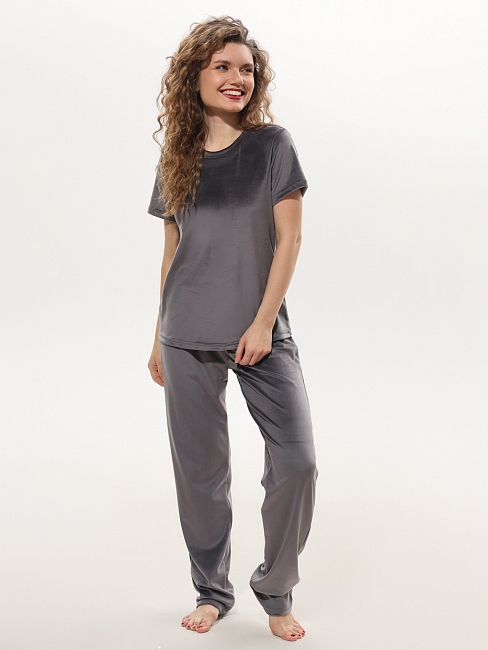 Костюм молодежный из трикотажного полотна «велюр-стрейч», состоящий из футболки и брюк. Футболка - классического покроя, с короткими втачными рукавами и горловиной овальной формы, обработанной втачной бейкой. Брюки – длинные, свободного покроя, с эластичной тесьмой по талии.